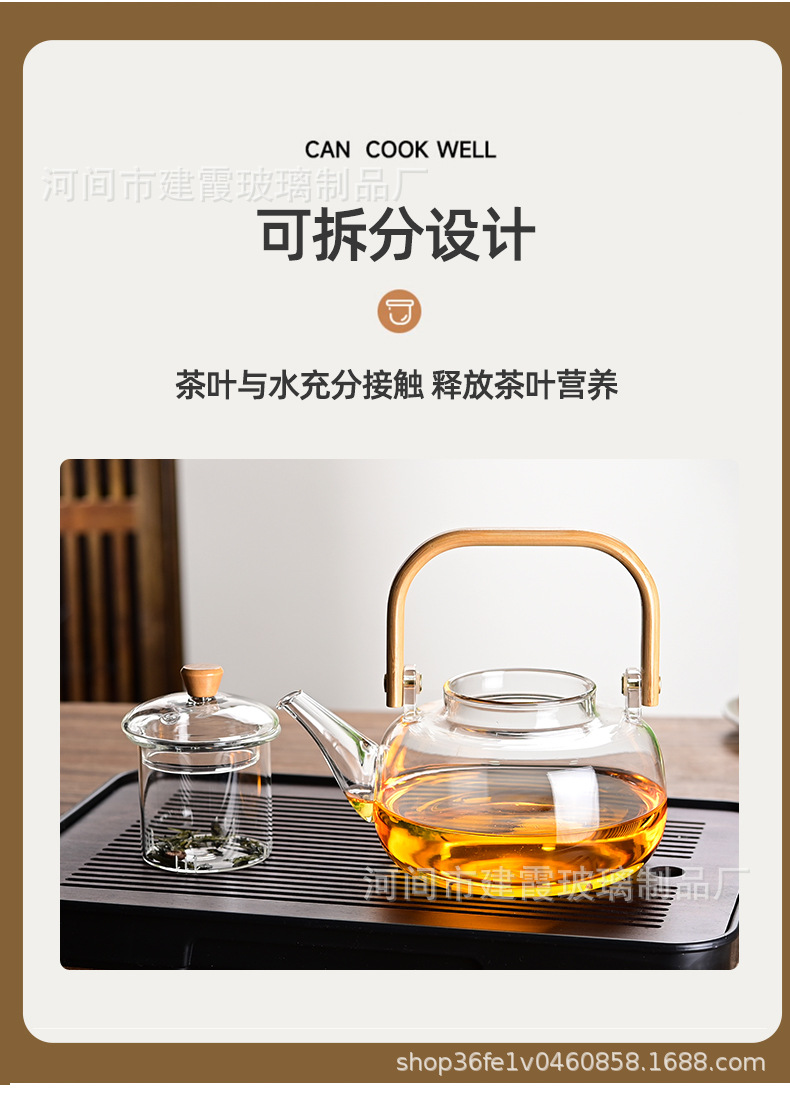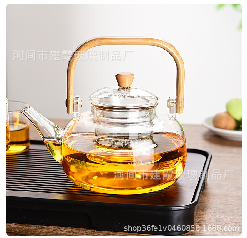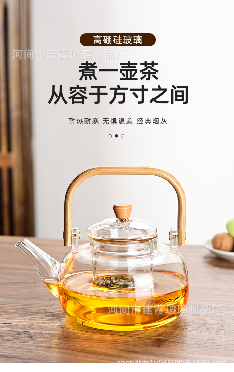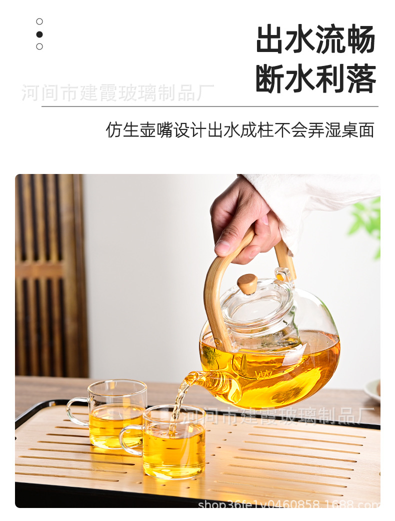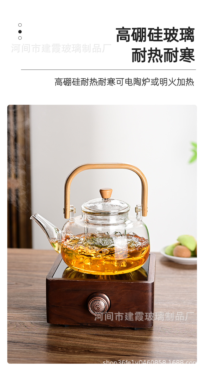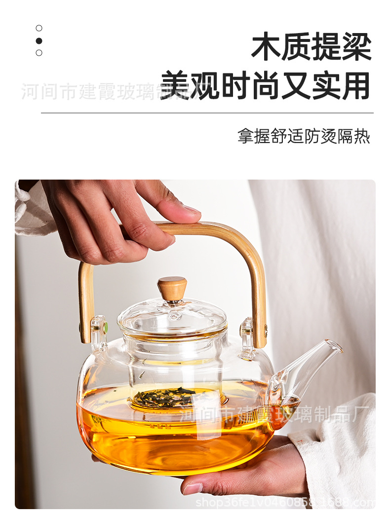 新中式围炉煮茶竹木提梁壶高硼硅玻璃可明火茶水分离玻璃提梁茶壶