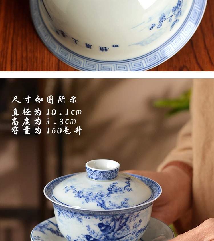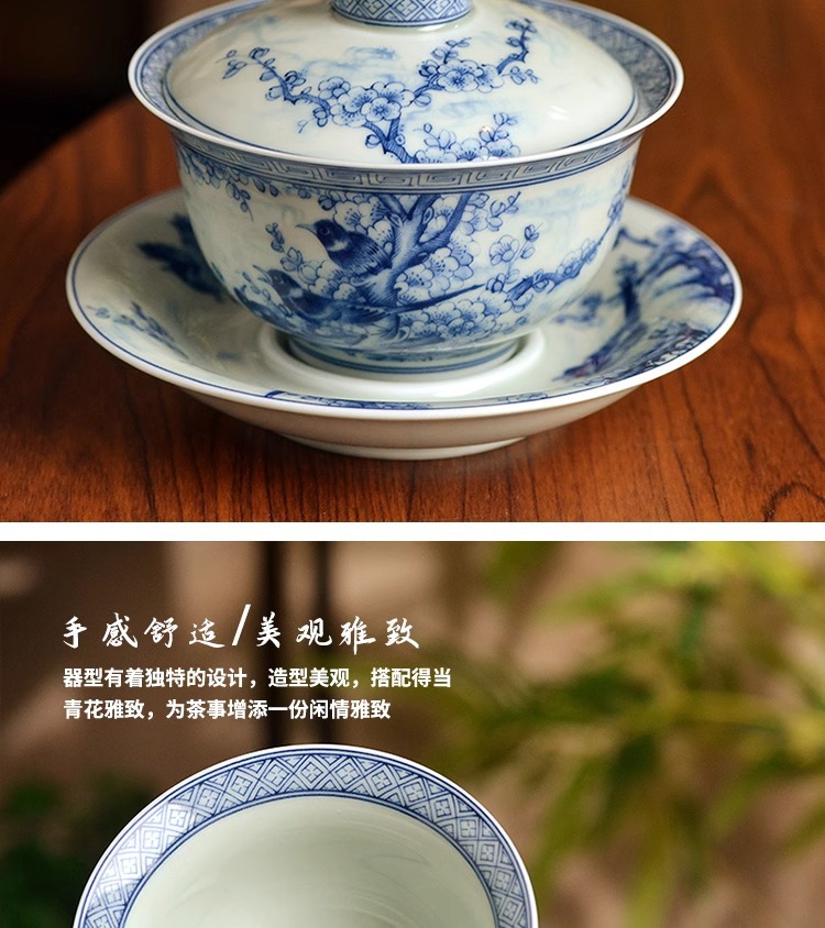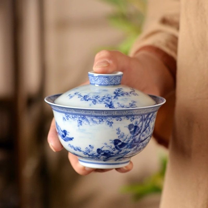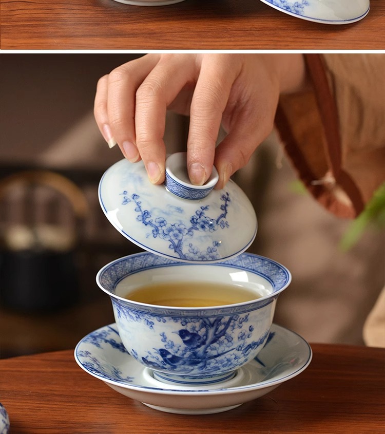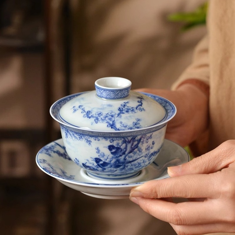 景德镇青花喜上眉梢天地人三才盖碗不烫手泡茶碗家用陶瓷功夫套装