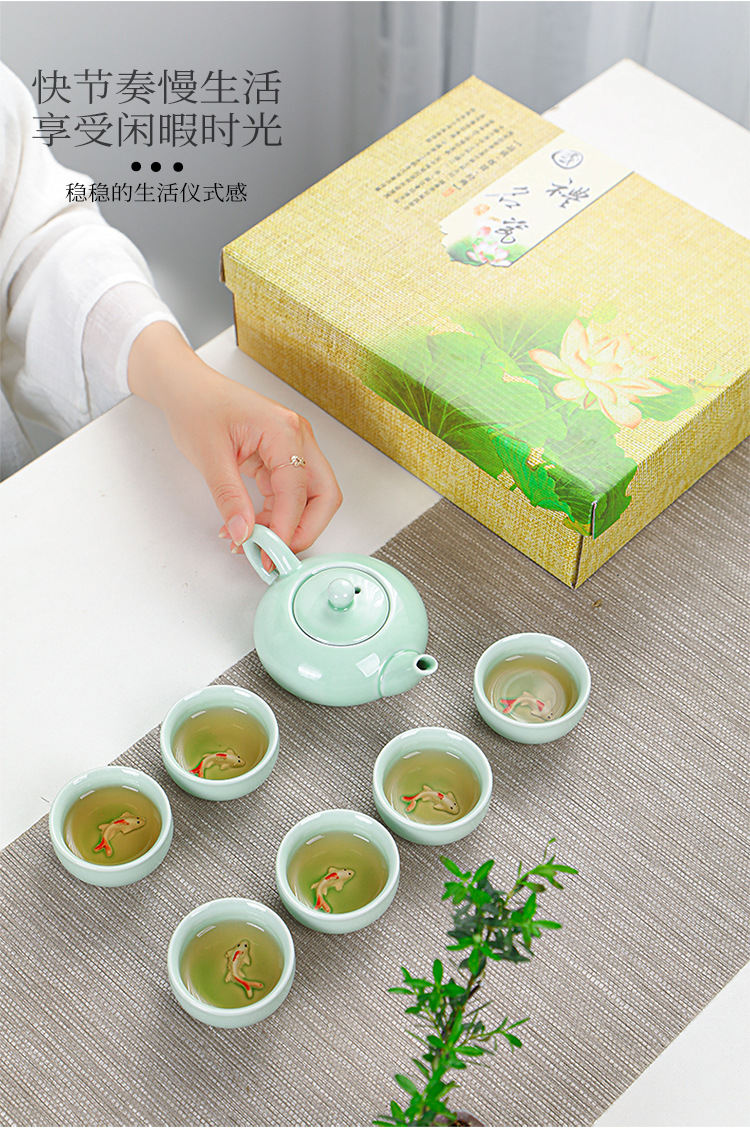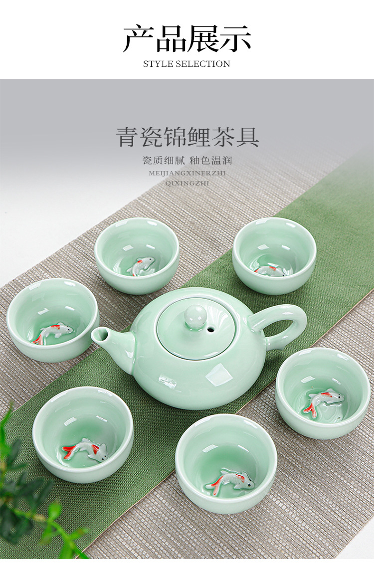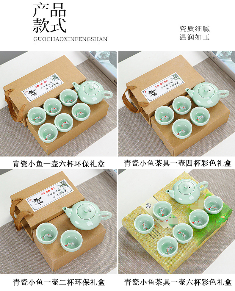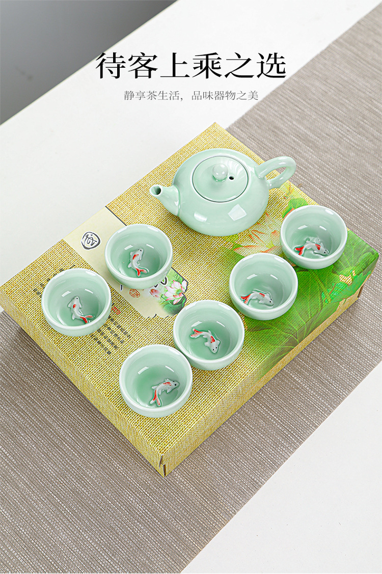 7头功夫茶具小德化青瓷茶具鲤鱼杯陶瓷茶壶套装整套礼品工厂批发