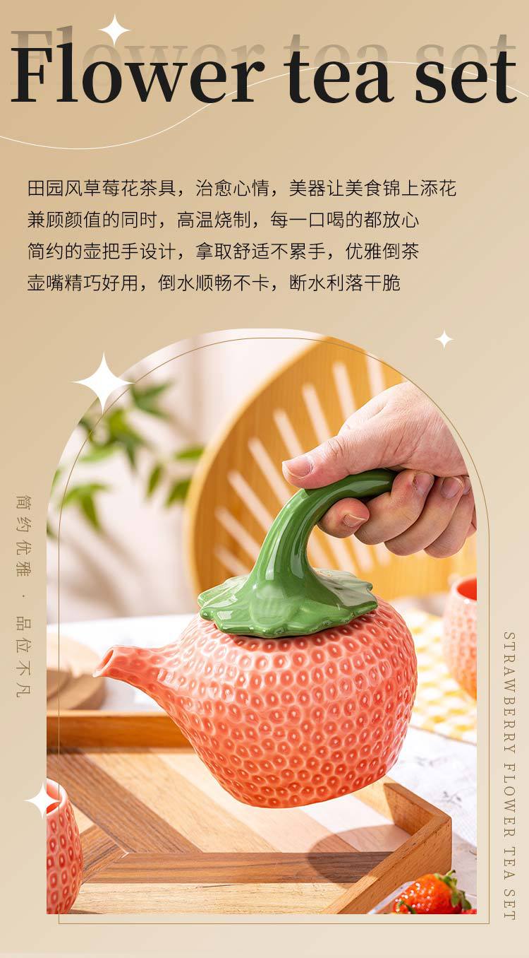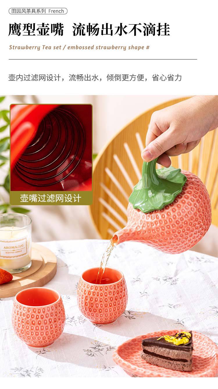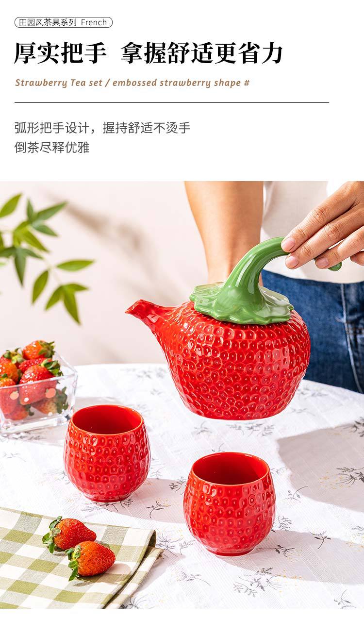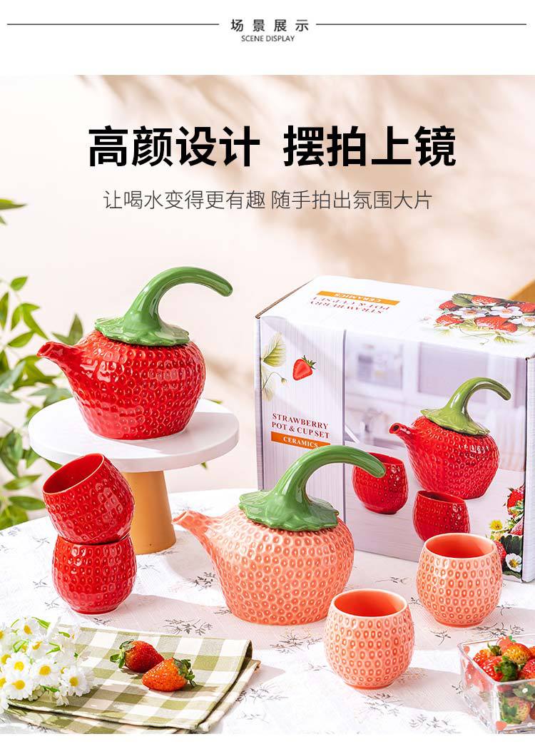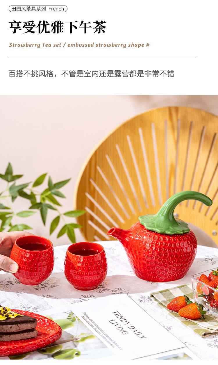 高温釉下彩茶壶套装田园风草莓下午茶茶具水杯露营派对水壶带礼盒