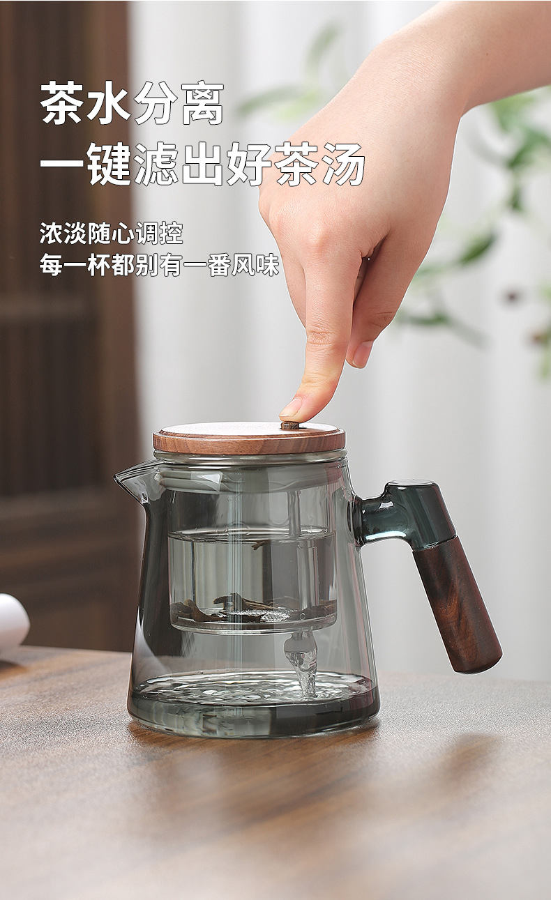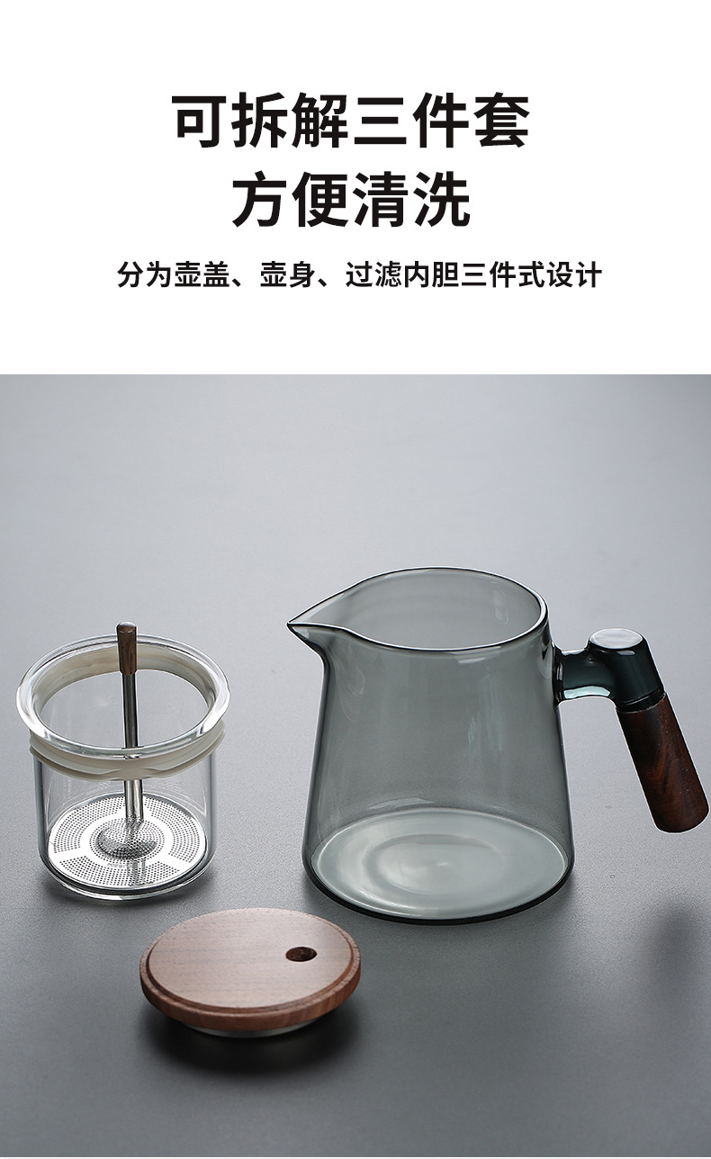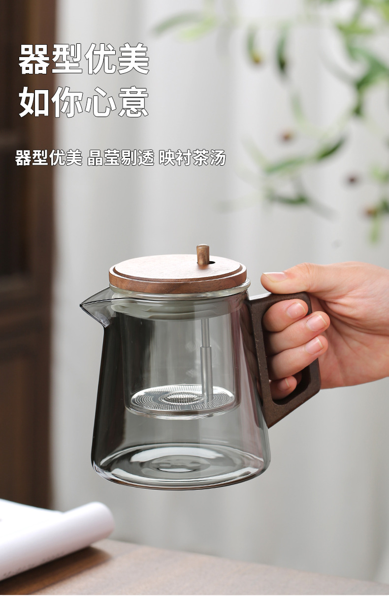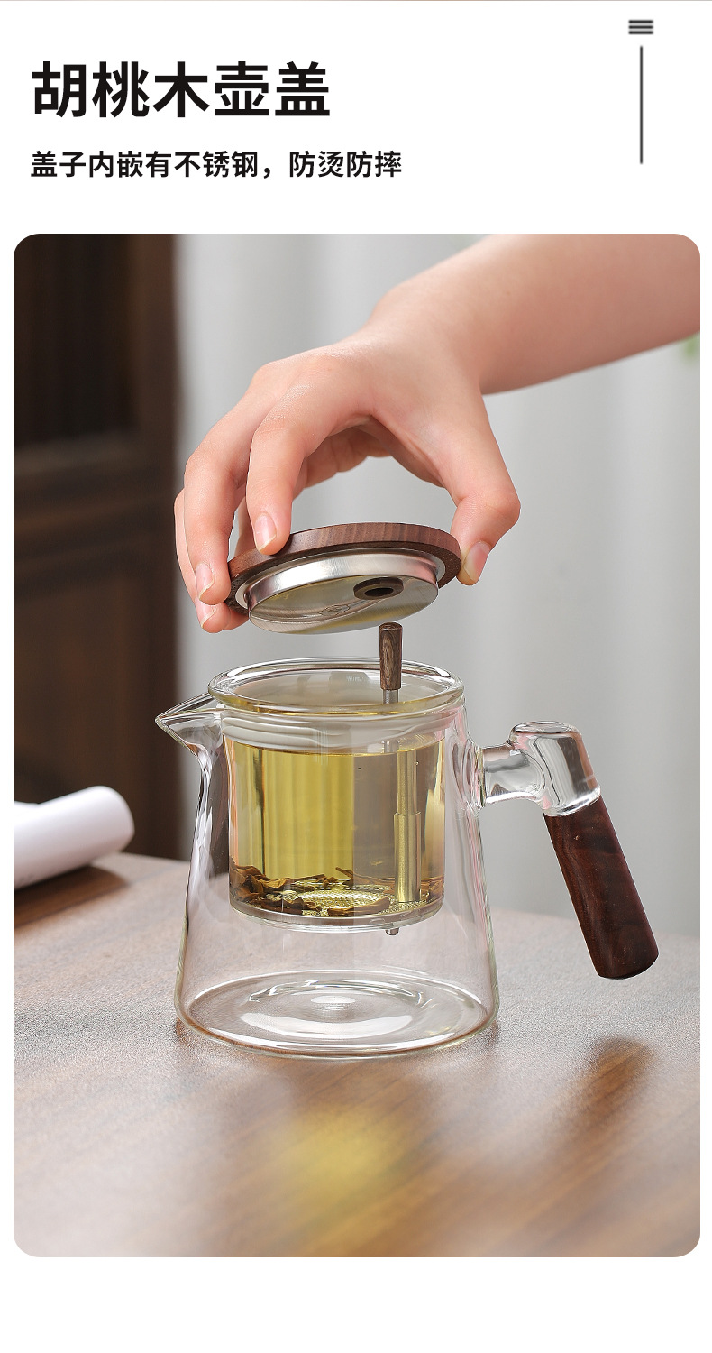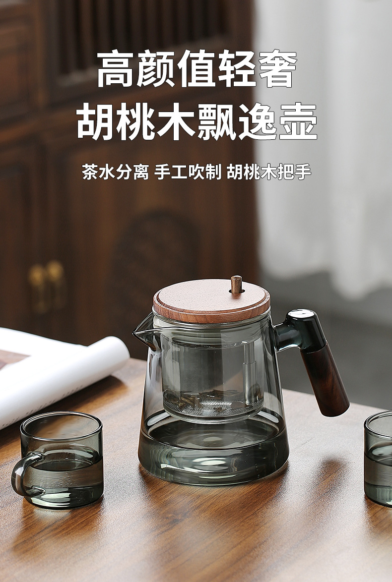 新款泡茶壶家用耐热玻璃内胆飘逸杯茶水分离泡茶壶胡桃木把手加厚