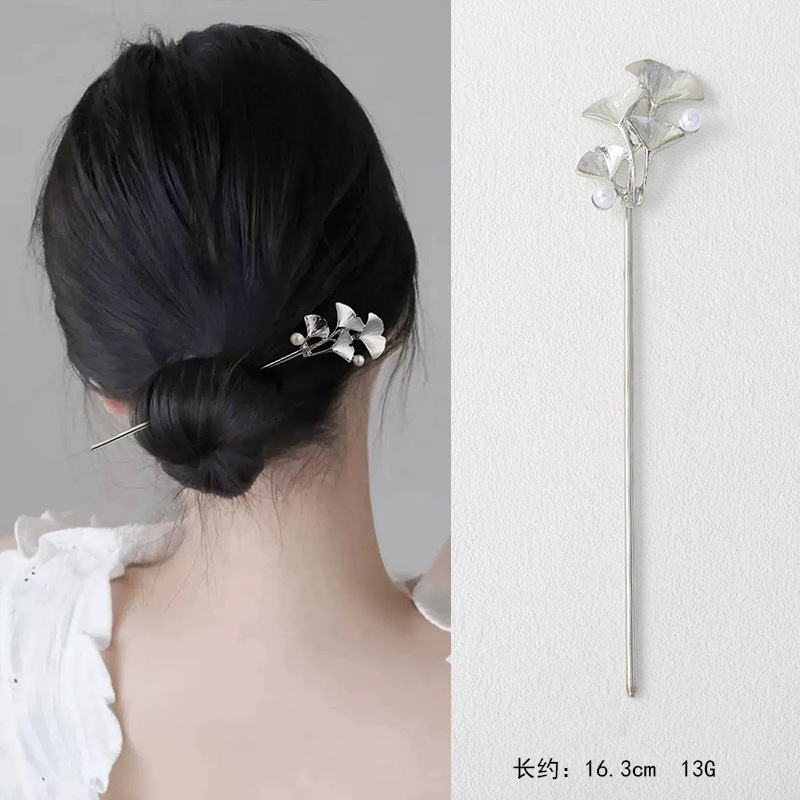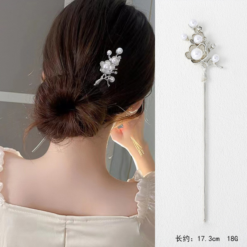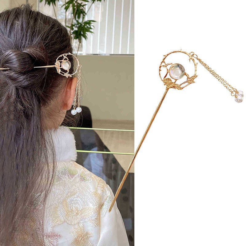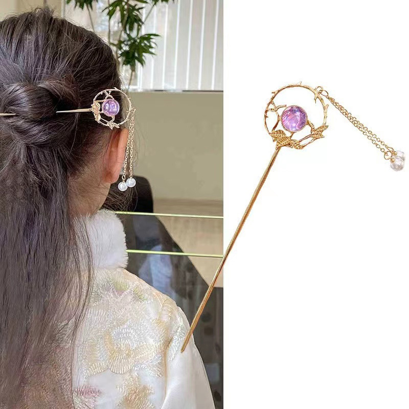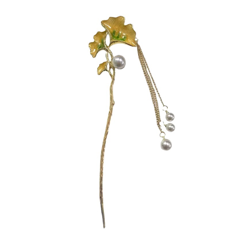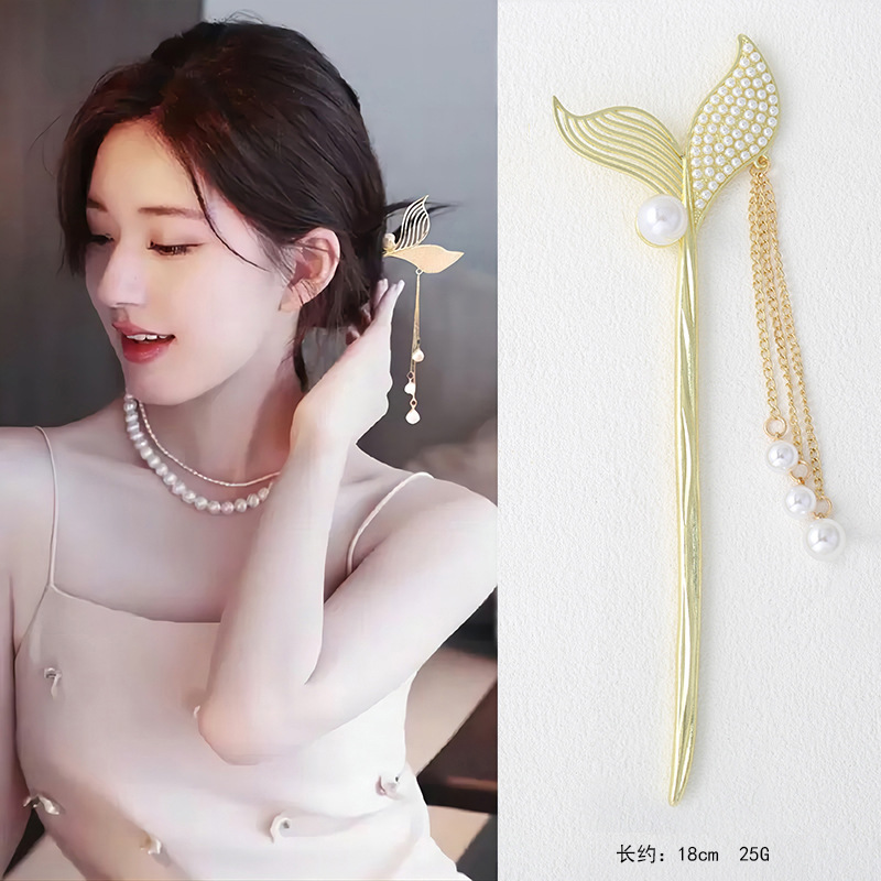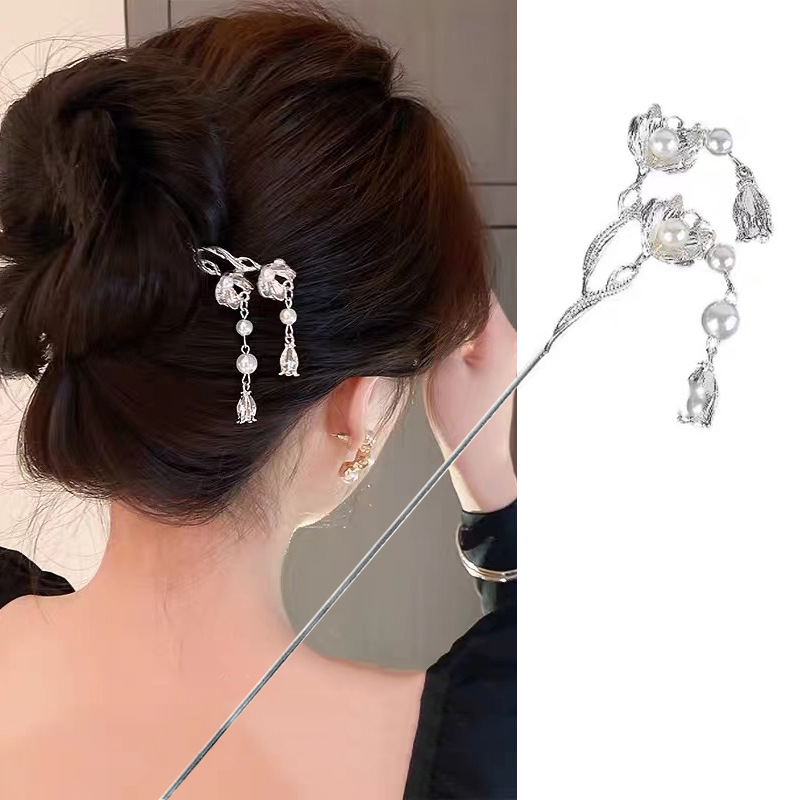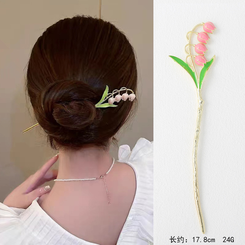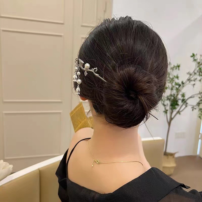 铃兰花流苏水钻鱼尾一字发簪圆球丸子头合金盘发簪子新中式发钗女