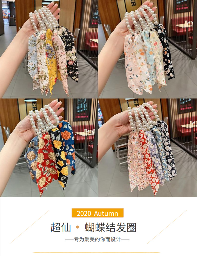 韩国新款珍珠头绳发圈碎花蝴蝶结发饰飘带发绳韩版扎马尾头饰批发