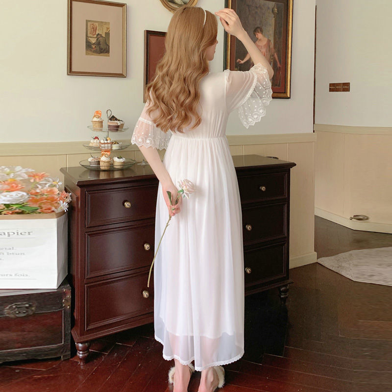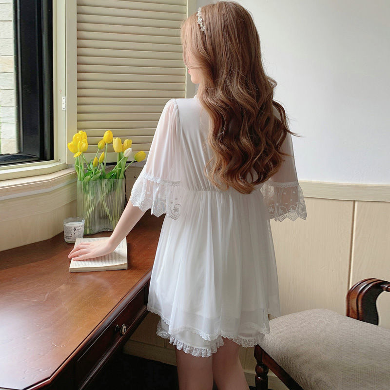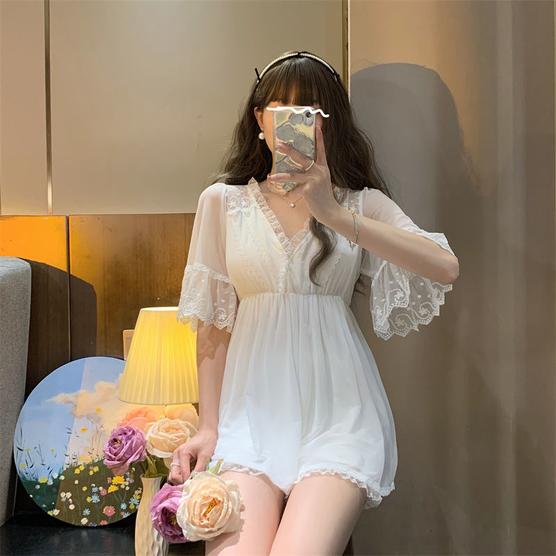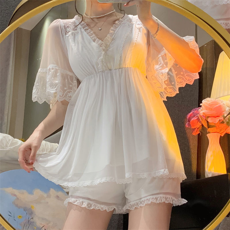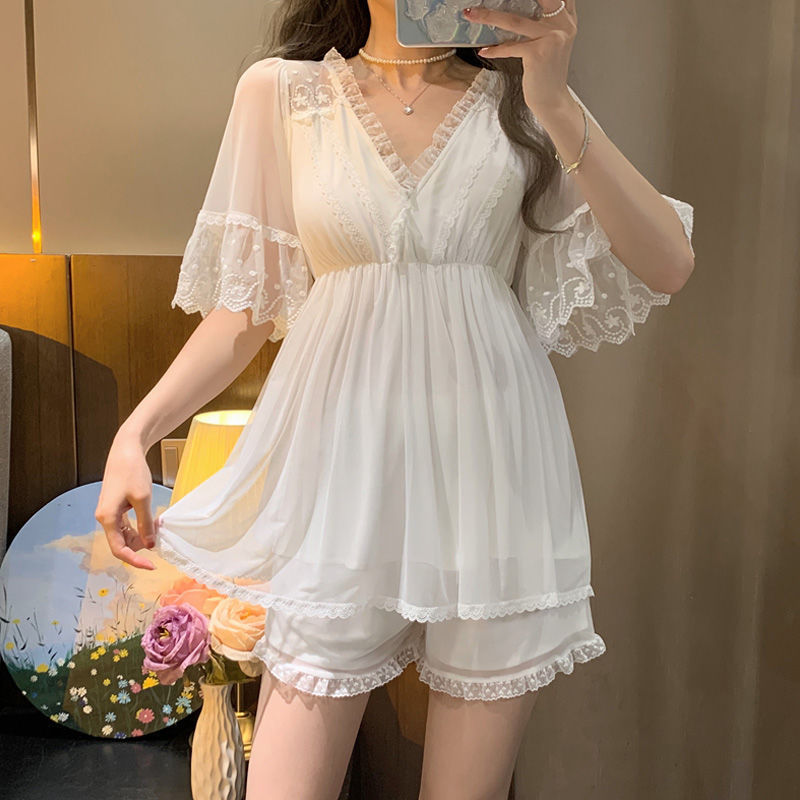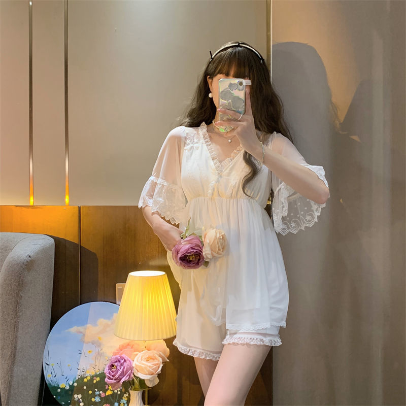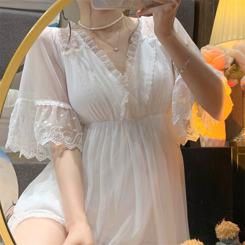 带胸垫睡衣女夏季新款宫廷公主风纯欲蕾丝网纱睡裙甜美外穿两件套