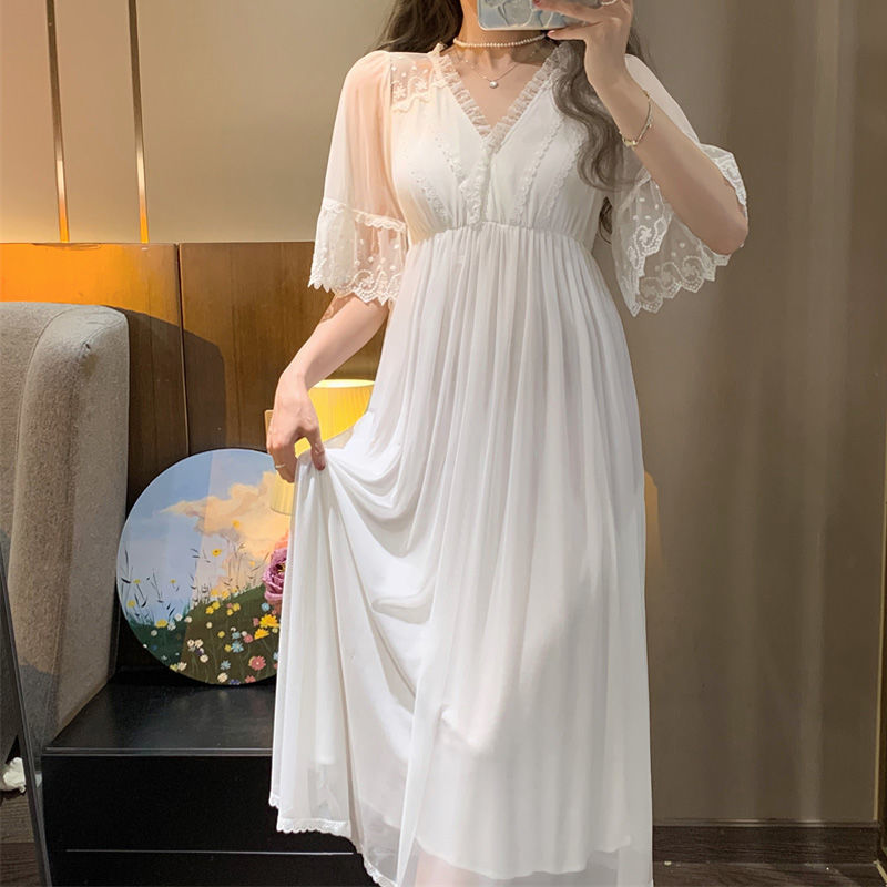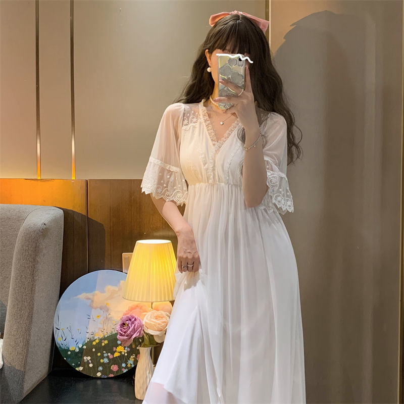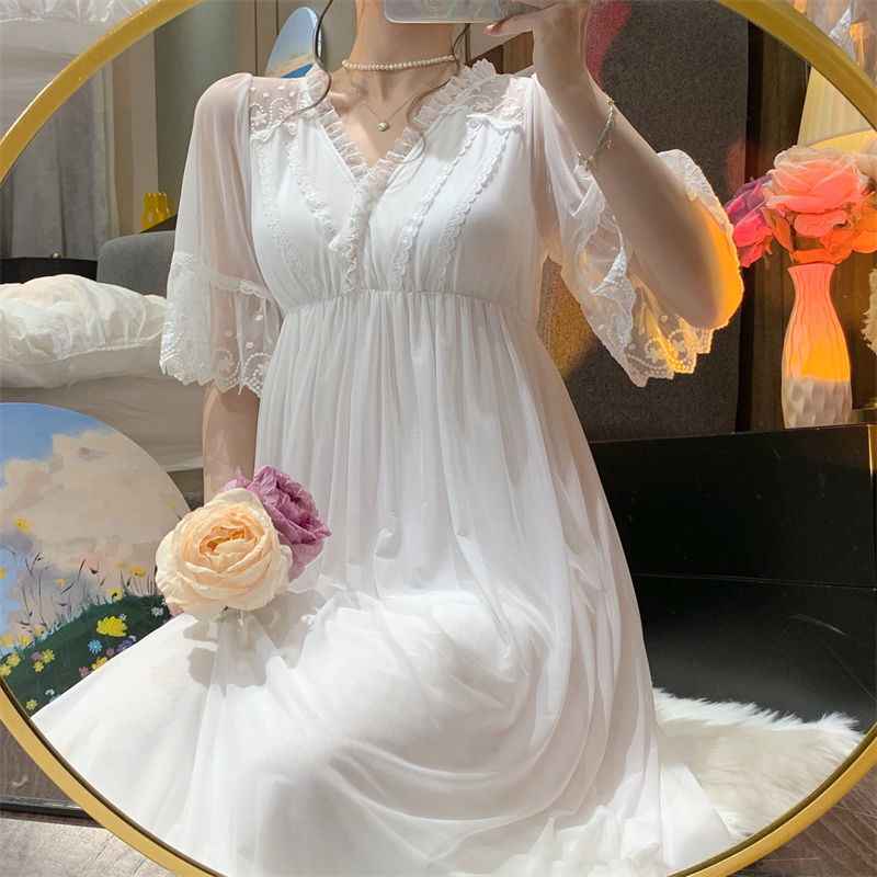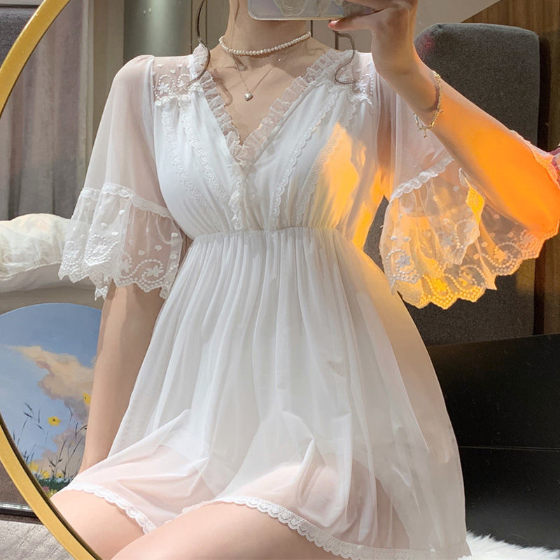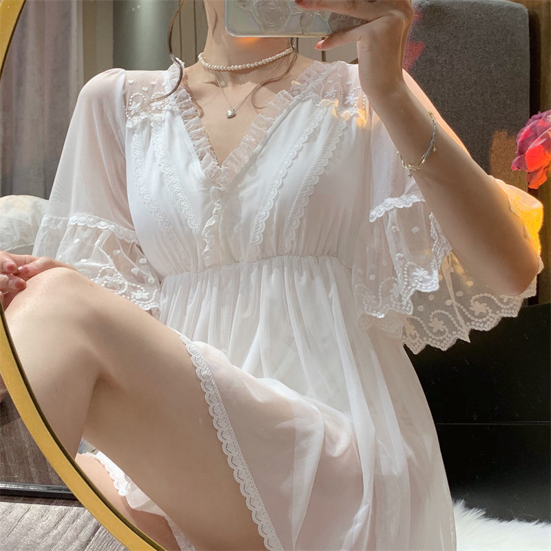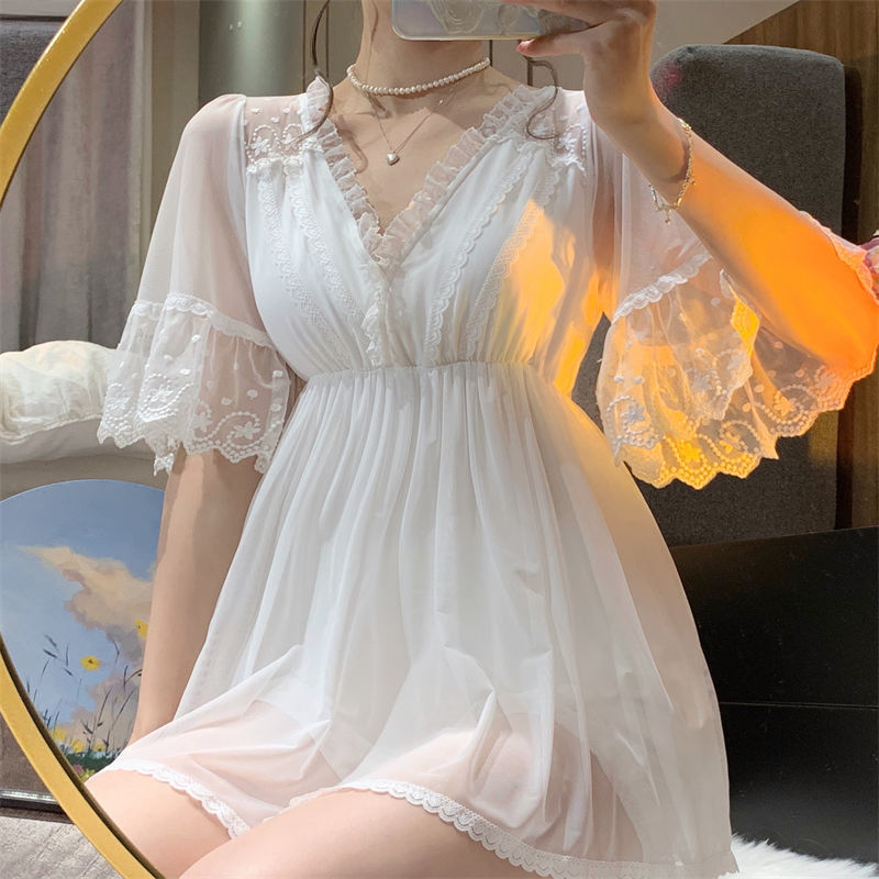 带胸垫睡衣女夏季新款宫廷公主风纯欲蕾丝网纱睡裙甜美外穿两件套