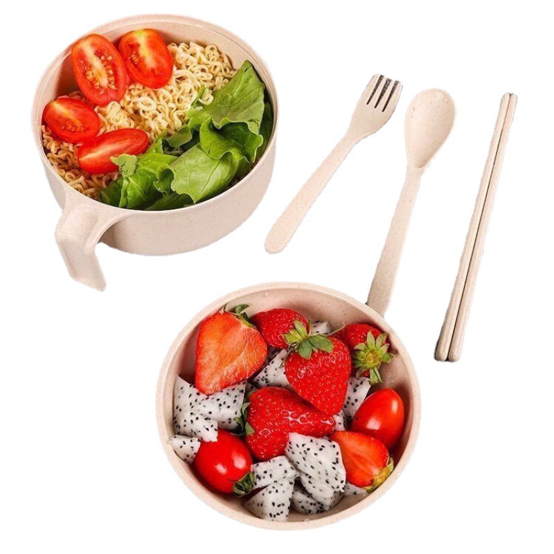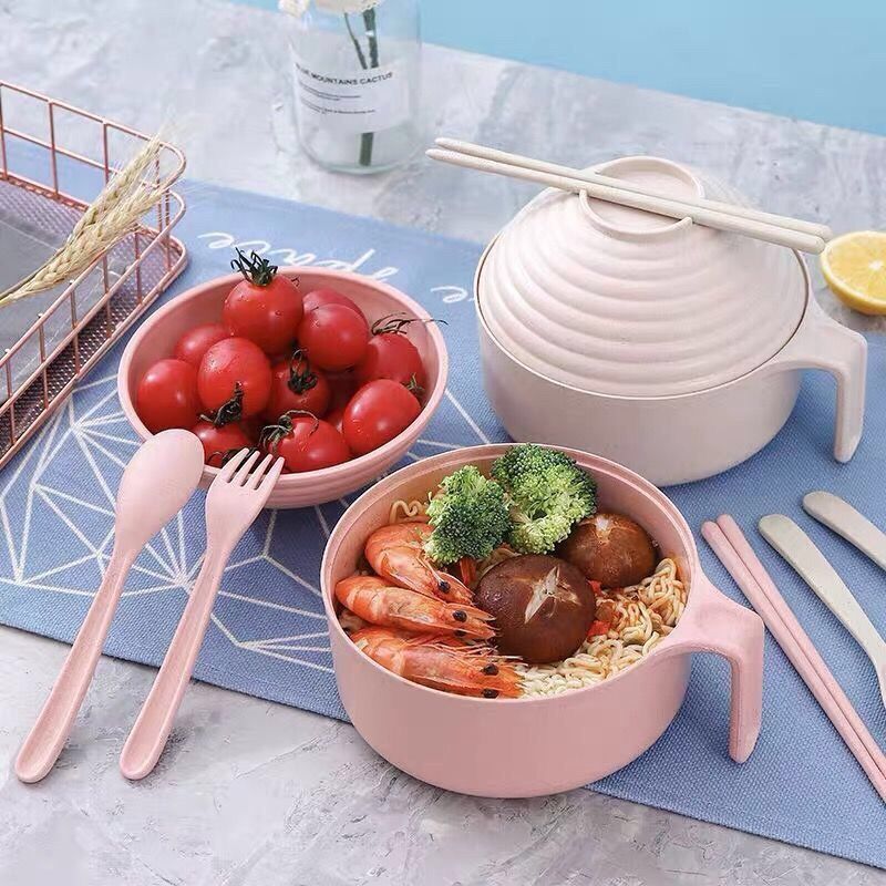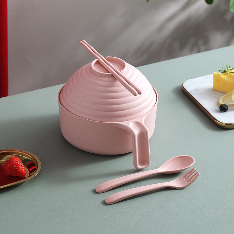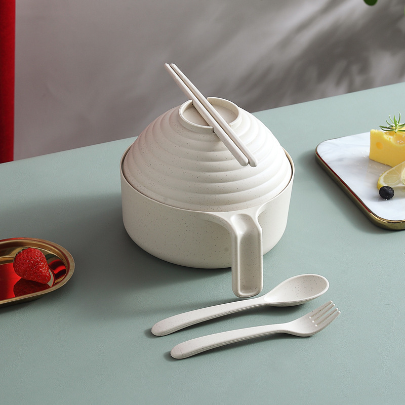 小麦秸秆带盖大容量塑料泡面碗ins 学生家用圆形碗叉勺筷礼盒套装