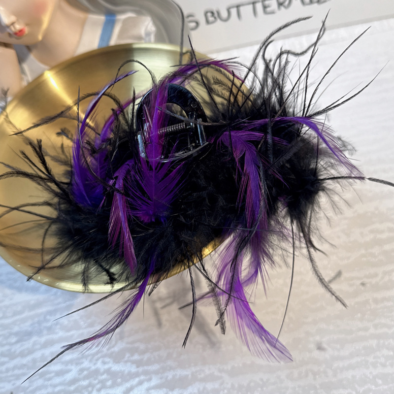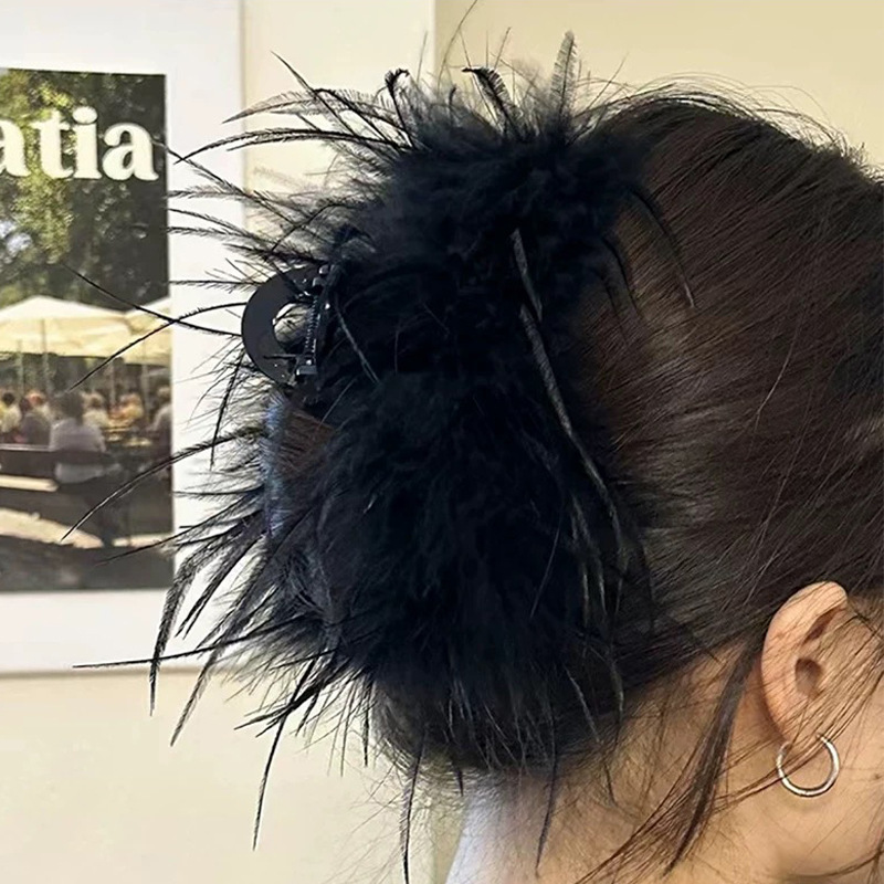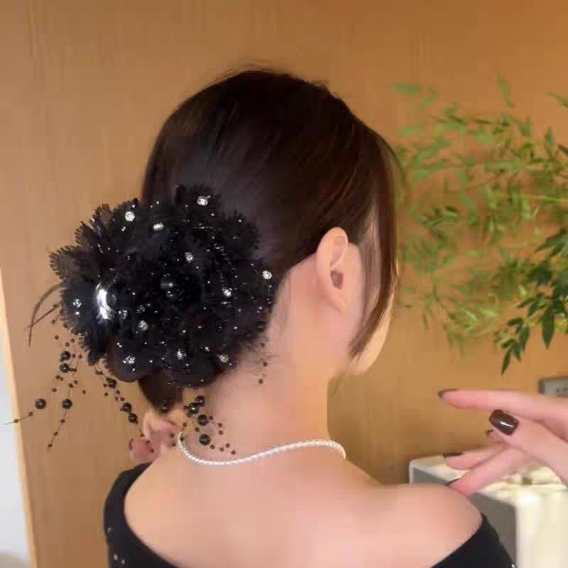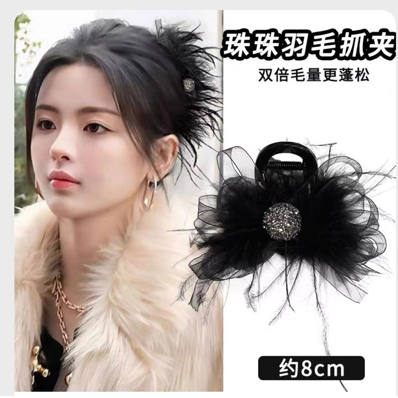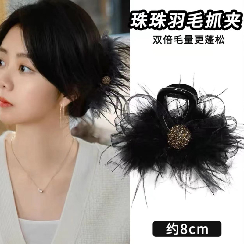 气质高级感仙气珍珠羽毛大号抓夹女后脑勺盘发鲨鱼夹百搭毛毛发夹