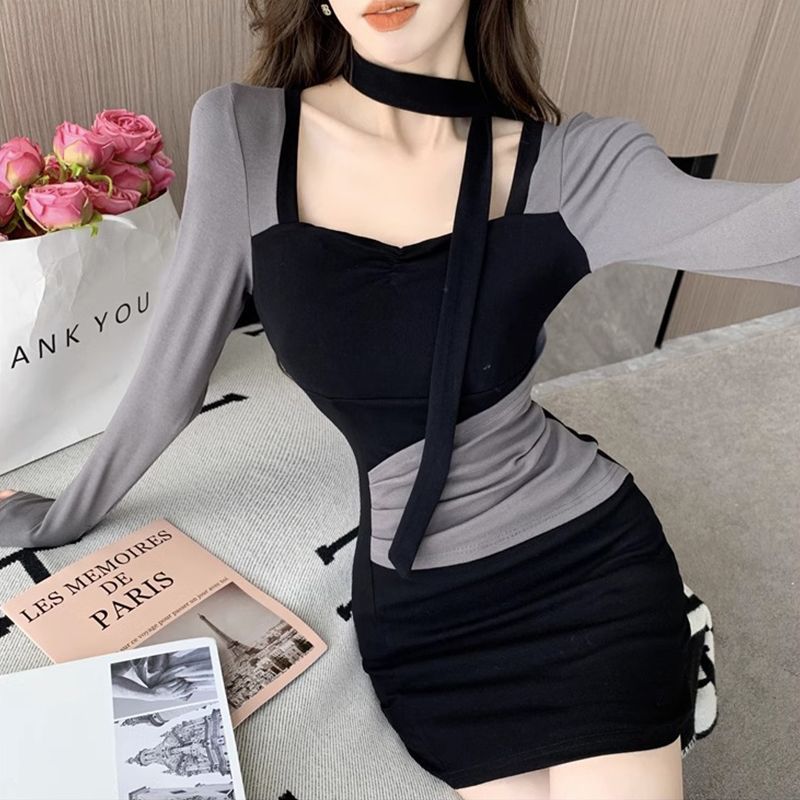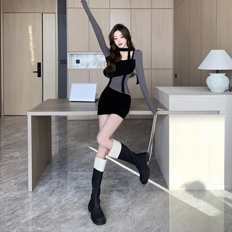 纯欲辣妹拼接撞色连衣裙女2025秋冬新款小众设计感修身包臀短裙子
