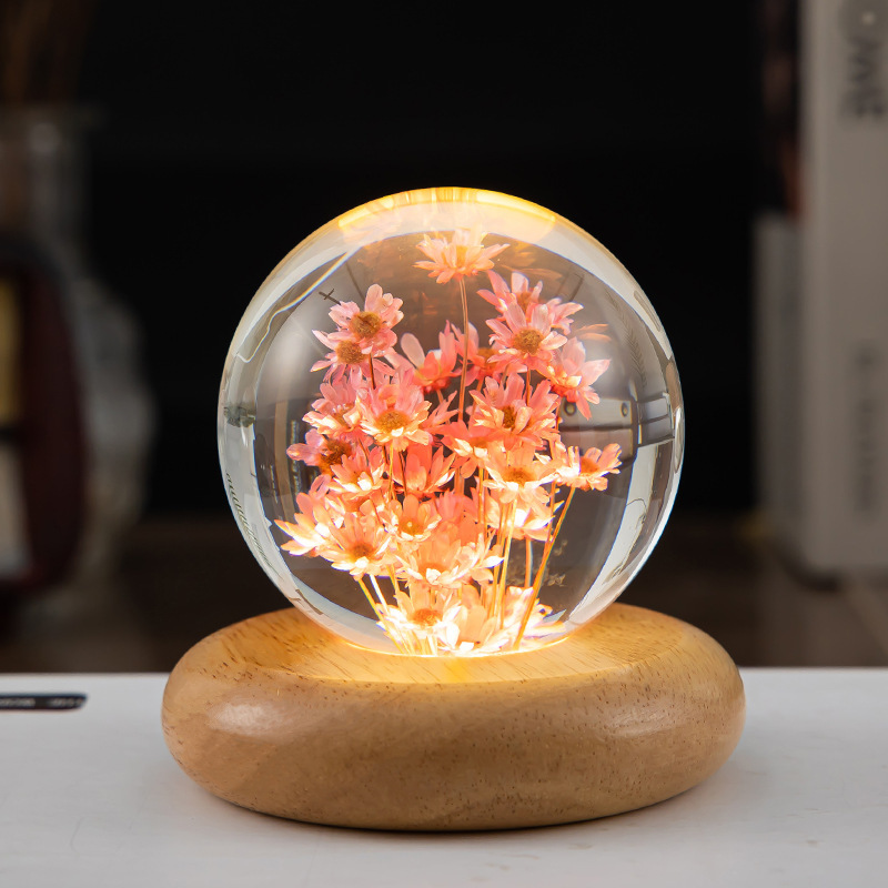 跨境货源蒲公英水晶球小夜灯永生花3D内雕发光实木底座水晶礼物M2