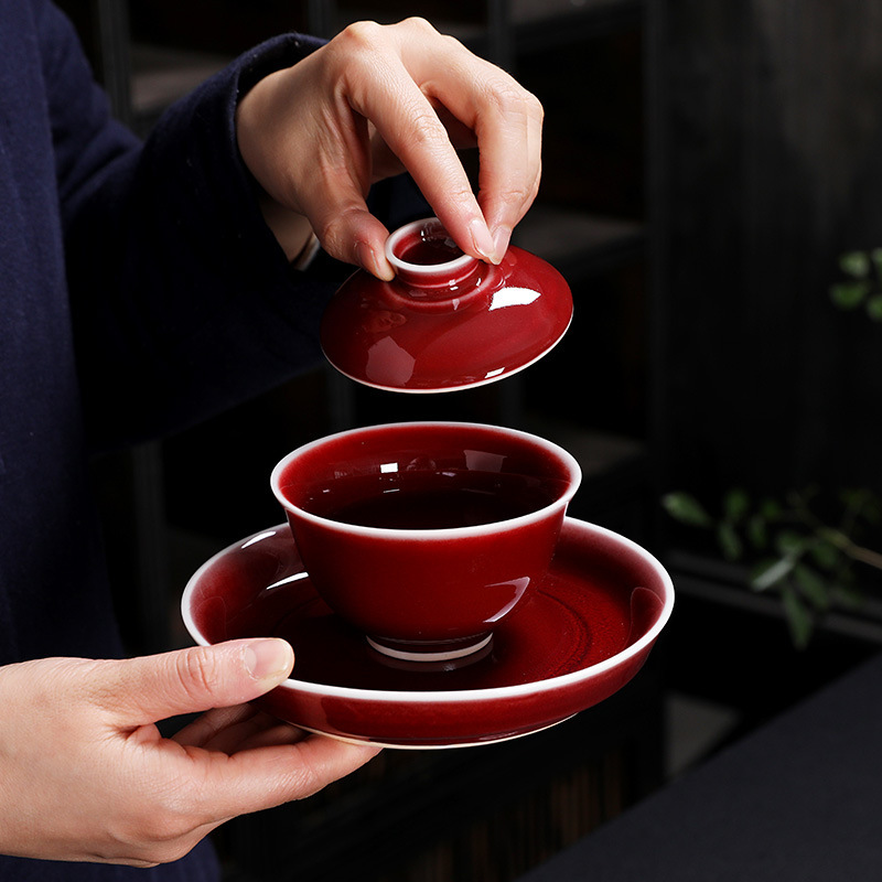 景德镇陶瓷朗红釉古风贵妃三才盖碗功夫茶具茶杯主人杯家用泡茶碗