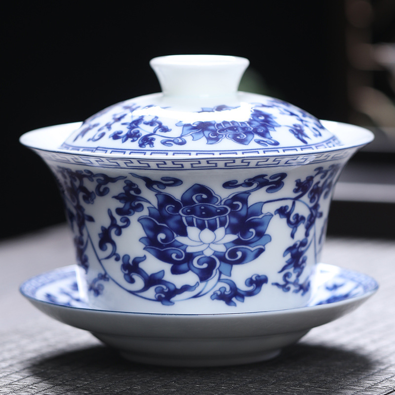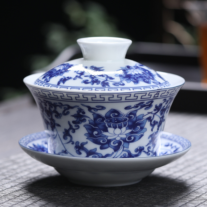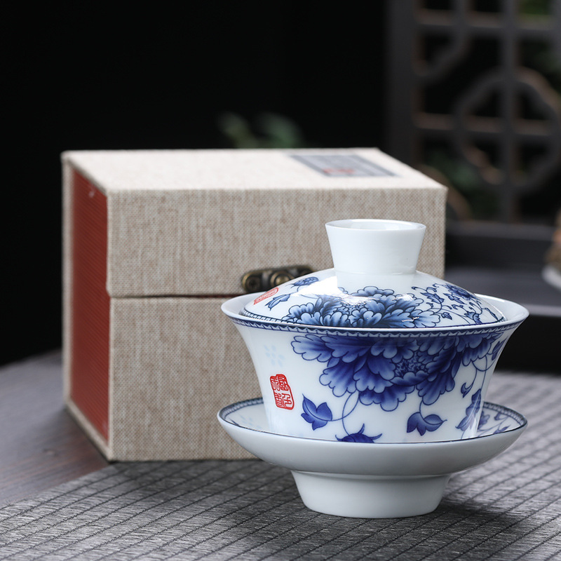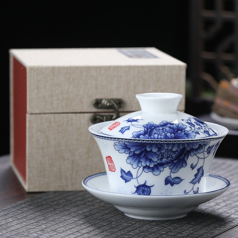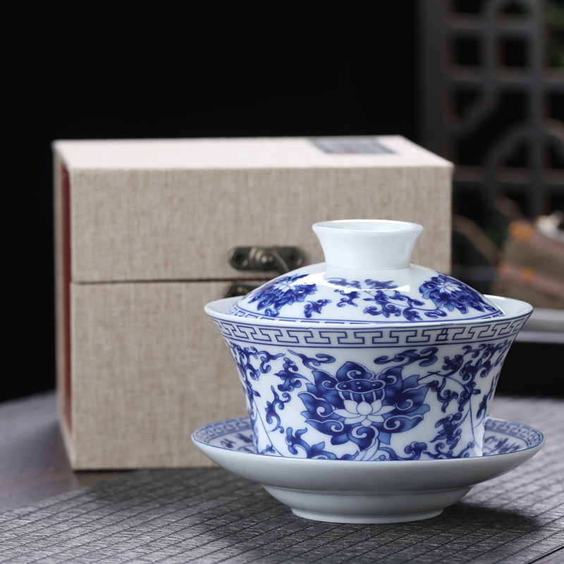 青花瓷茶碗盖碗大号白瓷高温三茶碗250ml蓝彩茶杯敬茶碗布包盒装