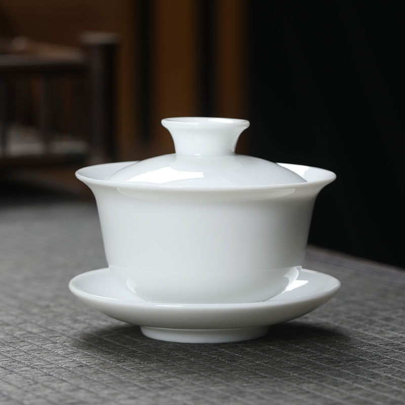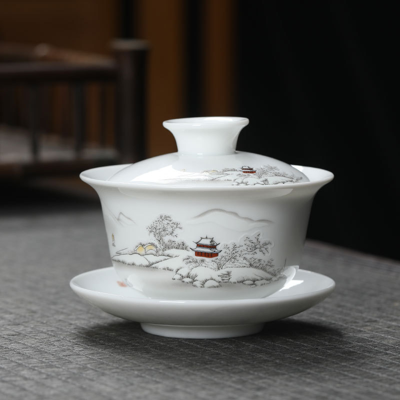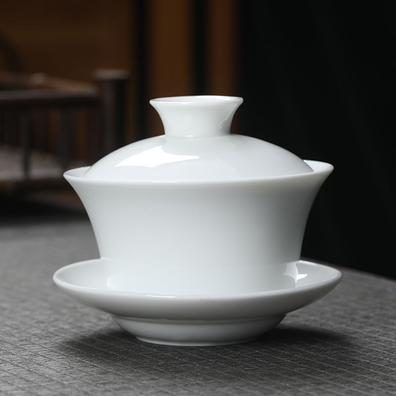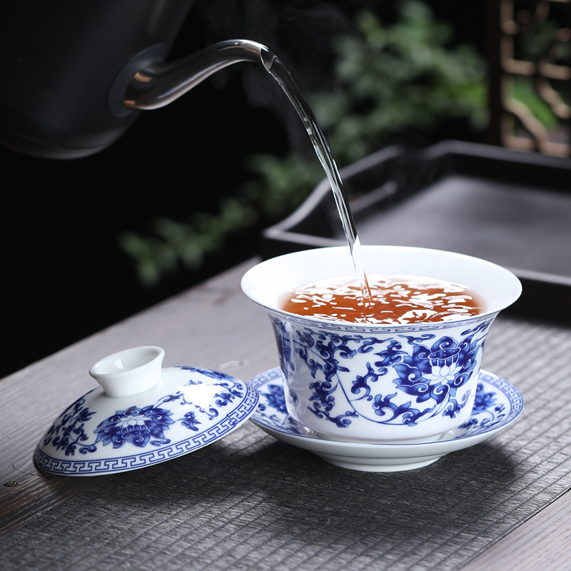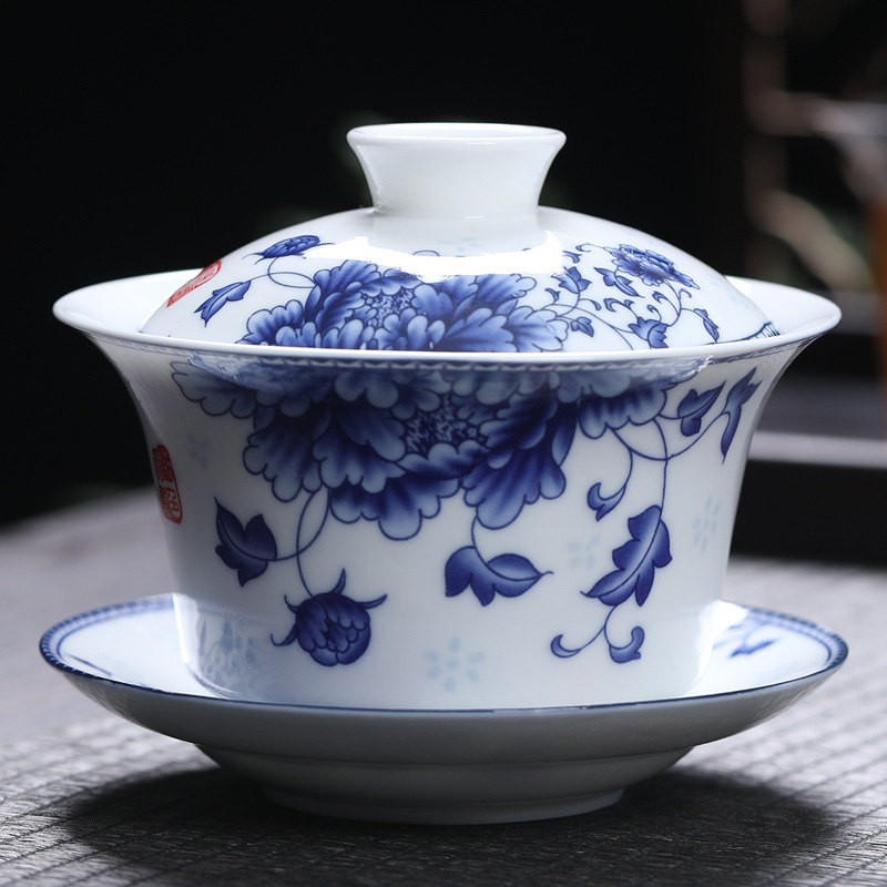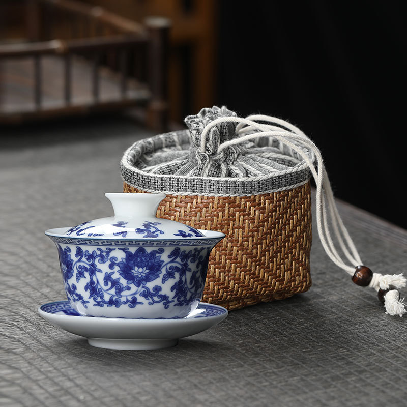 青花瓷茶碗盖碗大号白瓷高温三茶碗250ml蓝彩茶杯敬茶碗布包盒装