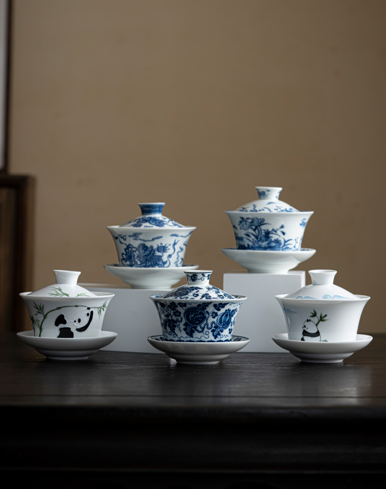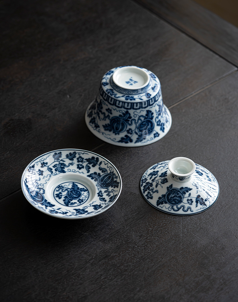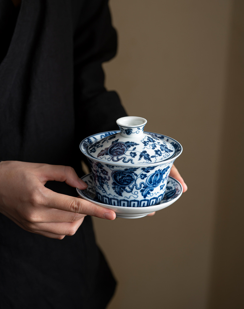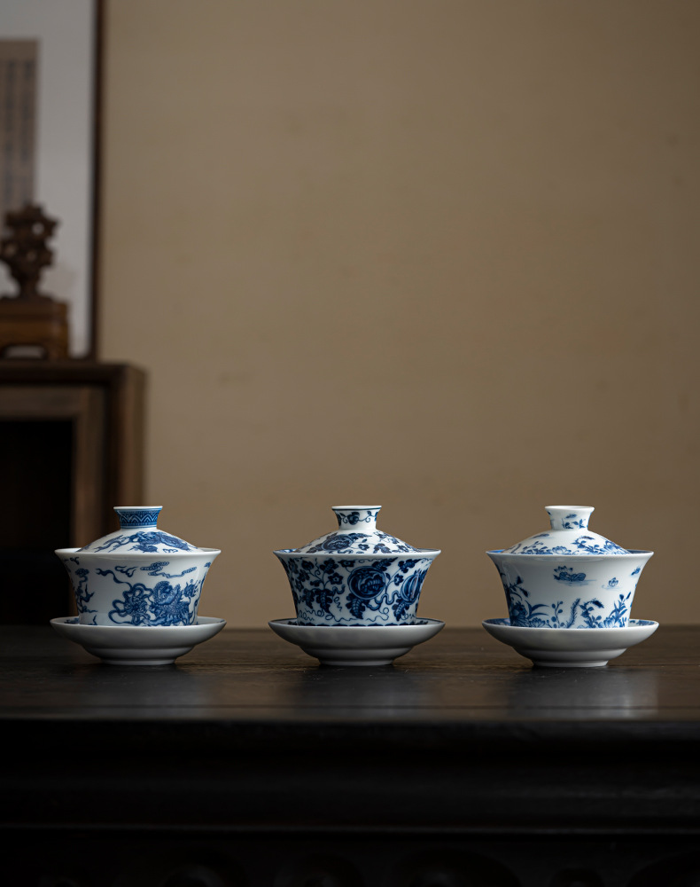九匠风青花三才盖碗仿古大号敬茶碗家用防烫陶瓷功夫茶具八宝茶碗