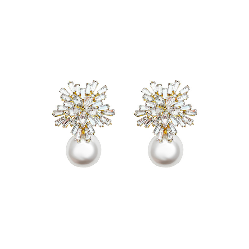 S925银针轻奢小众精致锆石雪花耳环韩国新款百搭气质珍珠耳钉耳饰