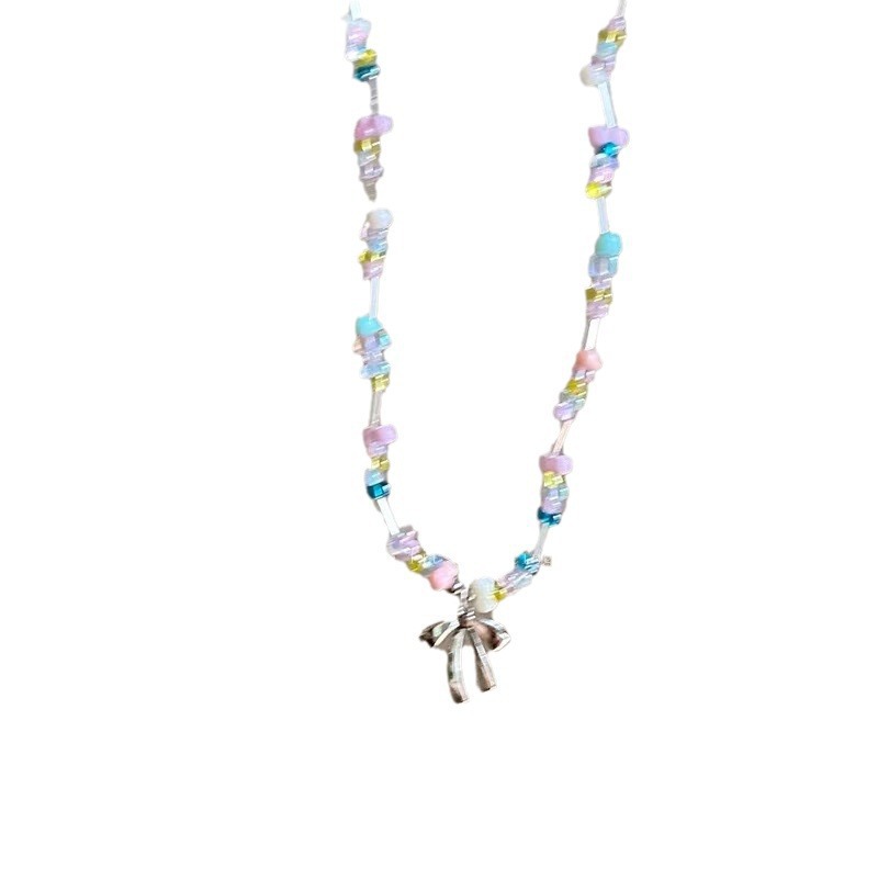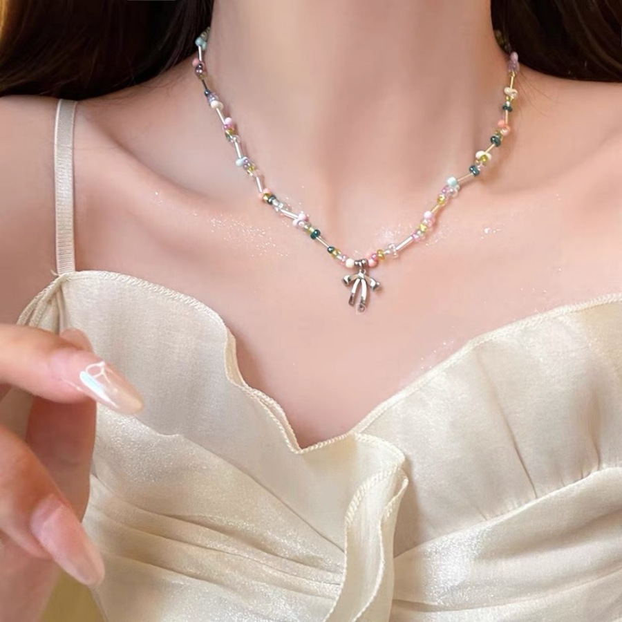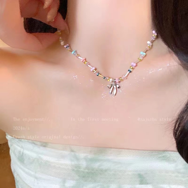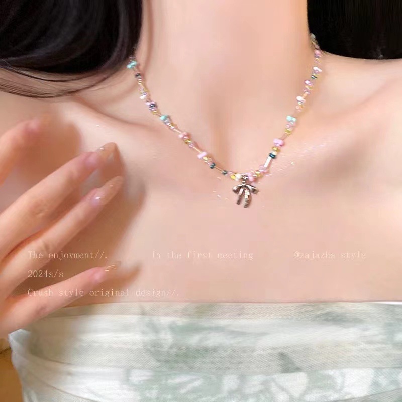 韩系甜美可爱粉色串珠项链小众百搭气质蝴蝶结锁骨链网红同款颈链