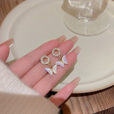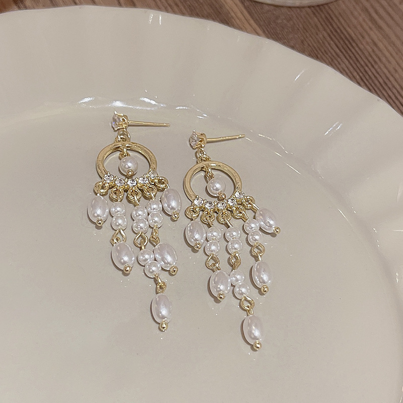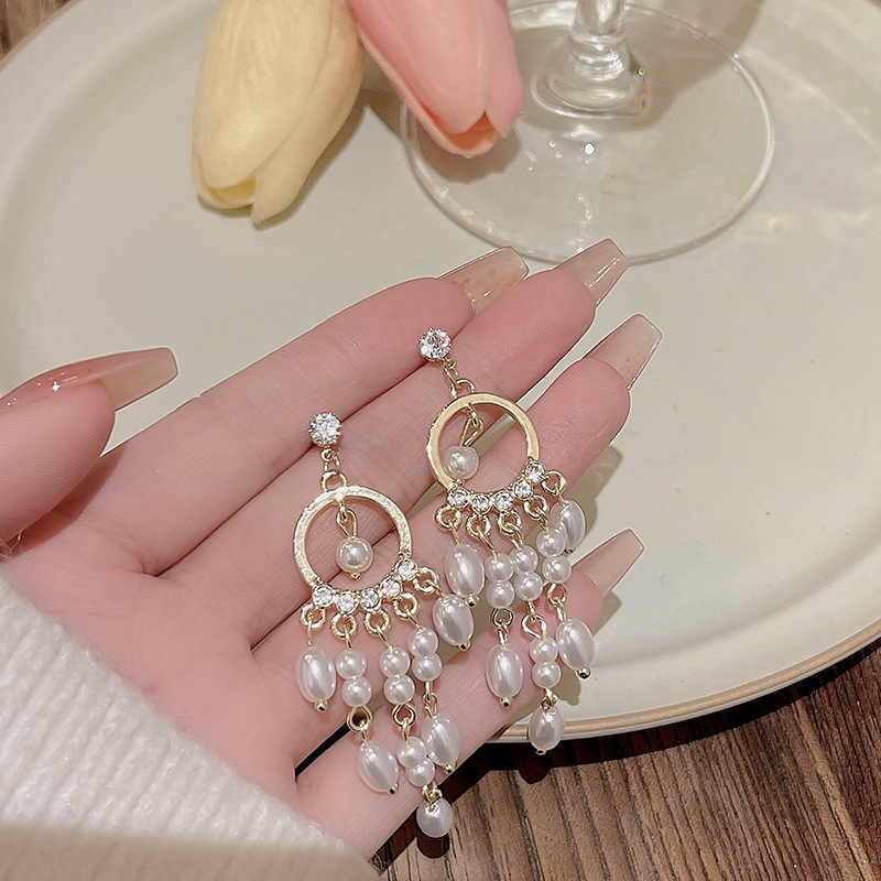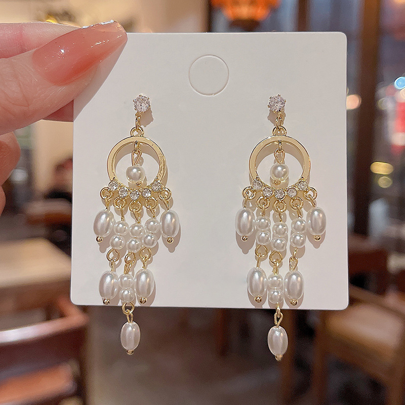 S925银针法式复古长款流苏珍珠耳环女高级设计感百搭气质锆石耳钉
