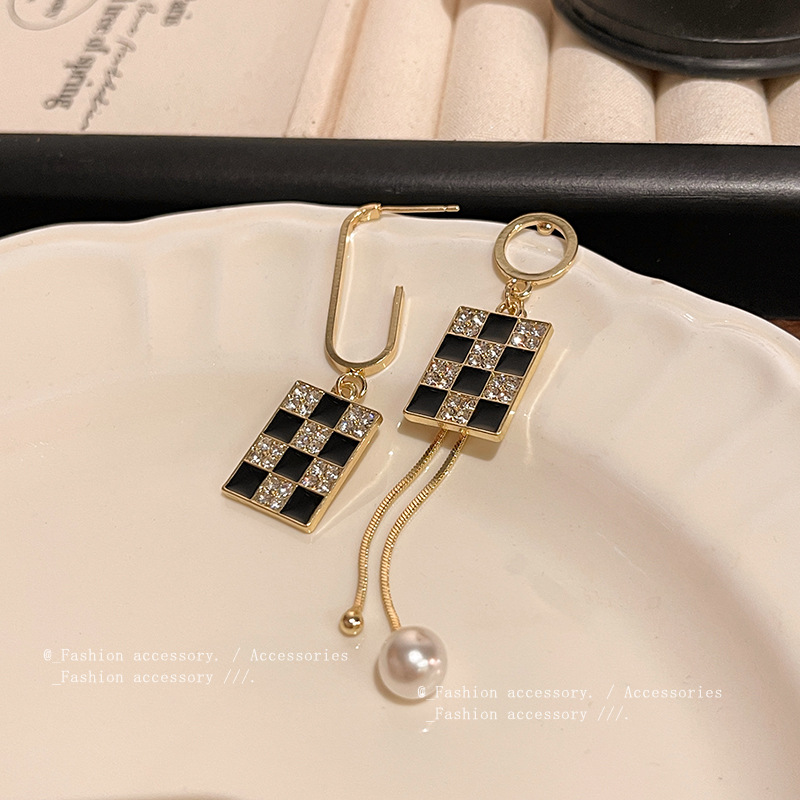 欧美夸张不对称黑色棋盘格耳环女S925银针超闪镶钻珍珠耳钉耳饰品