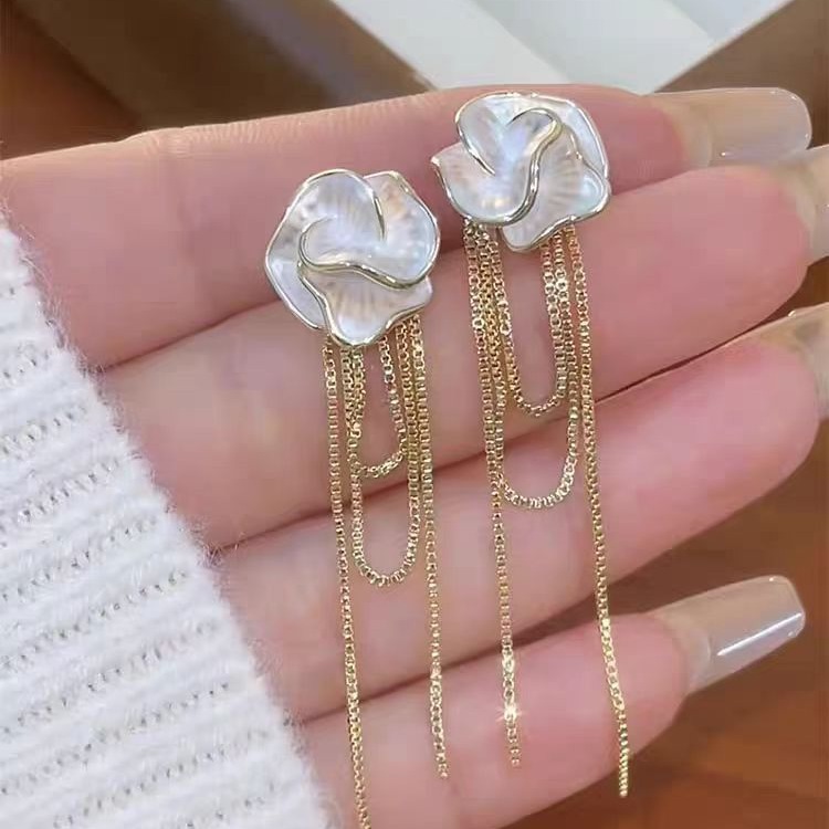 S925银针一款两戴山茶花耳钉轻奢小众高级感长款流苏花朵耳环耳饰