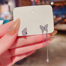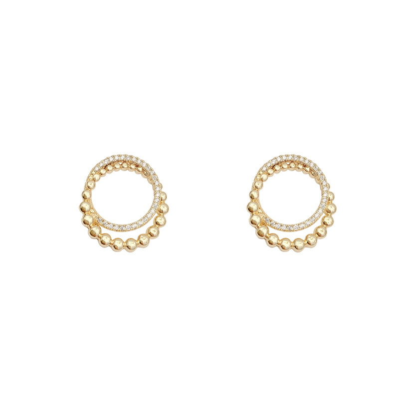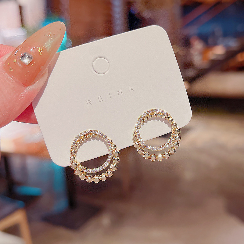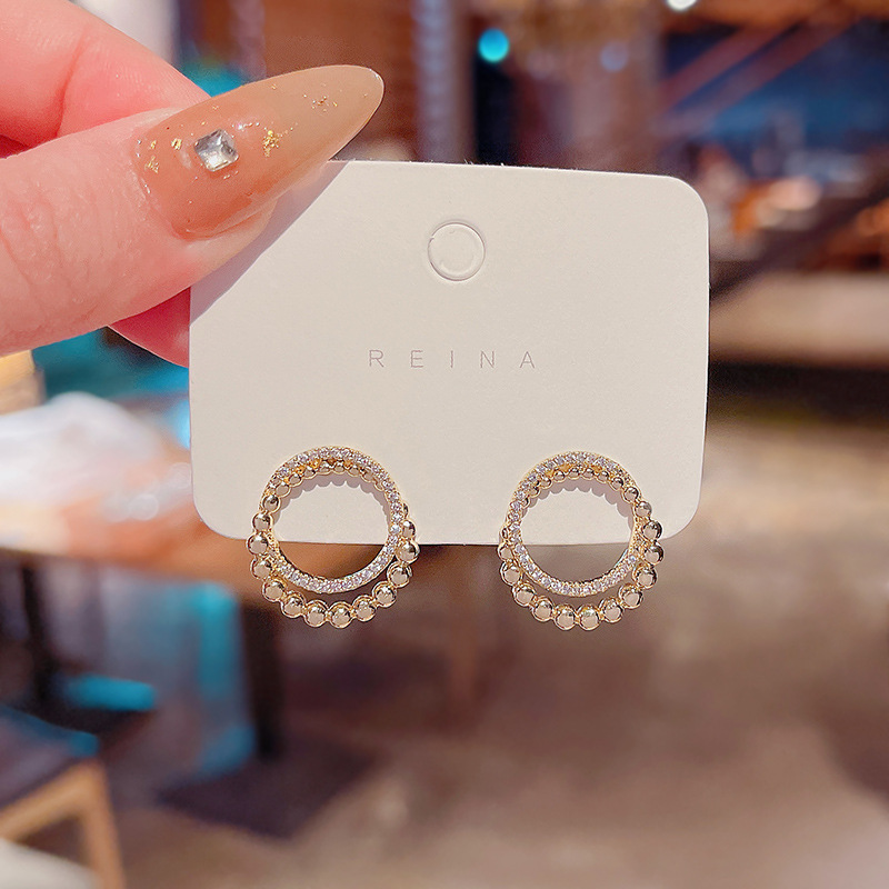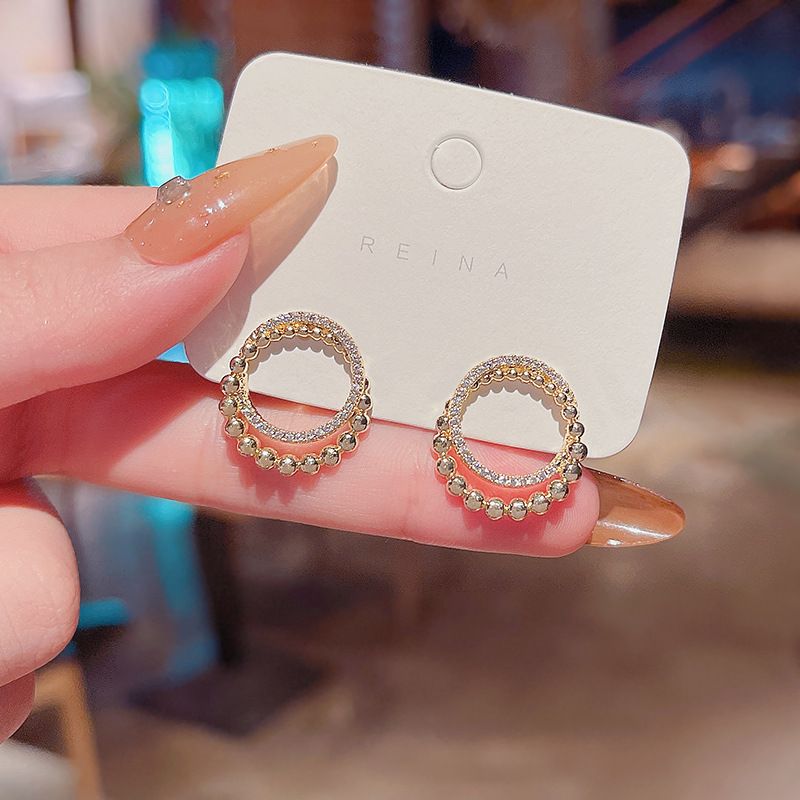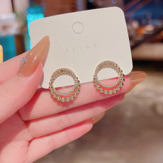 S925银针新款珍珠水钻耳钉女圆圈简约个性双环缠绕设计感耳环耳饰