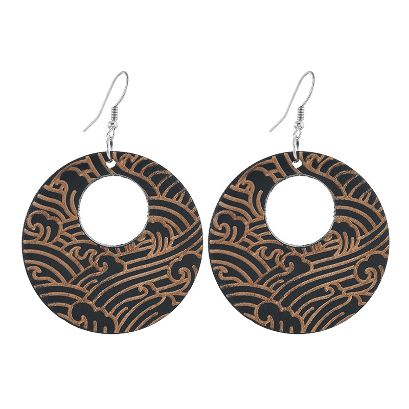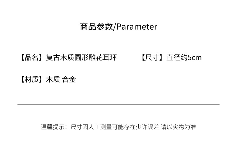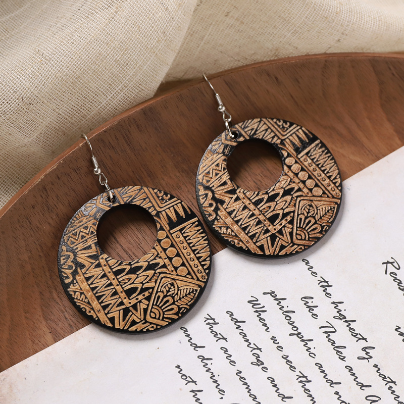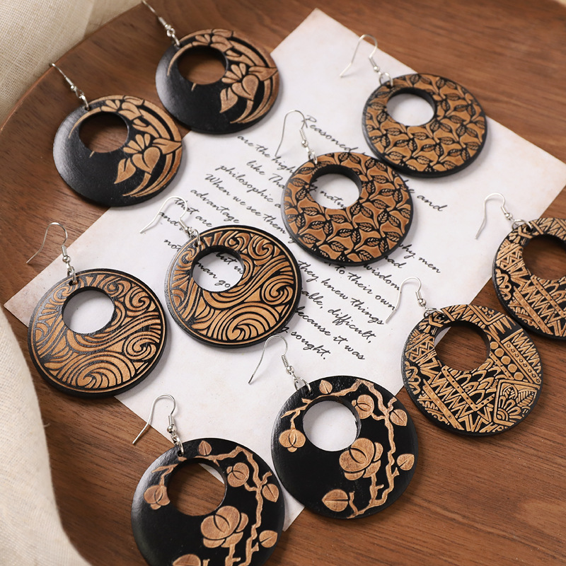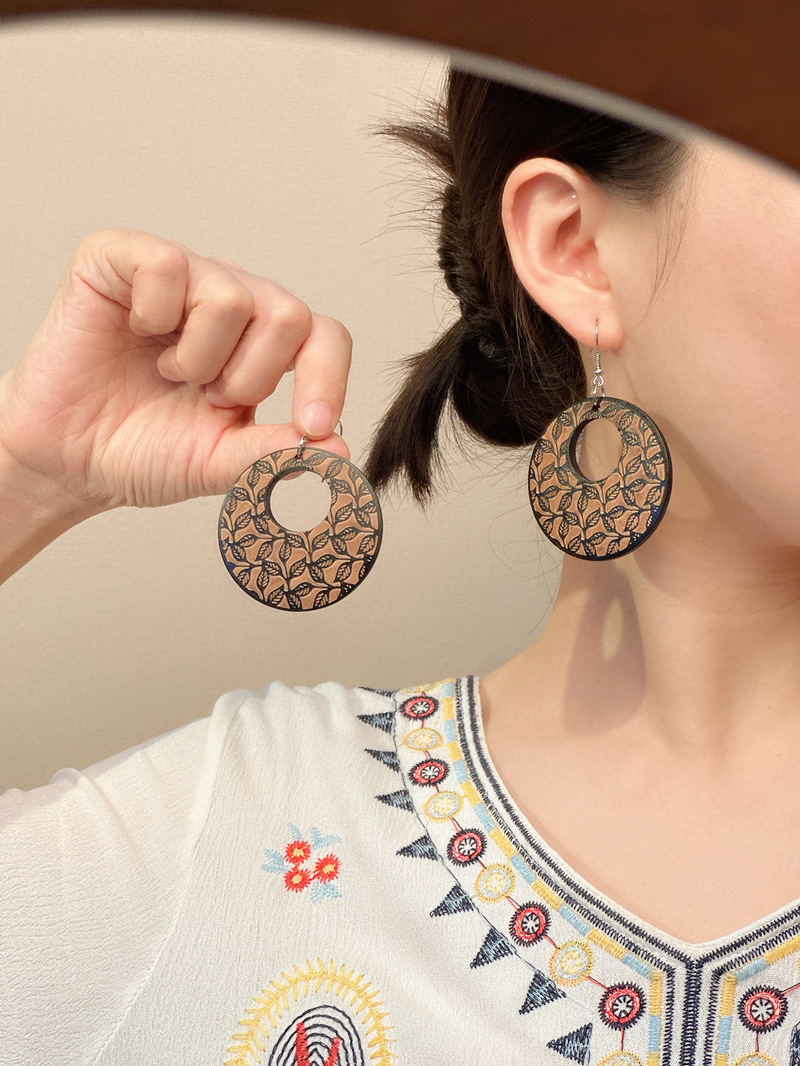 新中式复古风木质雕花耳环小众设计圆形耳坠女气质文艺民族风耳饰