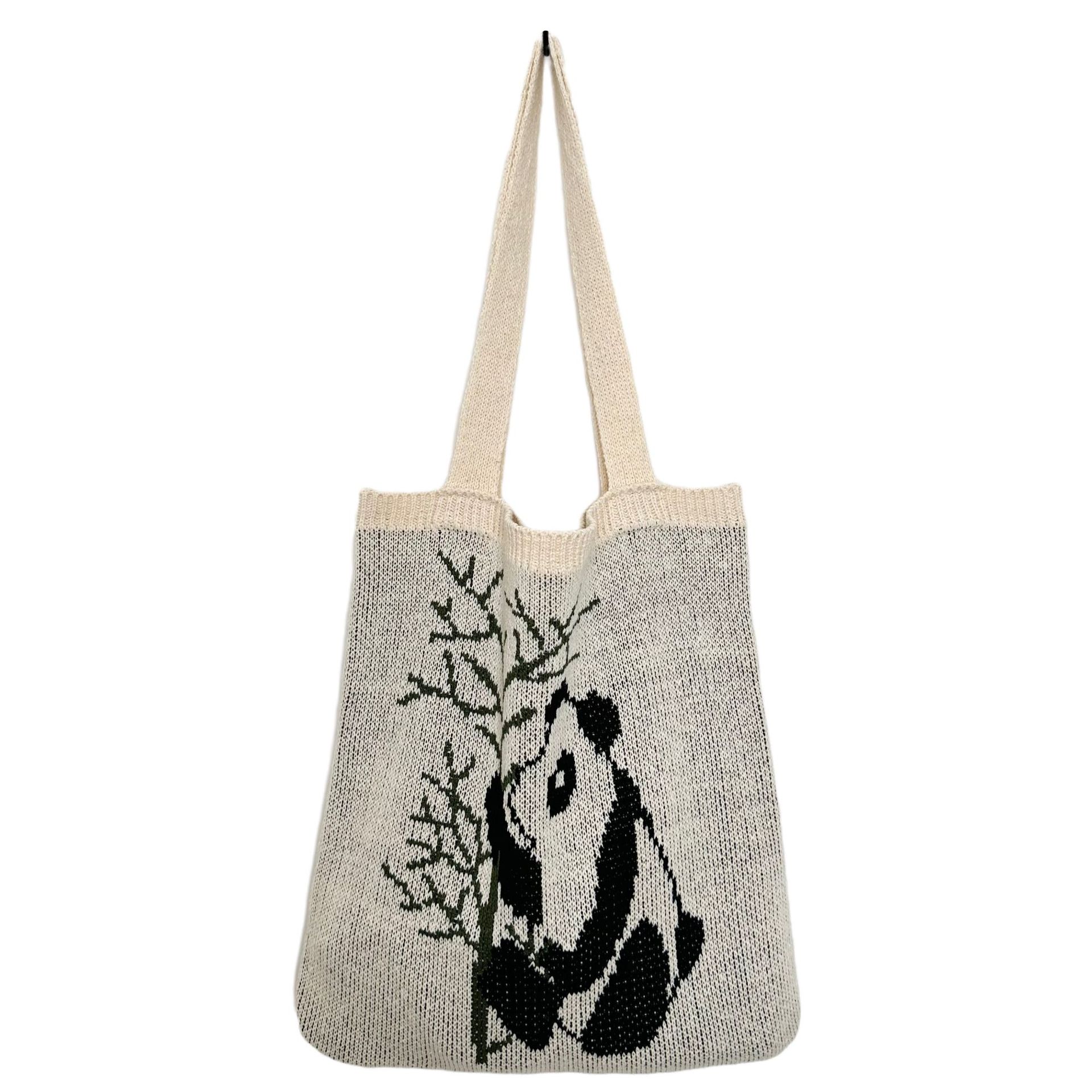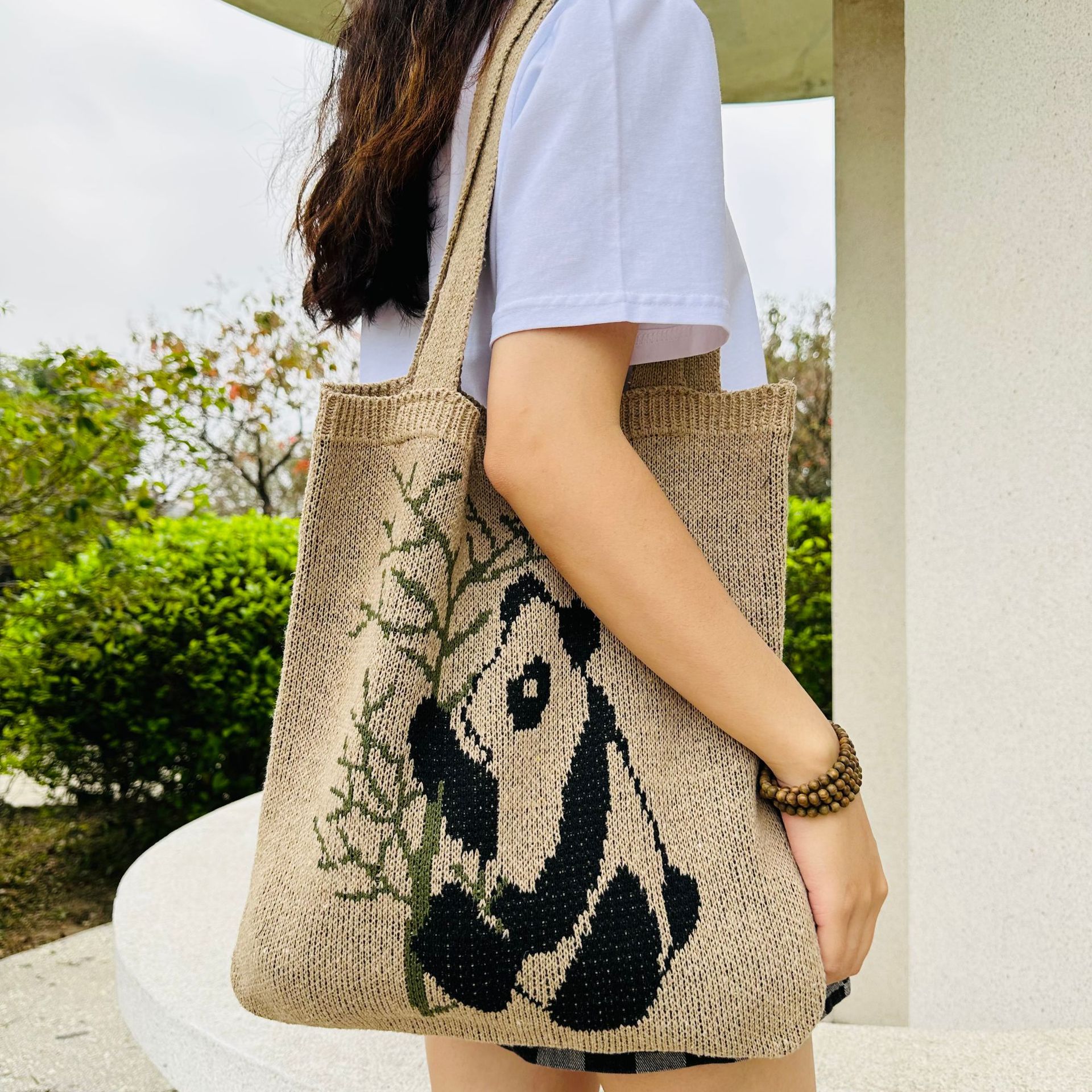 2023新款亚马逊跨境包包托特包熊猫图案包针织包包镂空包编织包包