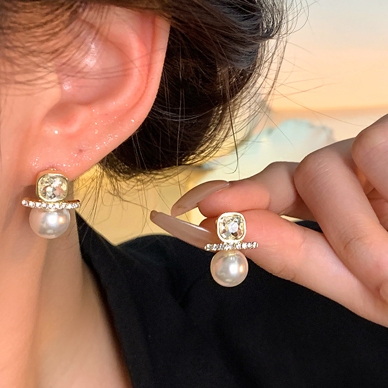 S925银针轻奢小众方形锆石耳钉女高级设计感珍珠耳钉网红同款耳饰