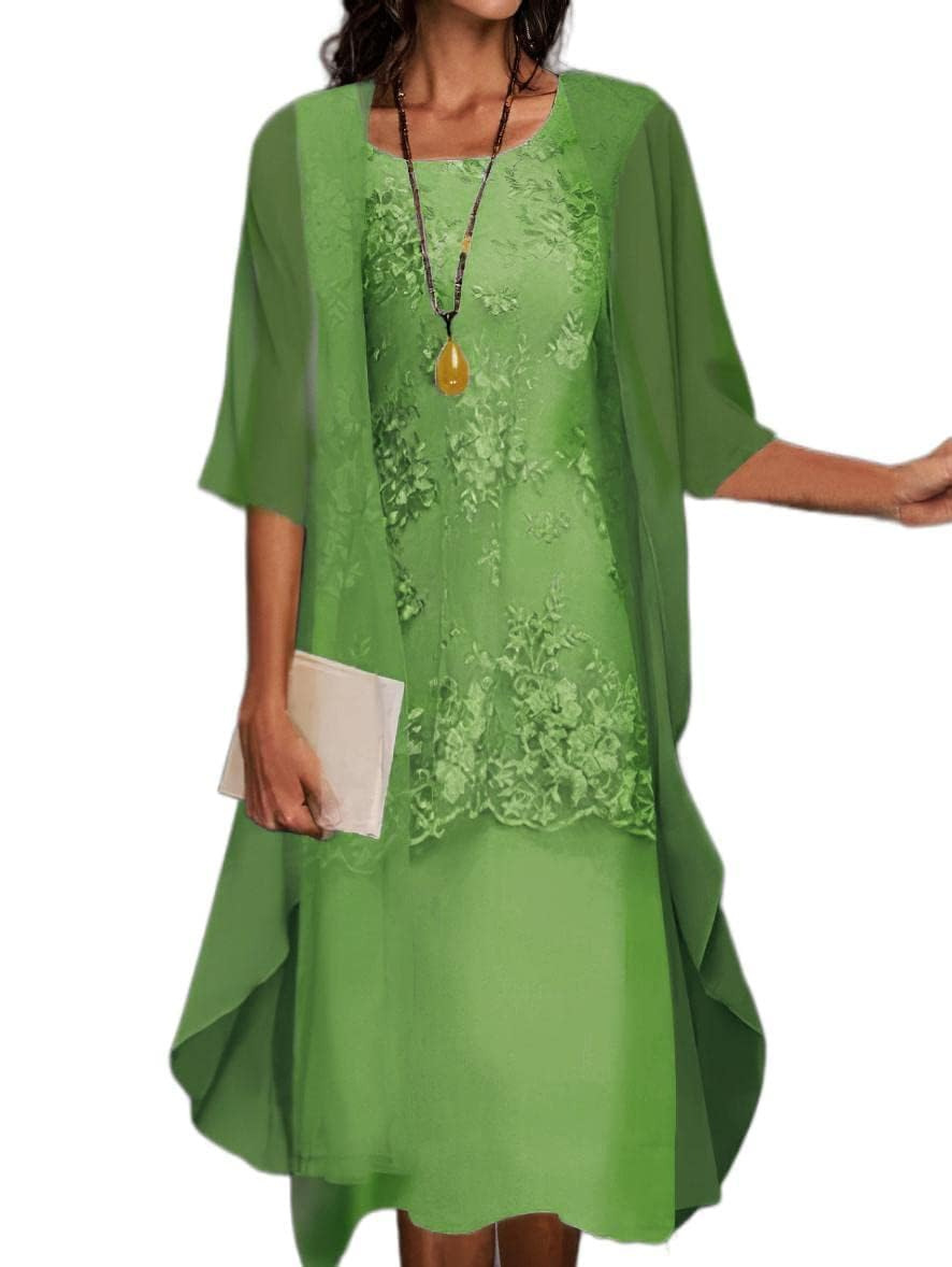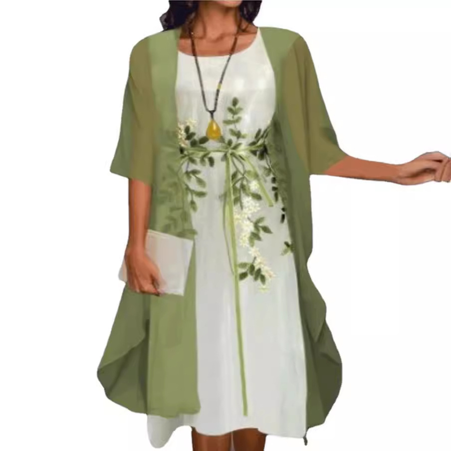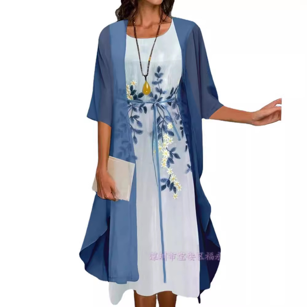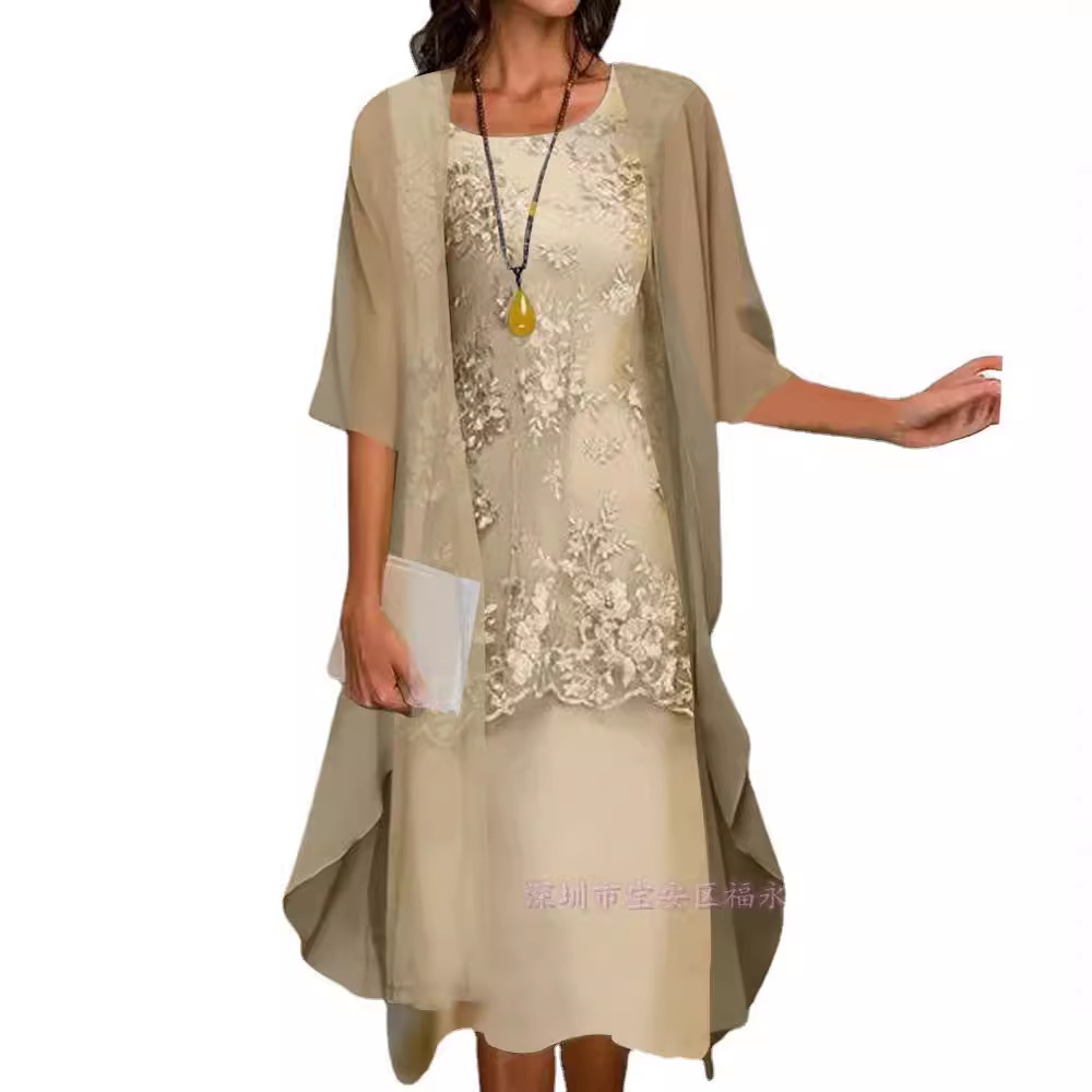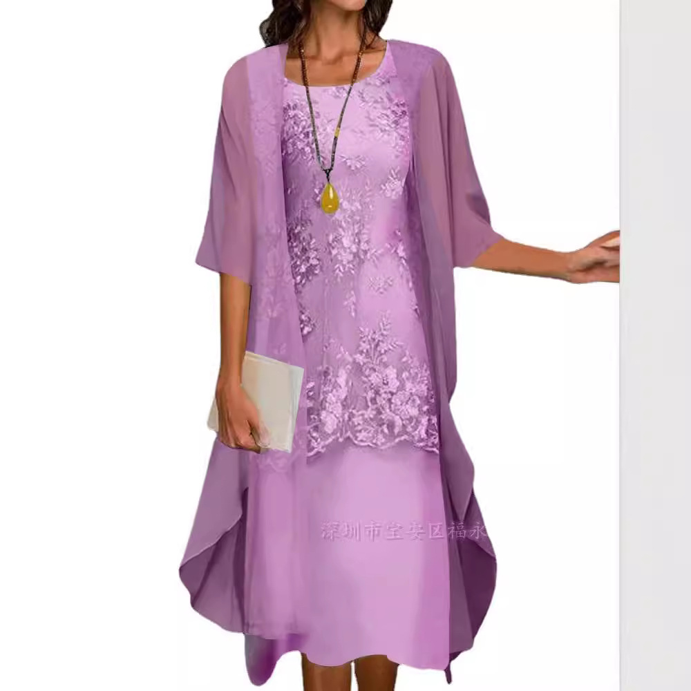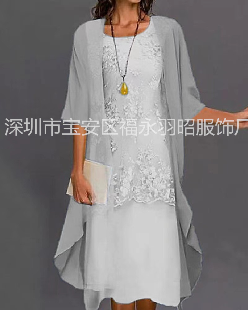 欧美热卖独立站亚马逊Wish爆款春秋时尚优雅蕾丝雪纺连衣裙两件套