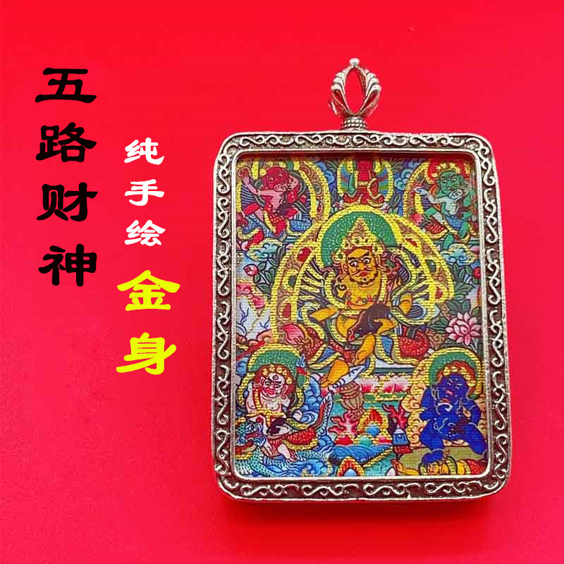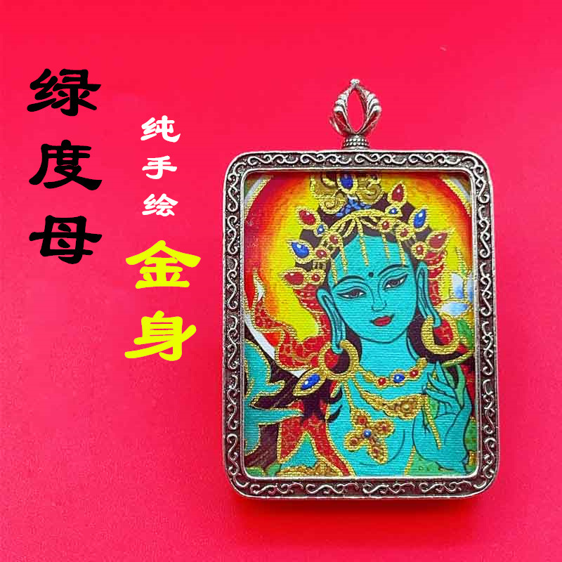 西藏手绘描金扎西拉姆唐卡吊坠复古做旧藏银绿度母五路财神嘎乌盒