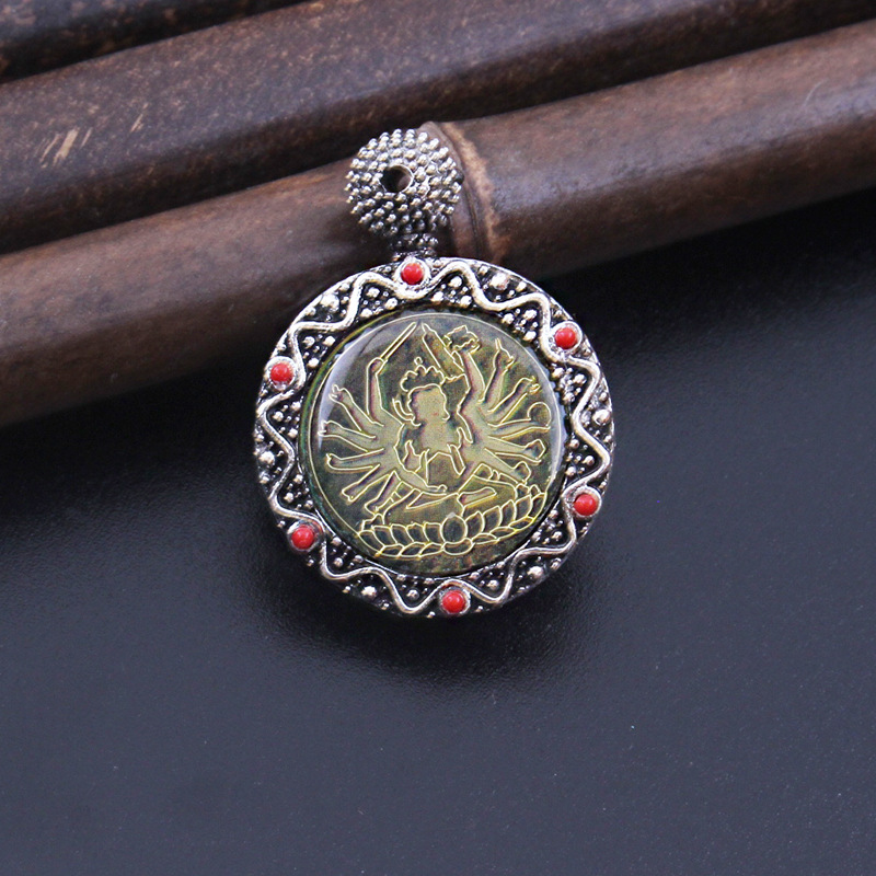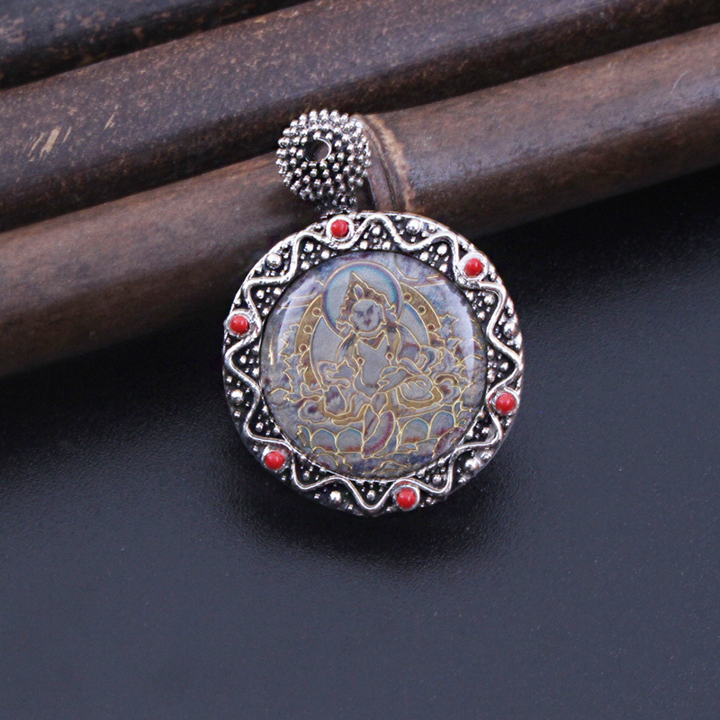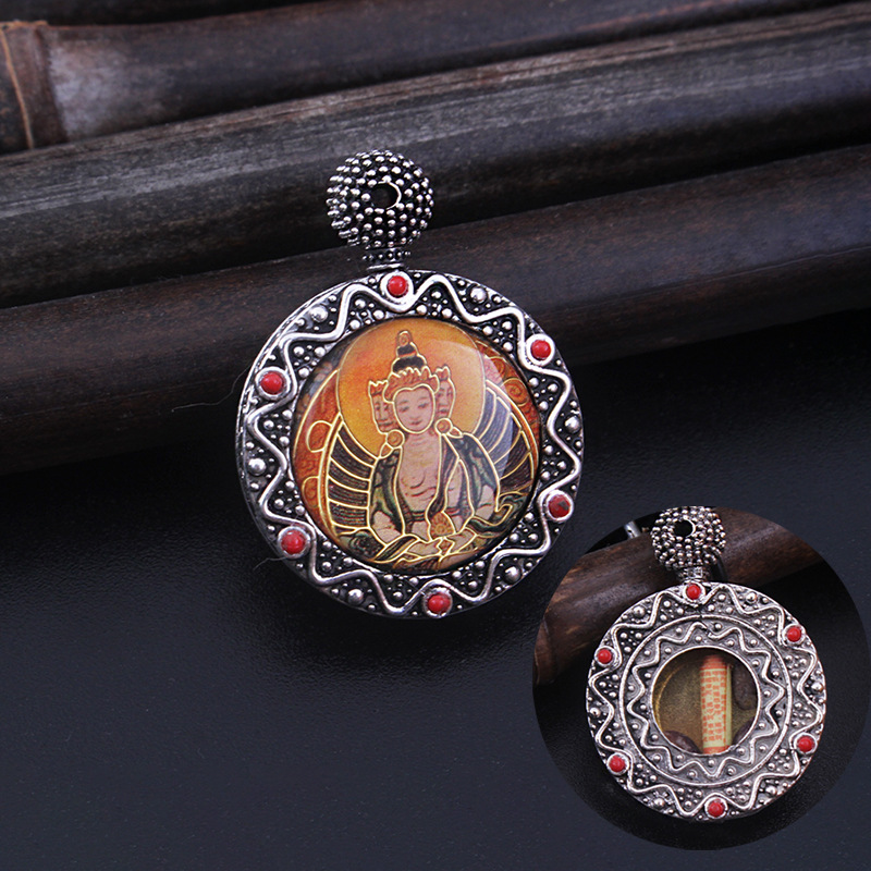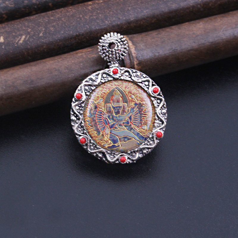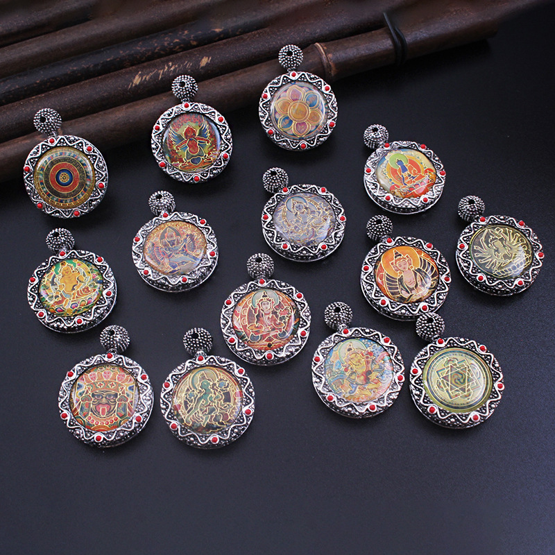 唐卡随身佛牌合金吊坠六字真言黄财神项链吊坠带经文迷你唐卡画盒