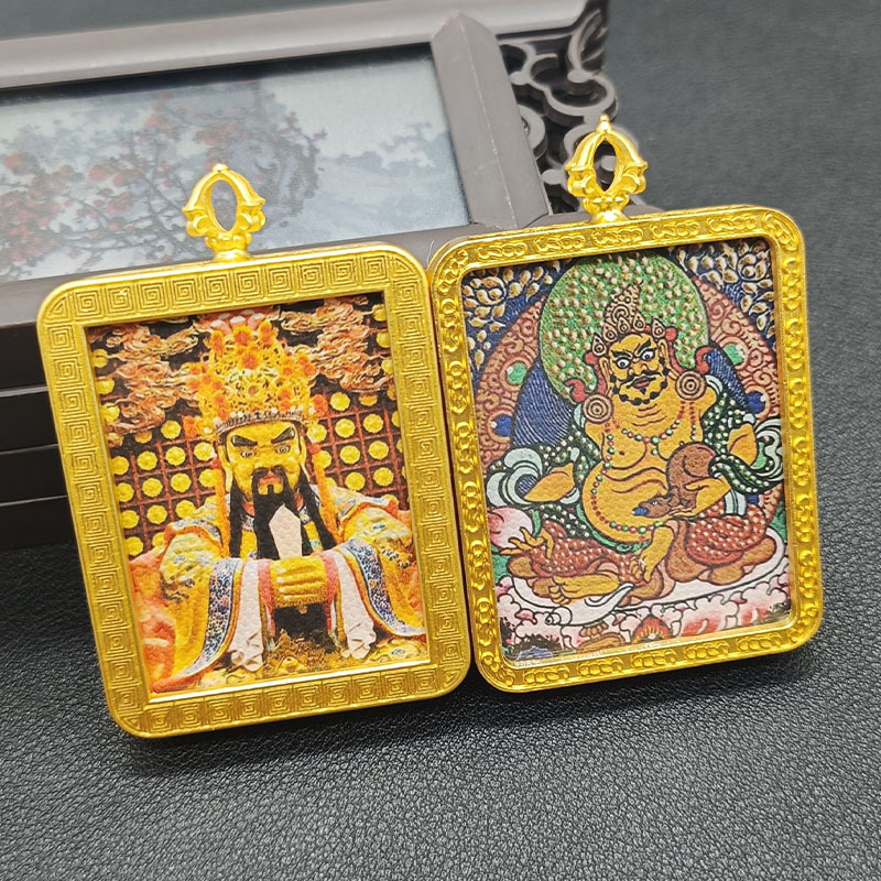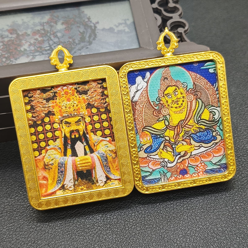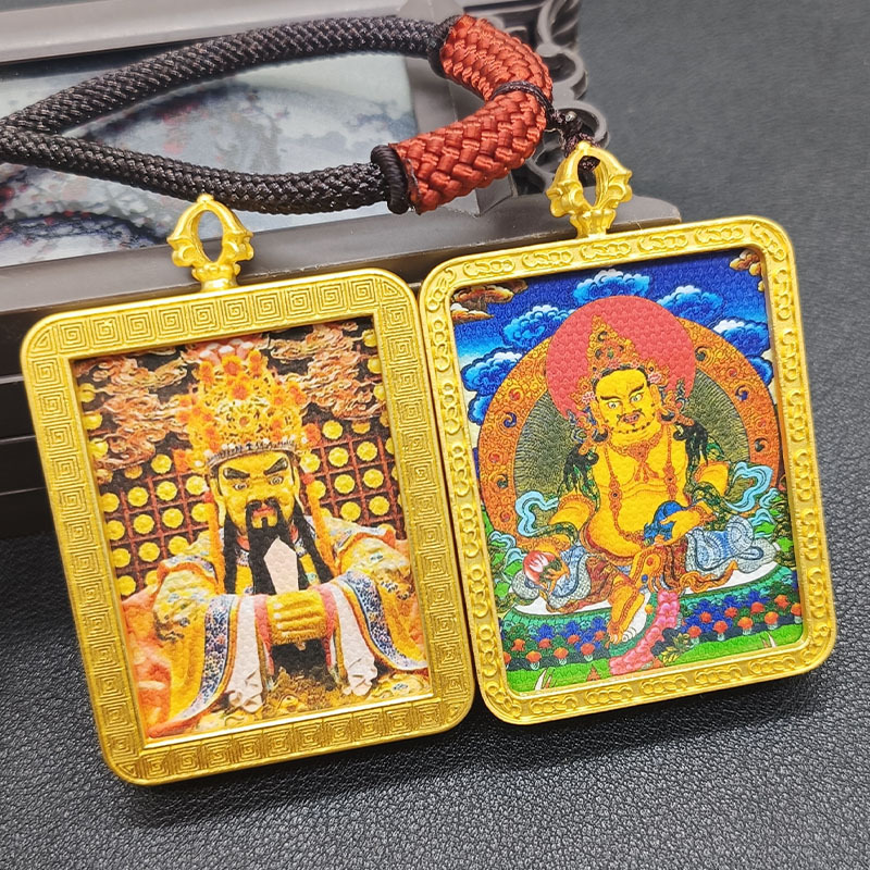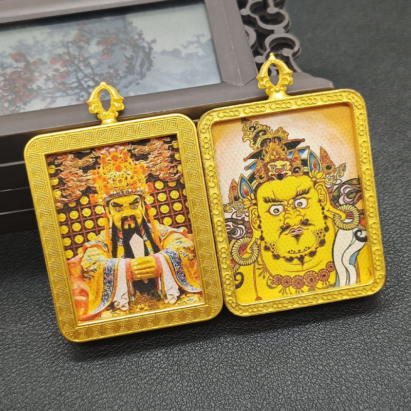 双面唐卡龙五爷黄财神金色嘎呜盒合金电镀吊坠画盒旅游纪念送挂绳