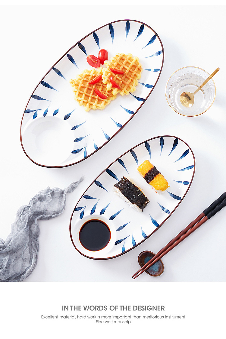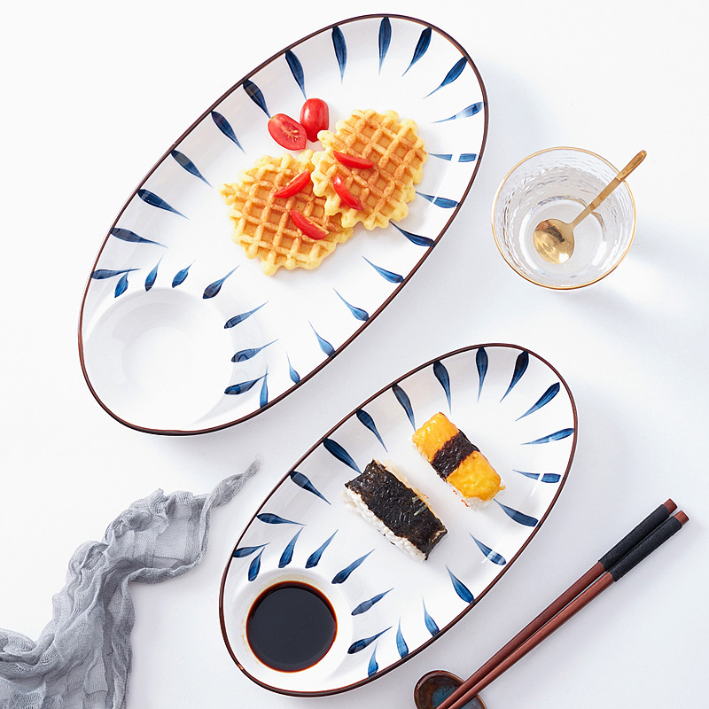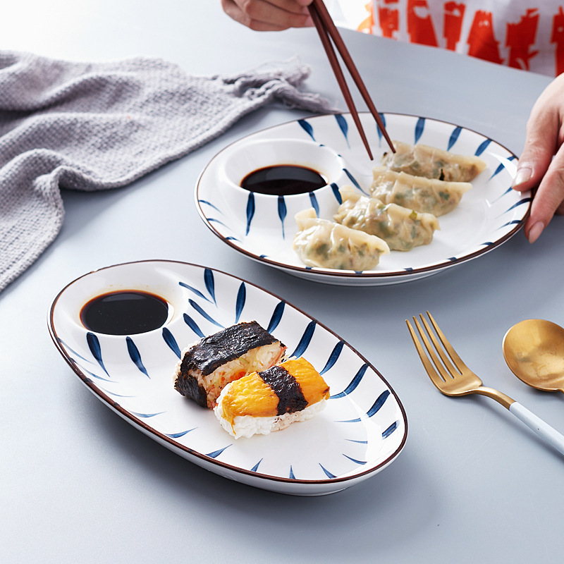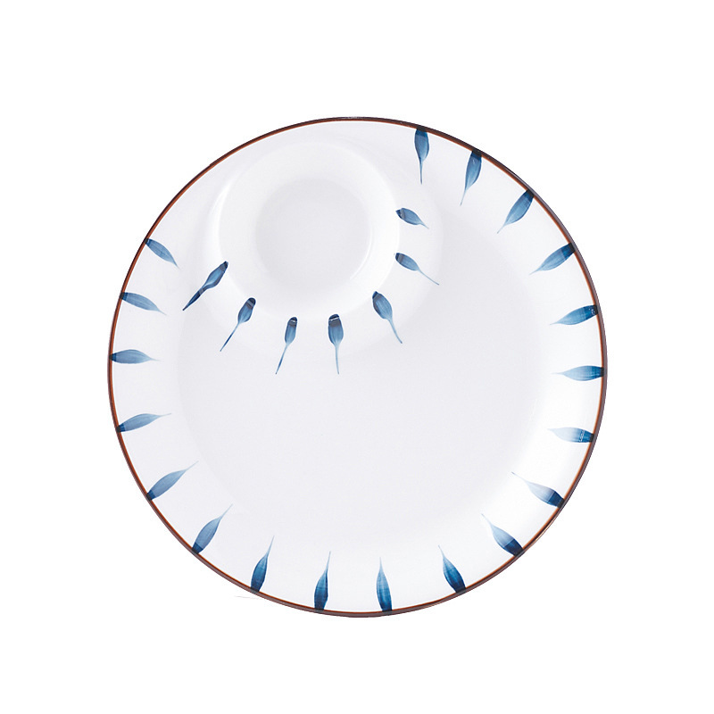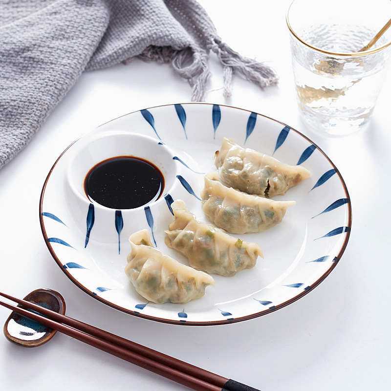 陶瓷带醋碟饺子盘ins创意家用釉下彩手绘陶瓷盘 大号蒸饺分格托盘