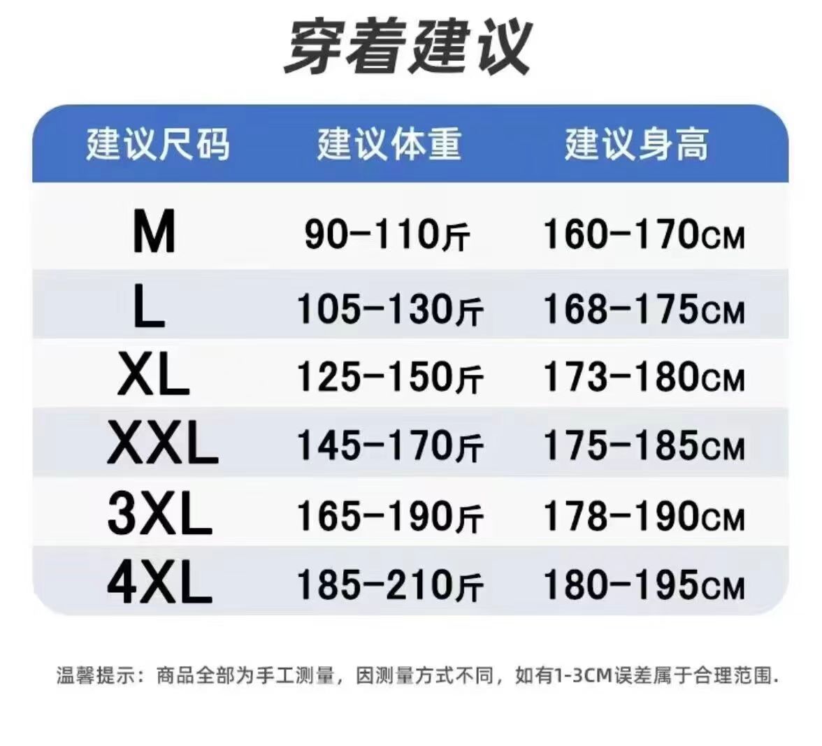 | 4xl recommended 92.50 kg-100.00 kg(4XL建议185-200斤) | USD $7.33 | 999999 piece available |