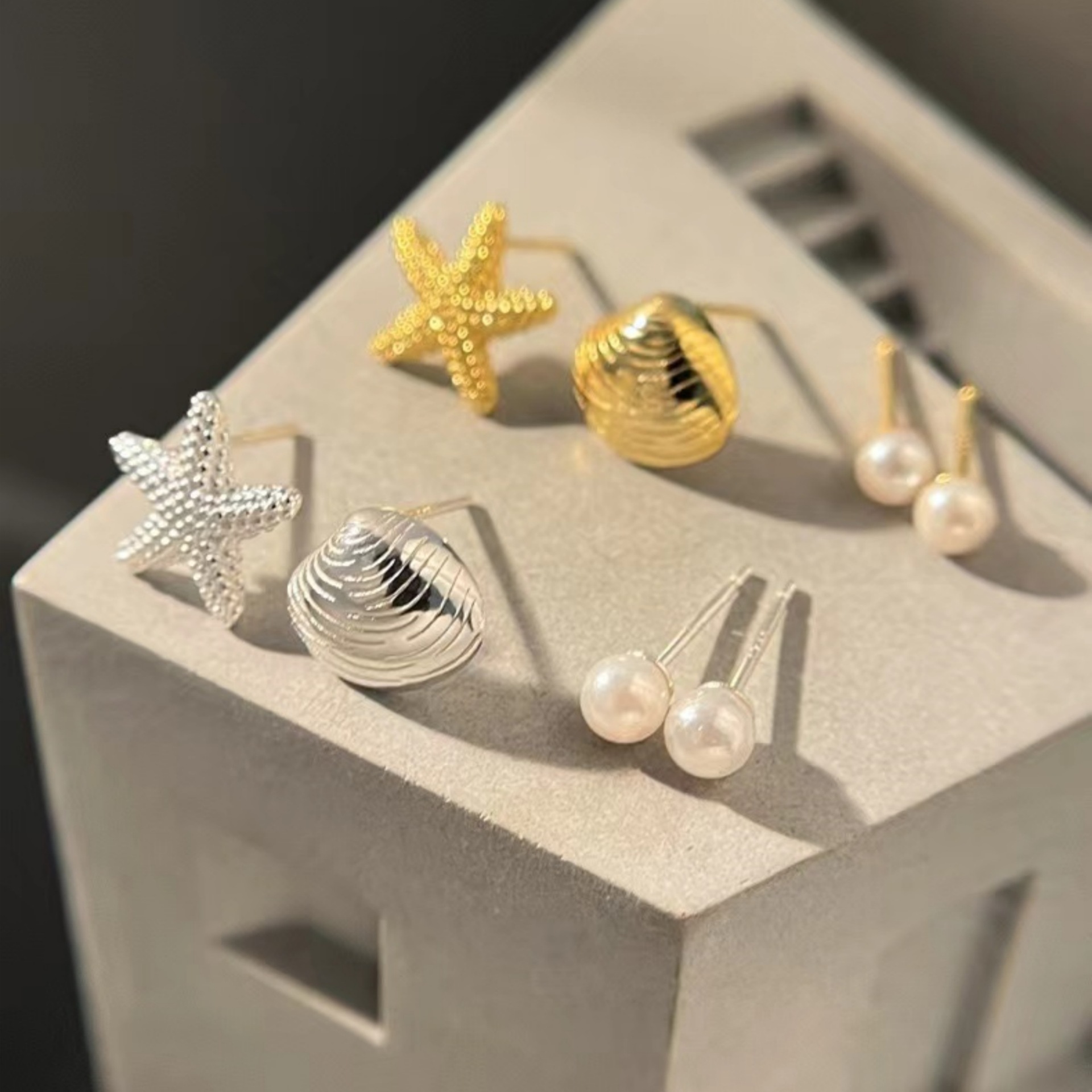 夏季度假海星贝壳仿珍珠耳钉女海边度假风四件套贝珠耳环纪念礼物