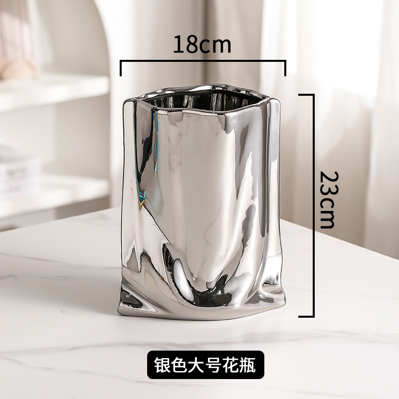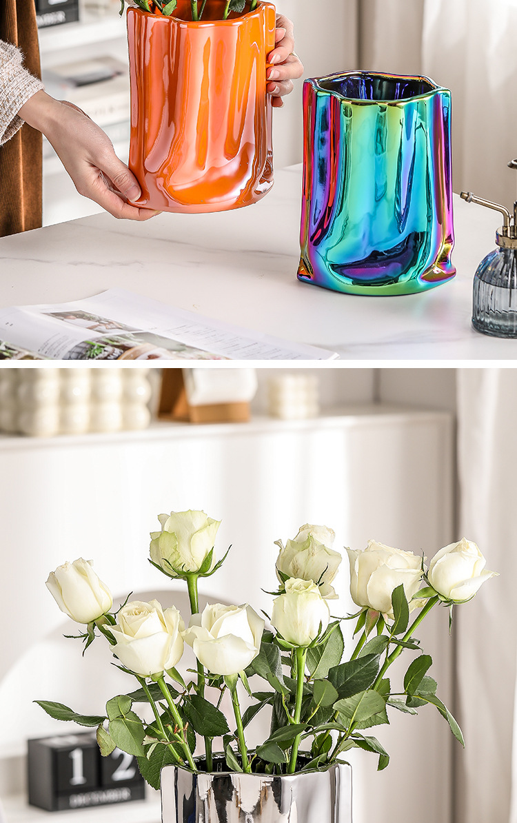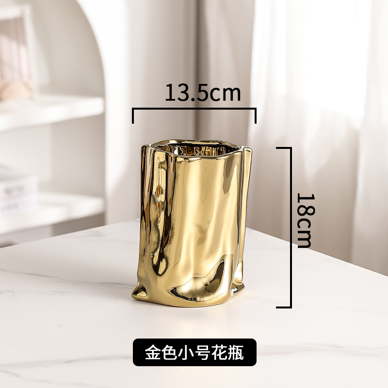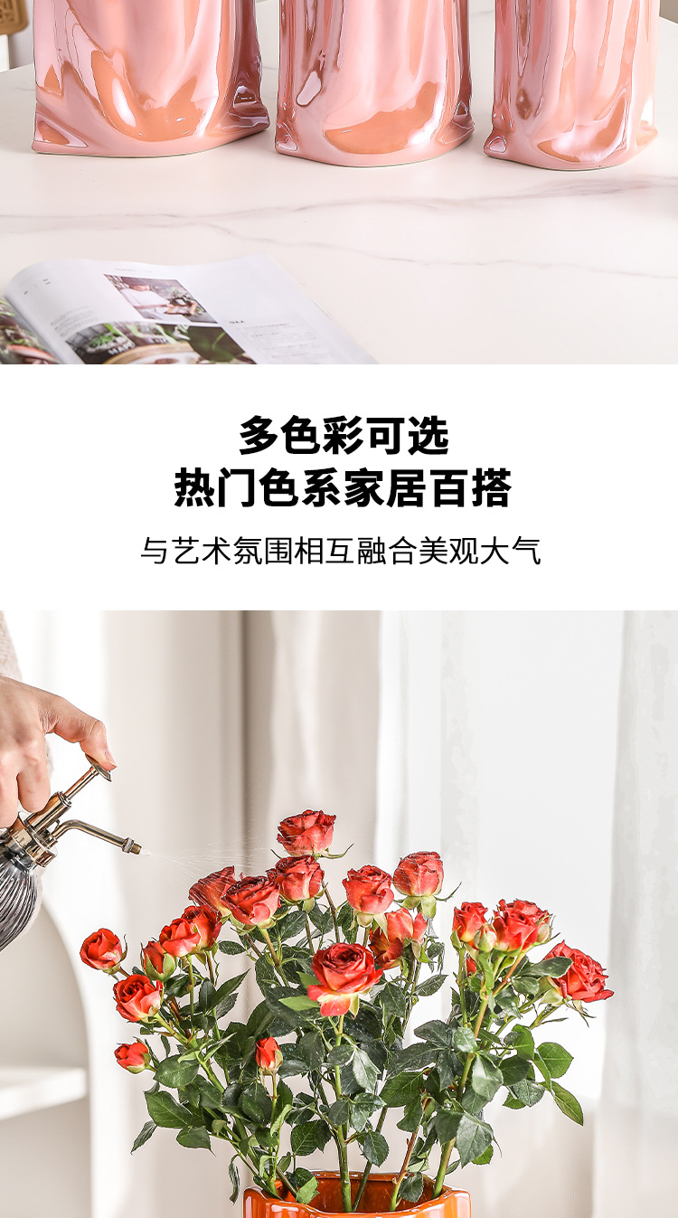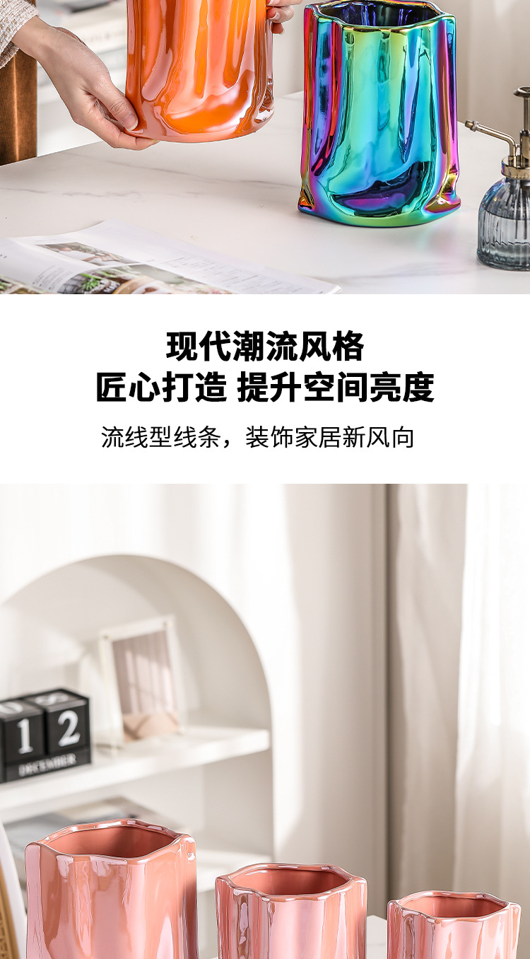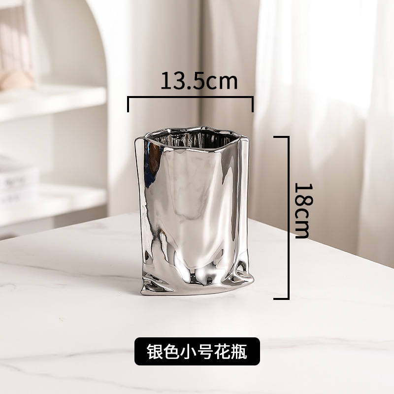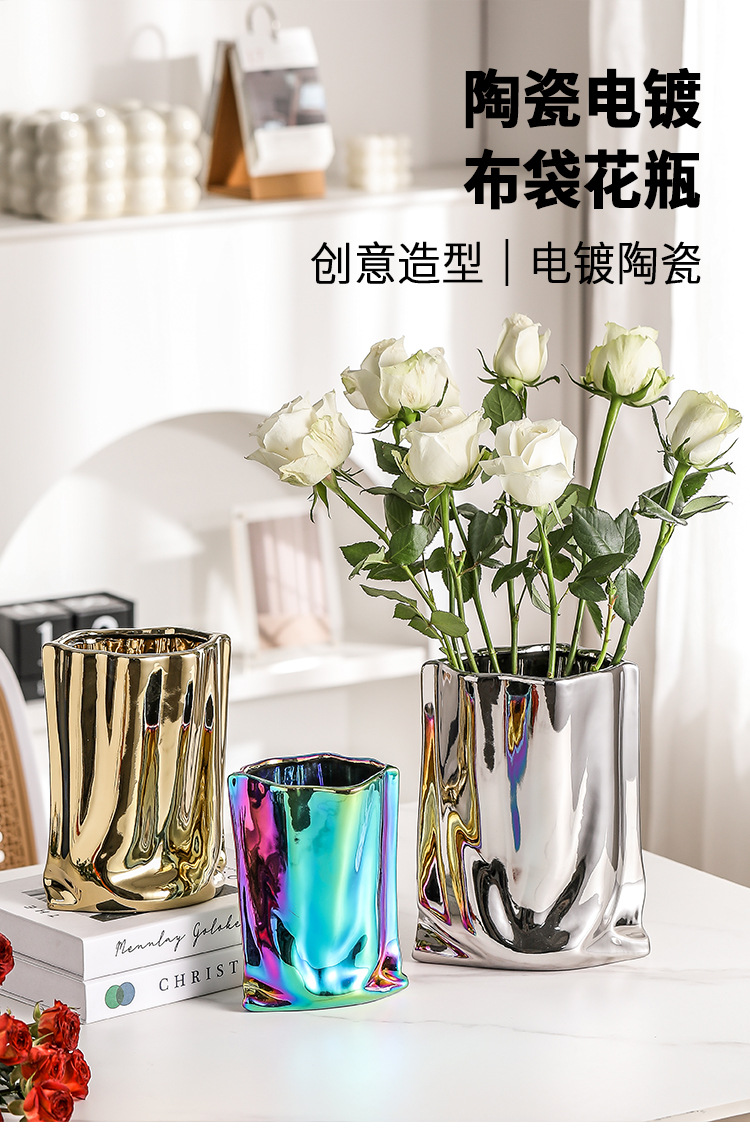 轻奢摆件简约现代陶瓷褶皱电镀花瓶水培水养鲜花干花客厅插花装饰