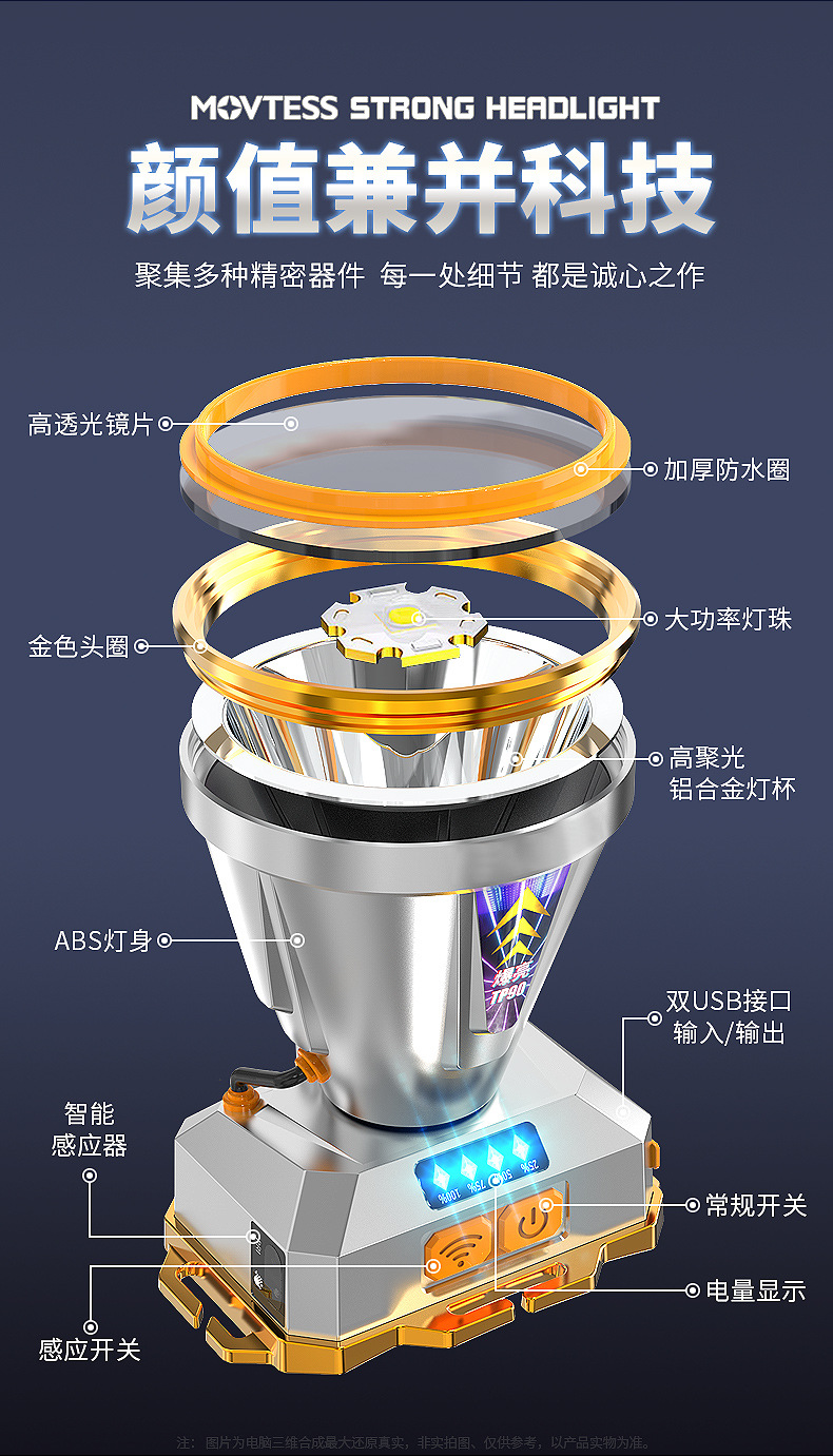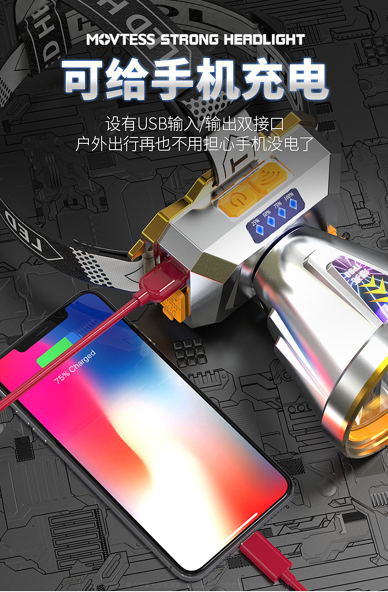 跨境新款LED大功率强光可充电头灯爆亮感应电显远射户外钓鱼头灯