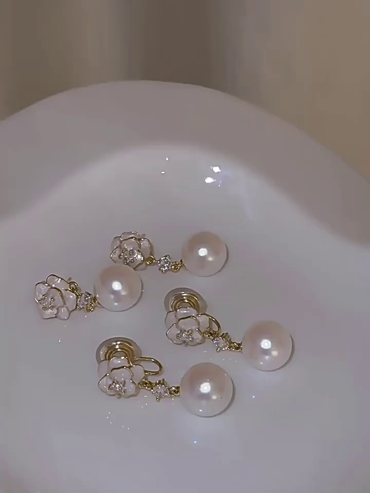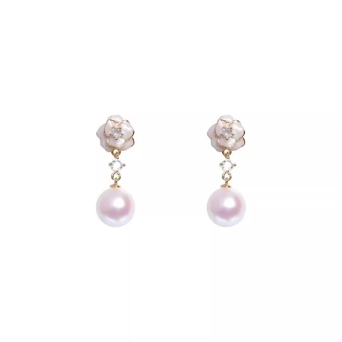 饰品甜美气质山茶花耳钉百搭气质珍珠耳饰春夏温柔小香风花朵耳环