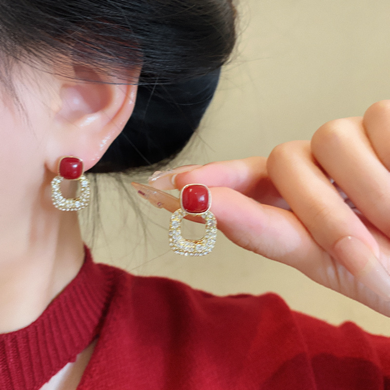 轻奢小众超闪镶钻几何形耳环女百搭气质安可拉红方形耳钉耳饰批发