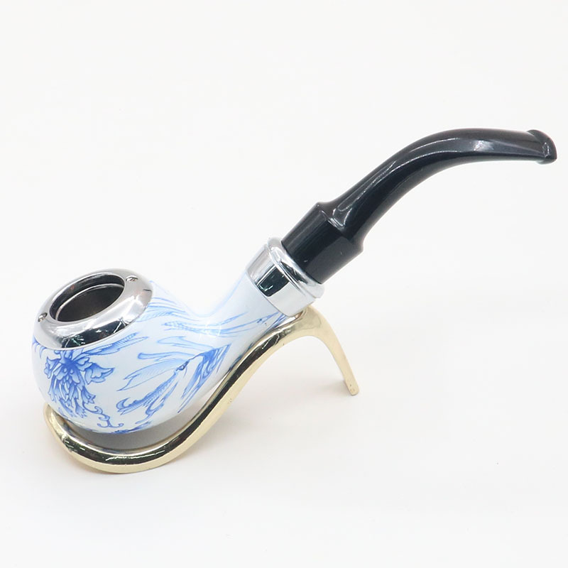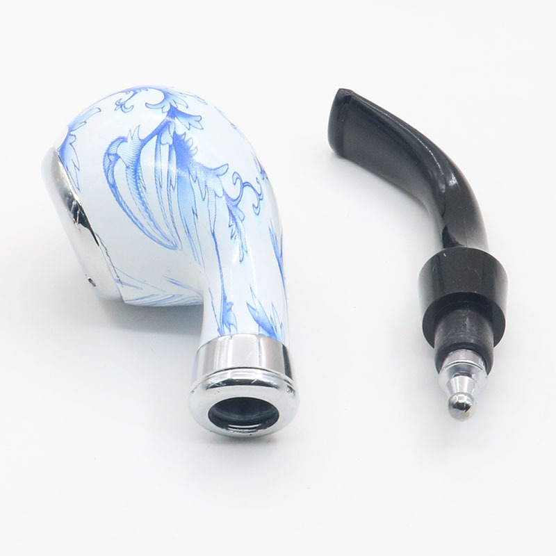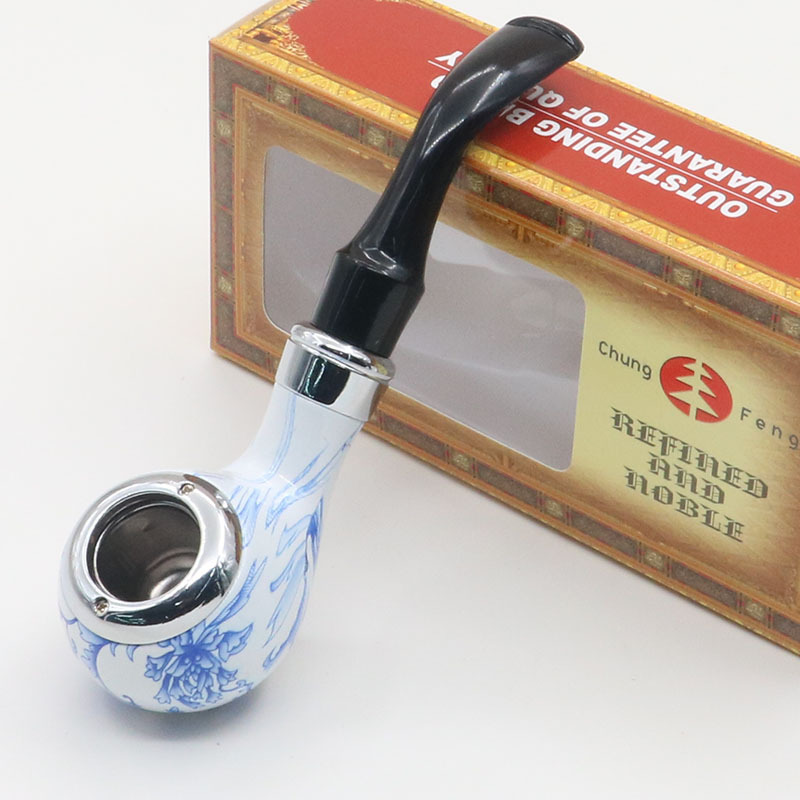 现货中国风椭圆青花瓷色胶木烟斗 经典弯式旱烟斗 带盒铁锅烟丝斗