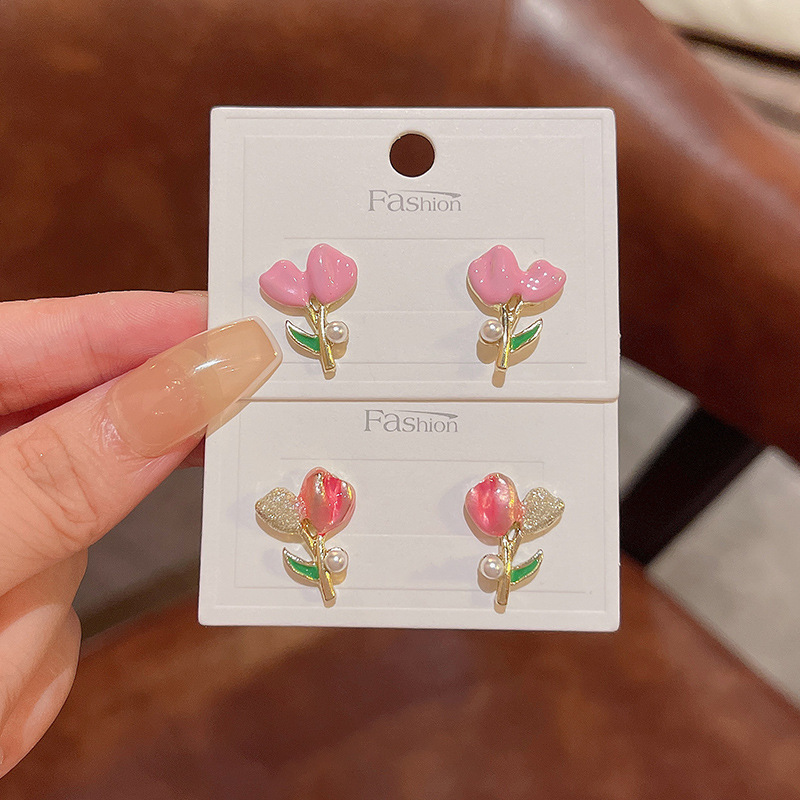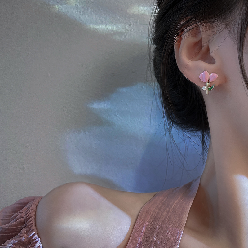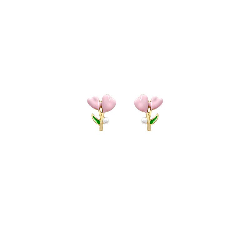 小清新可爱粉色滴油郁金香耳环女S925银针夏季爆款花朵耳钉耳饰品