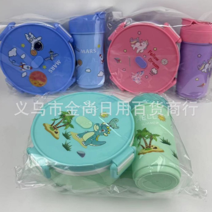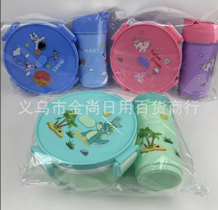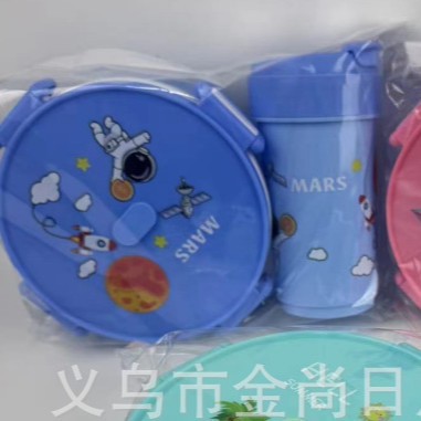 新款卡通印花正方饭盒水壶套装便携分格便当盒水杯配叉勺儿童餐盒