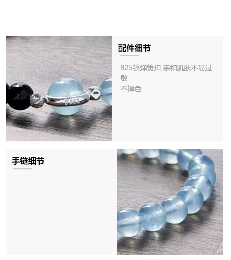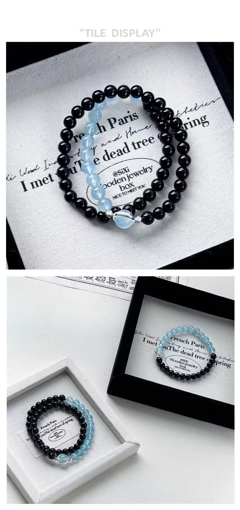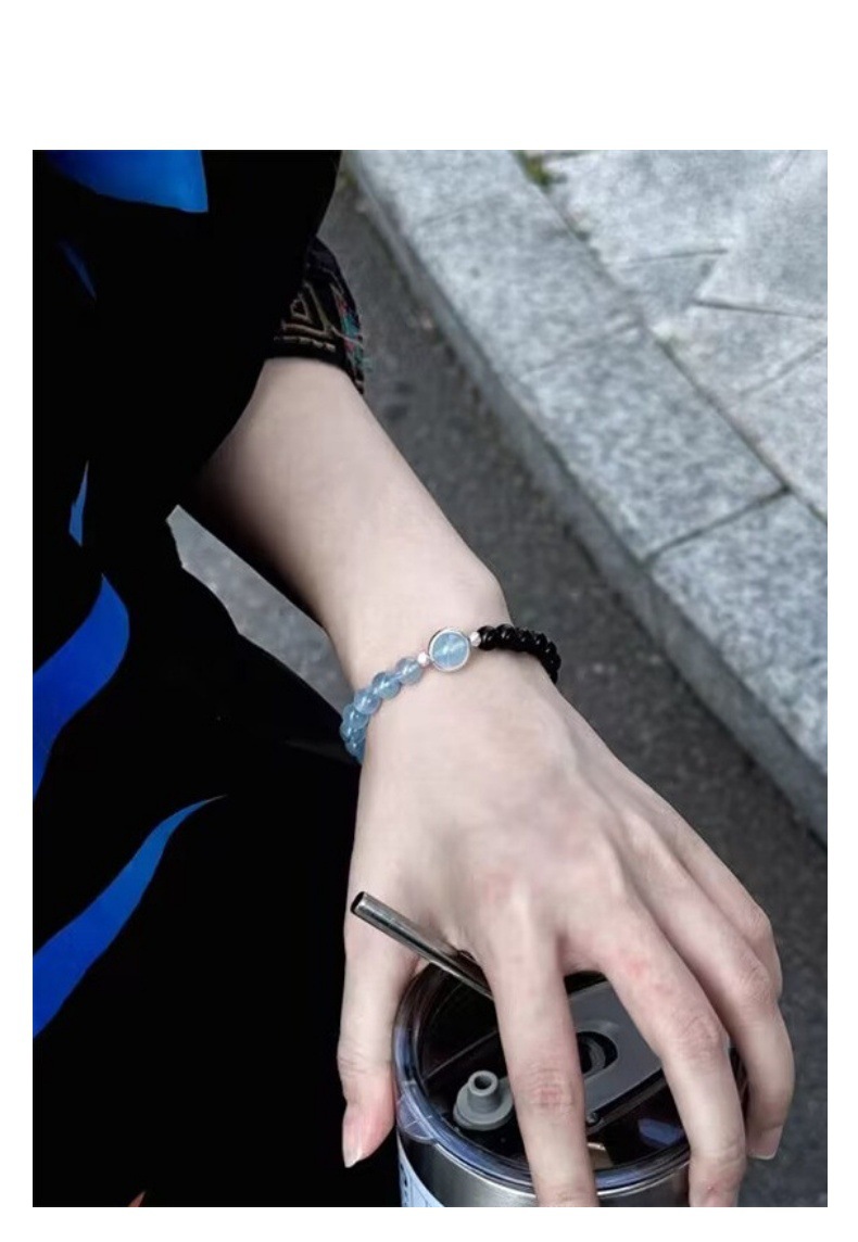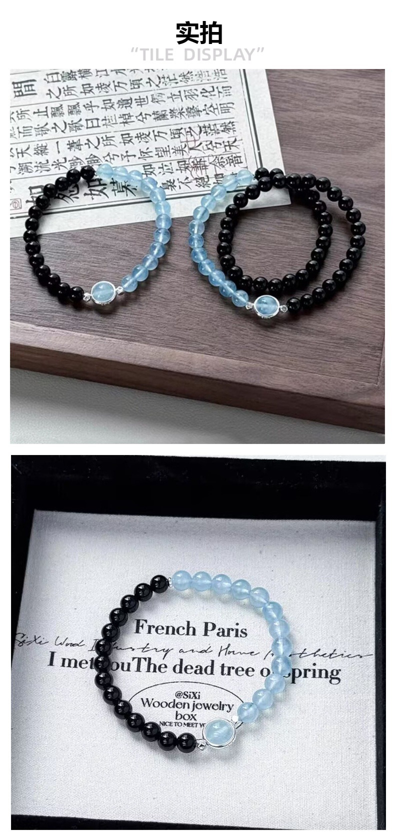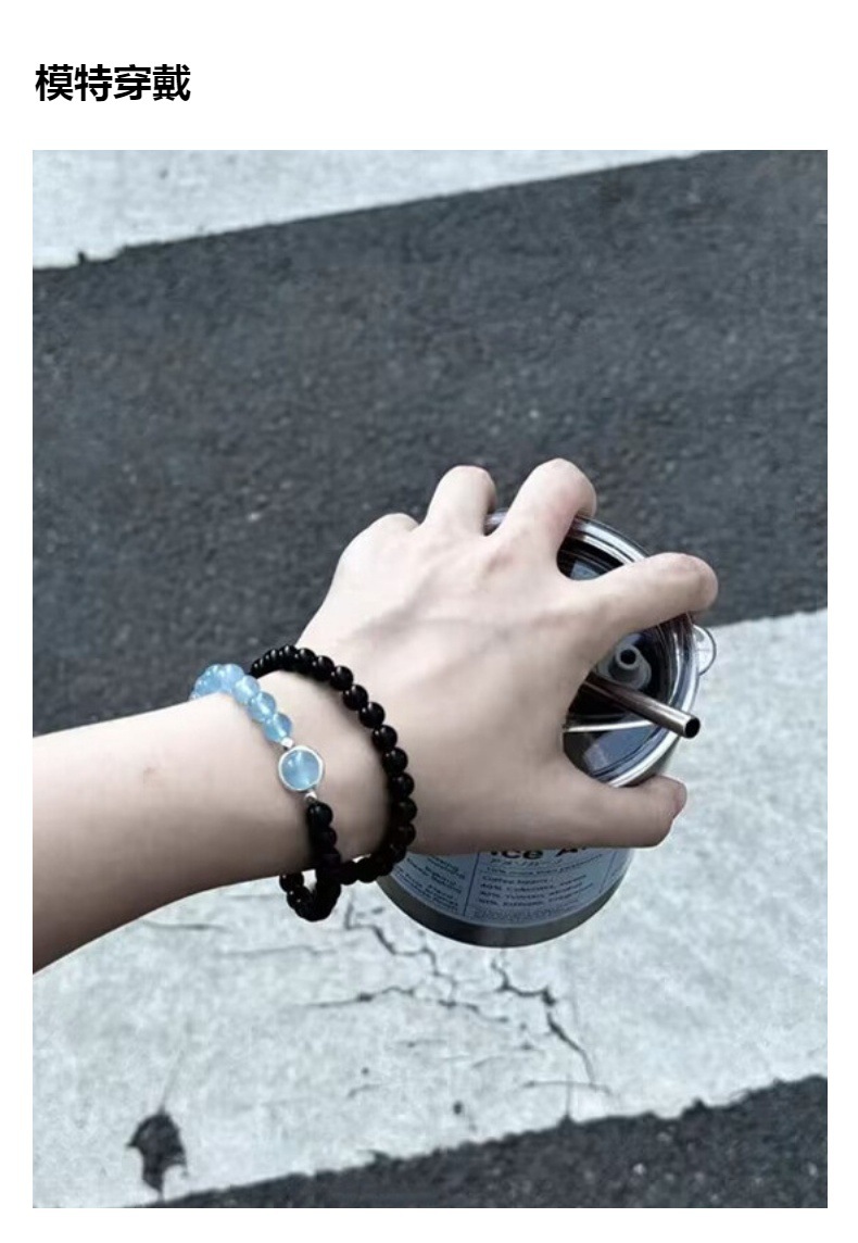 黑曜石双圈手串天然海蓝宝s925纯银手链小众闺蜜礼物