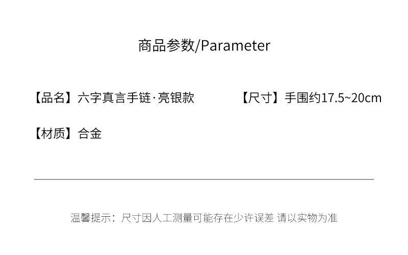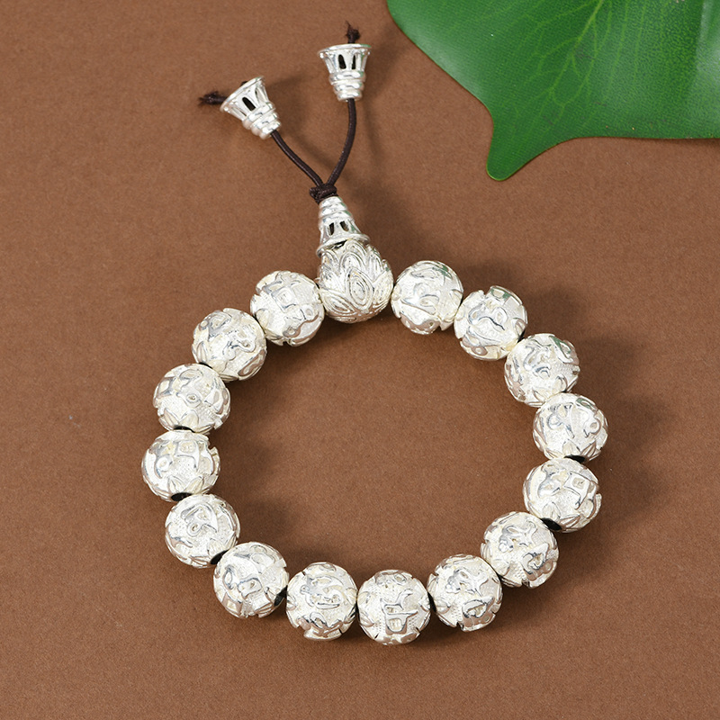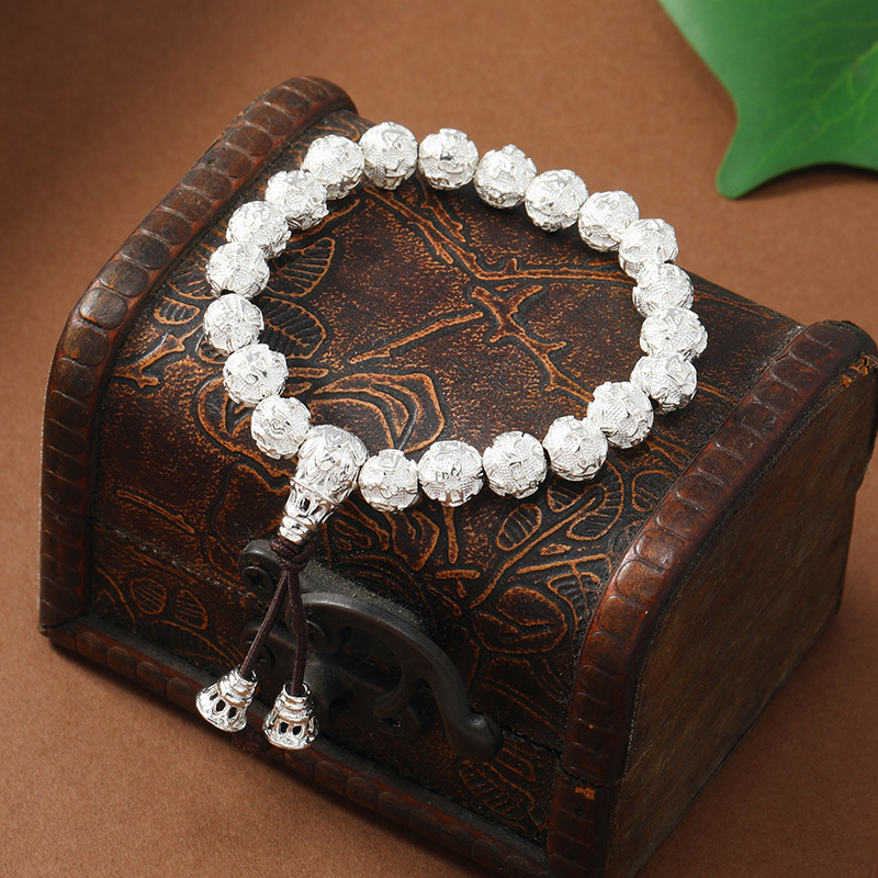 藏式六字真言梵文银色手链男女念珠复古莲花圆珠手串佛珠文玩配饰