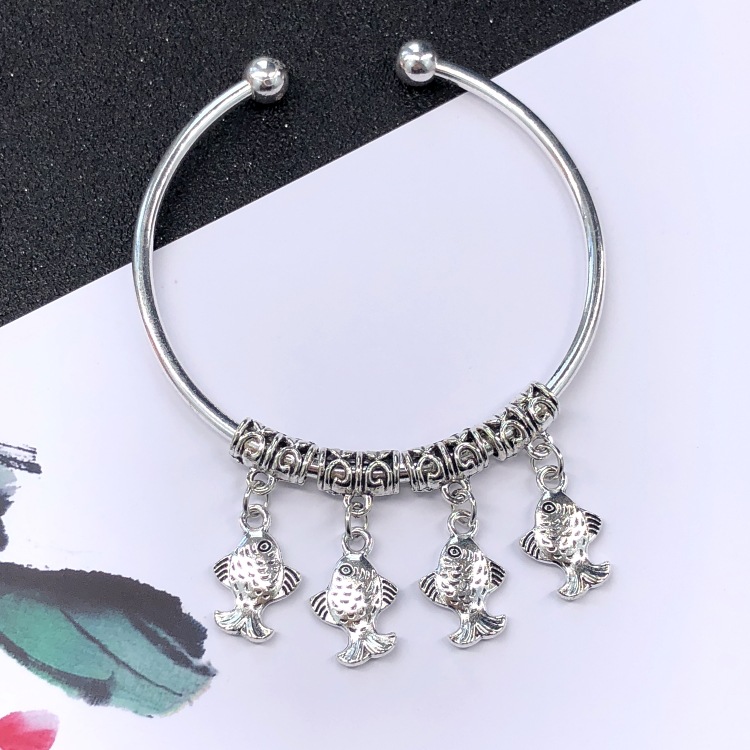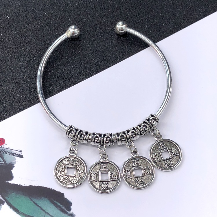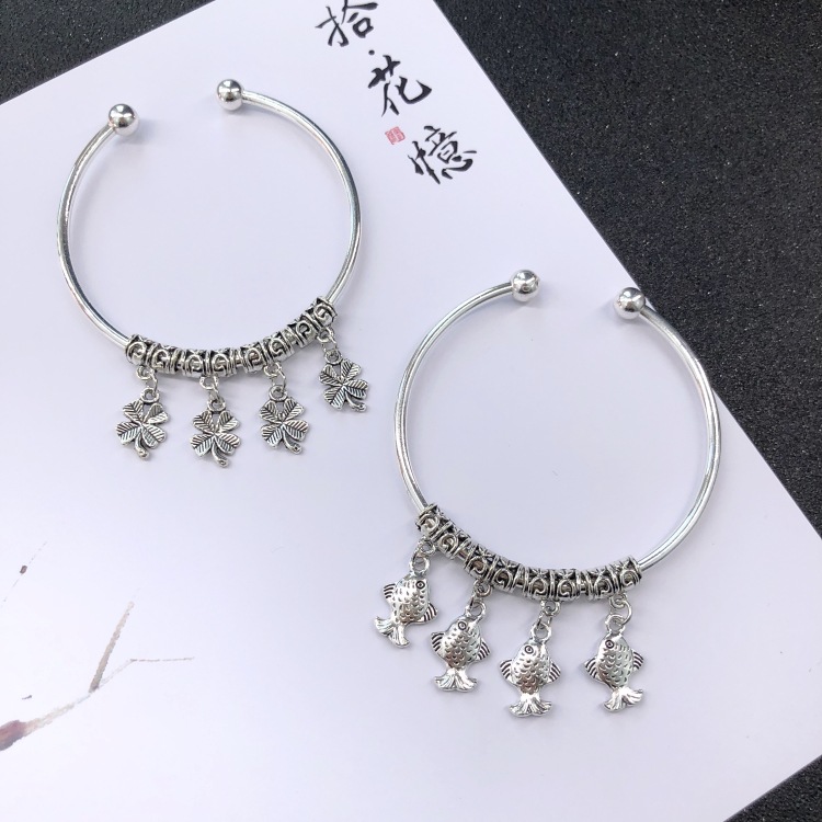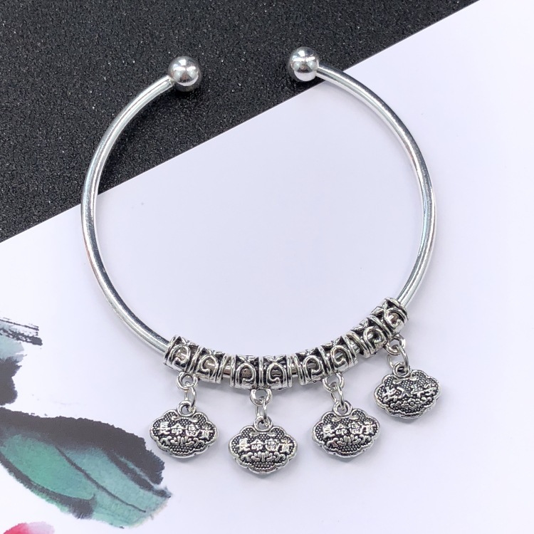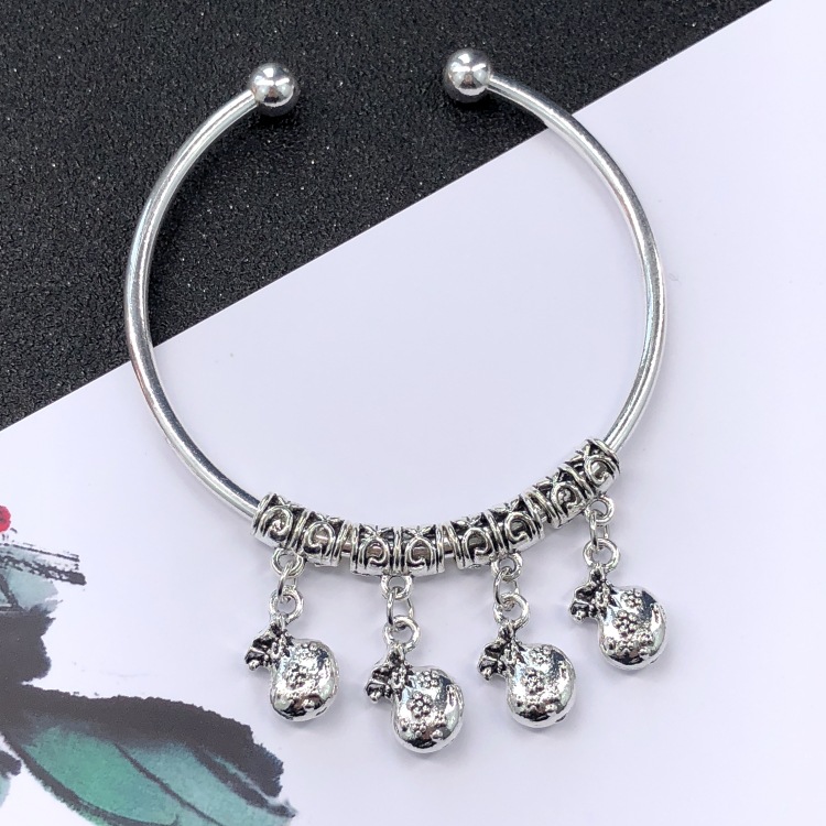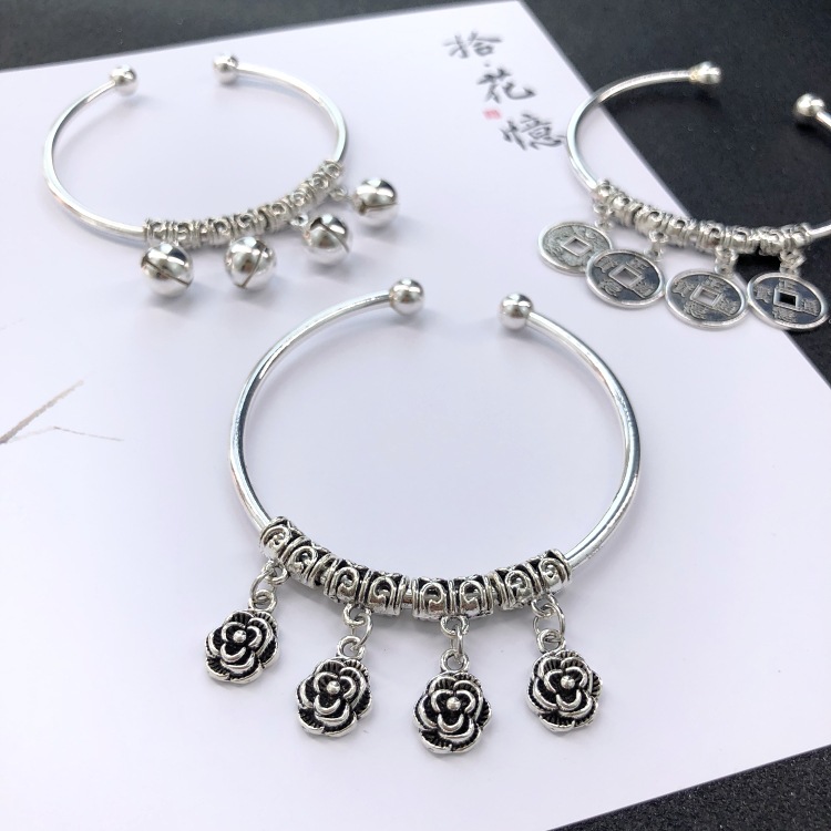 复古民族风藏银手镯女百搭时尚铃铛花朵吊坠可调节古风镯子配饰品