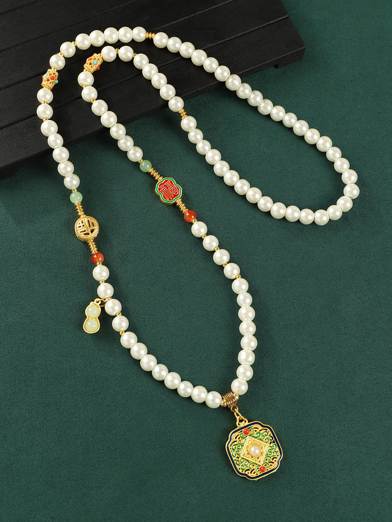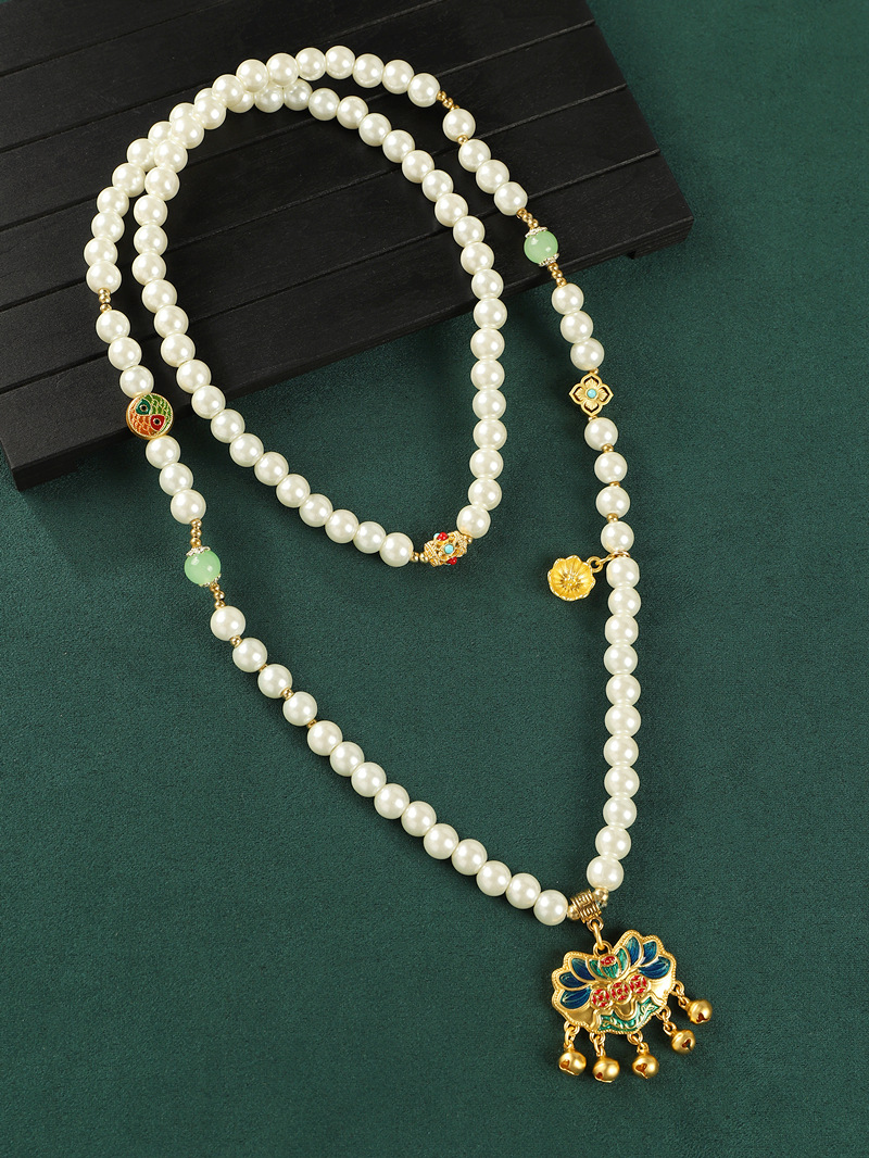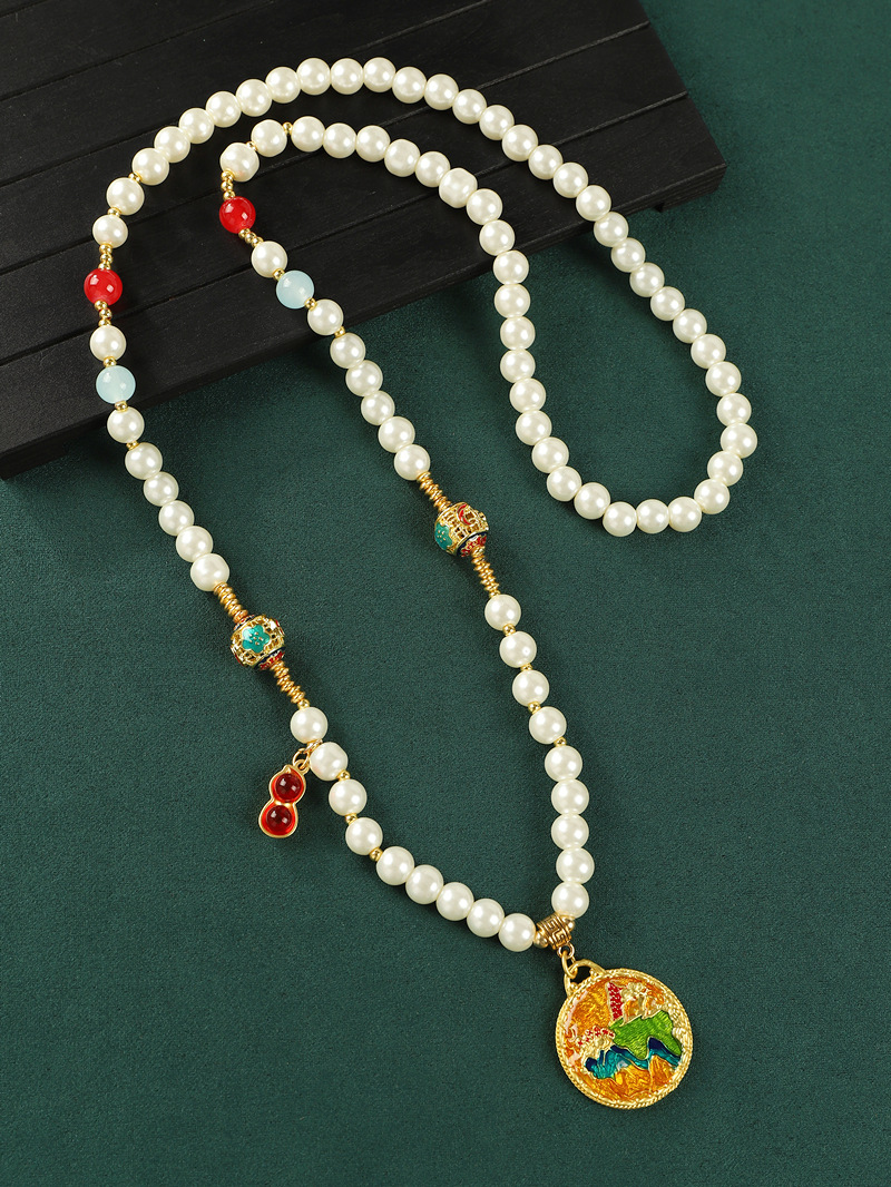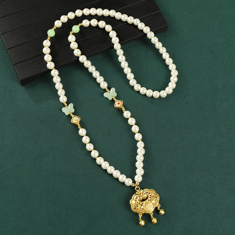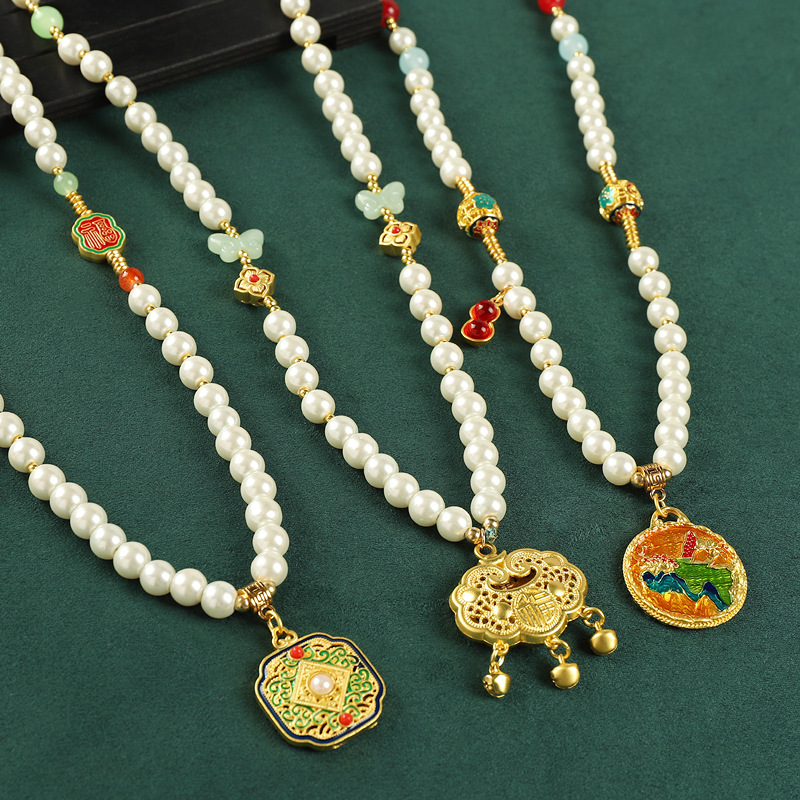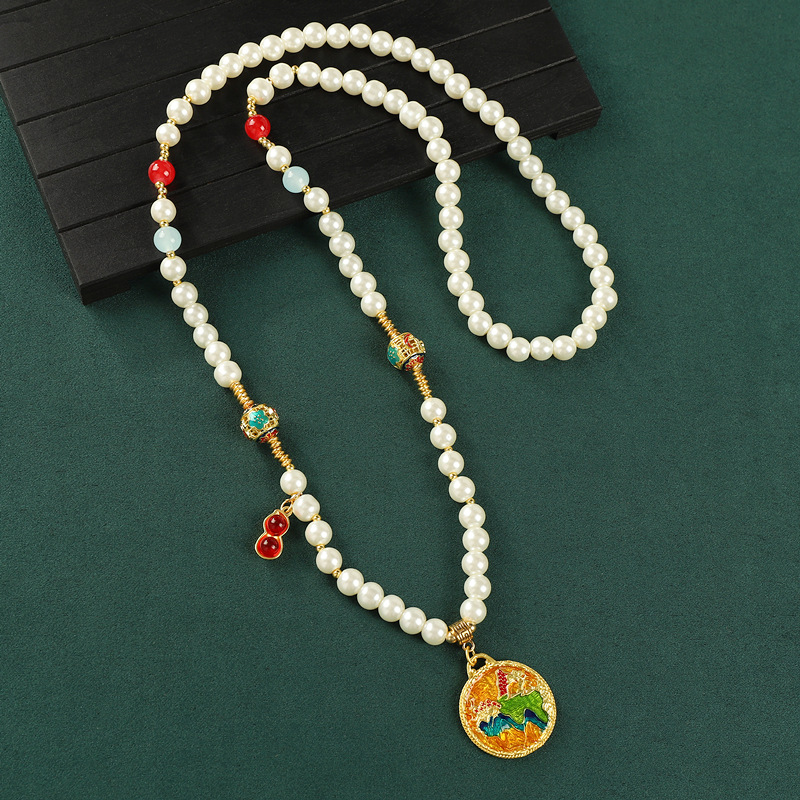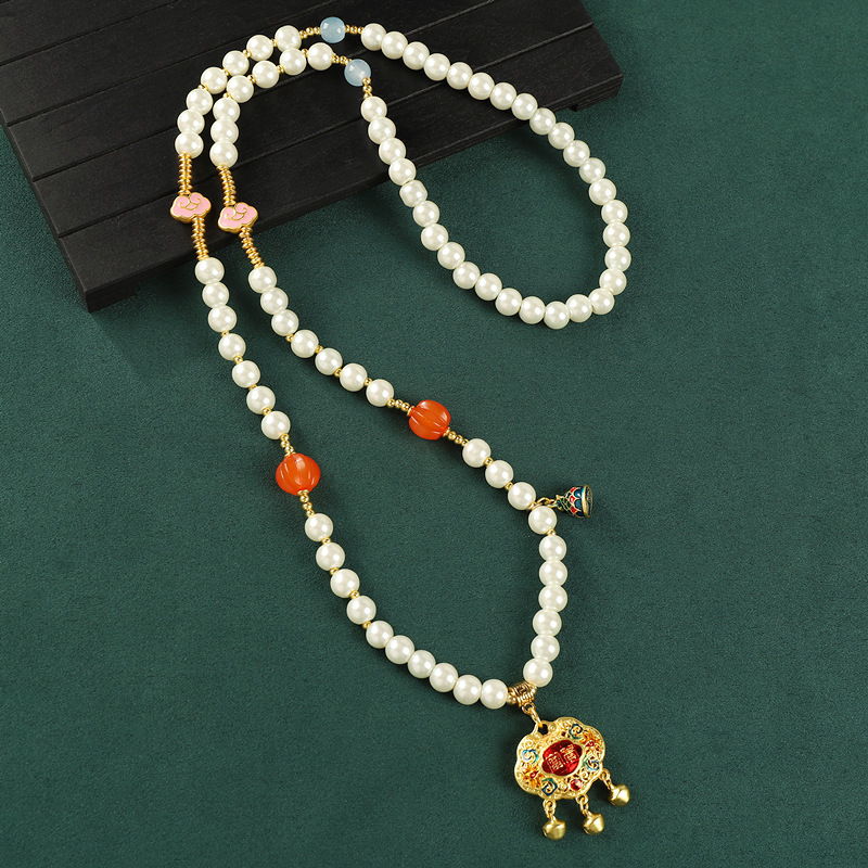原创新中式珍珠长款项链古法沙金吊坠女国风高级感毛衣链复古配饰