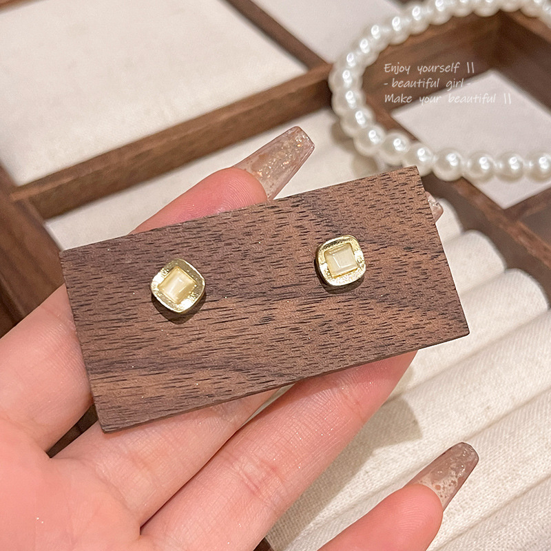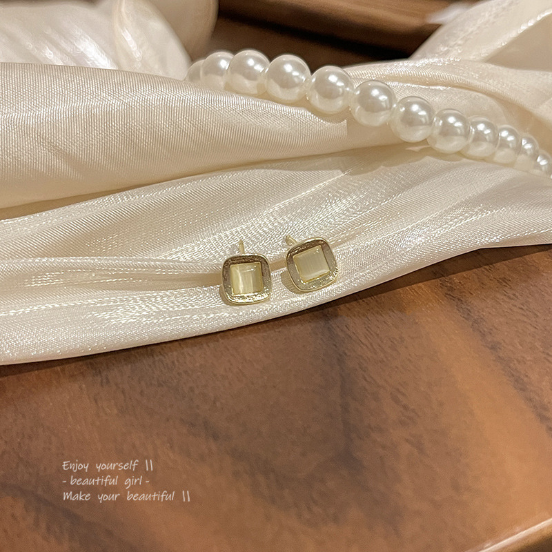 S925银针简约气质几何形猫眼石耳钉女ins潮百搭气质方形耳环耳饰