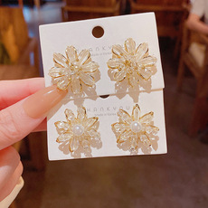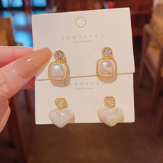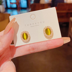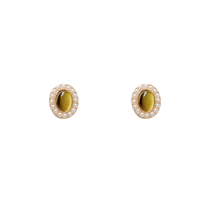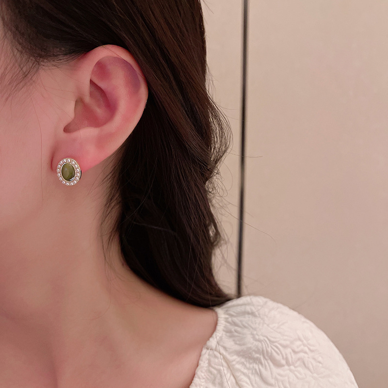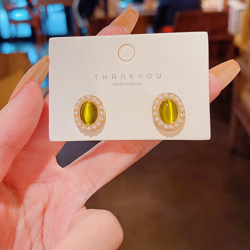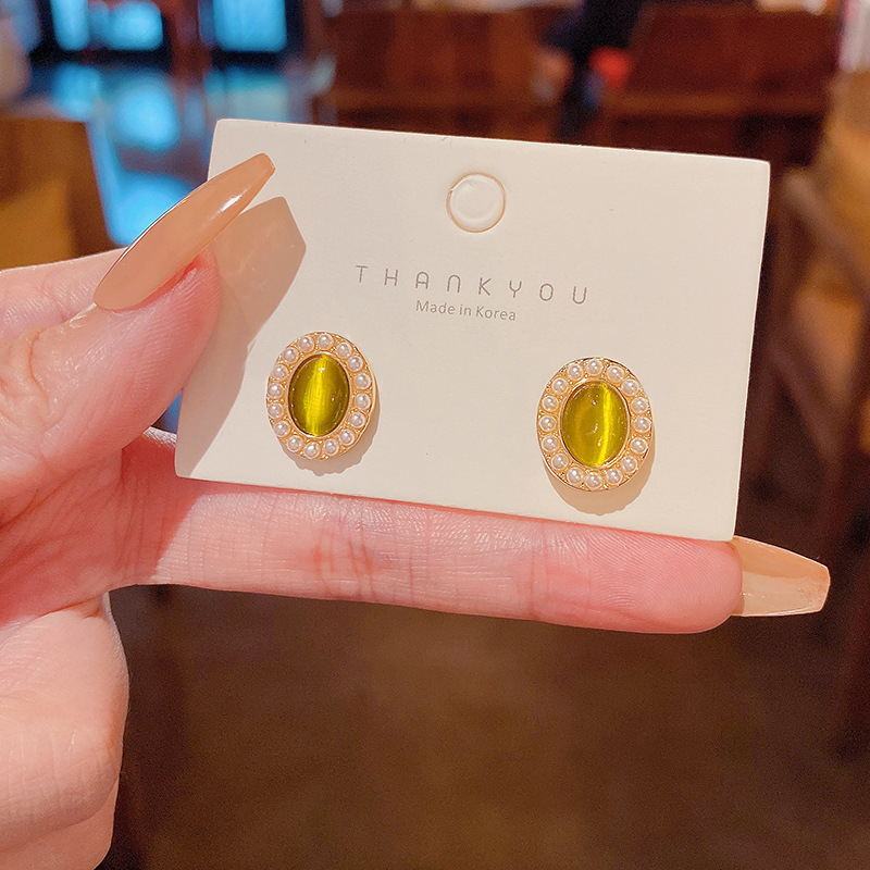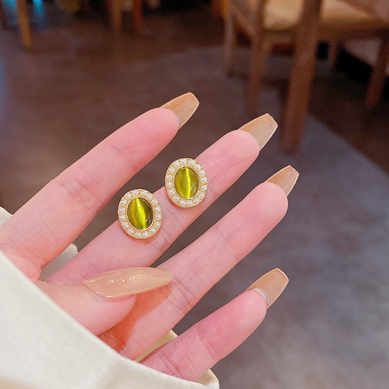 S925银针法式复古猫眼石珍珠耳钉女简约气质网红同款耳环高级耳饰