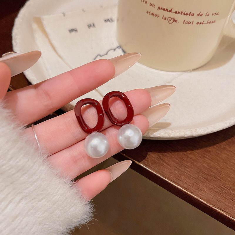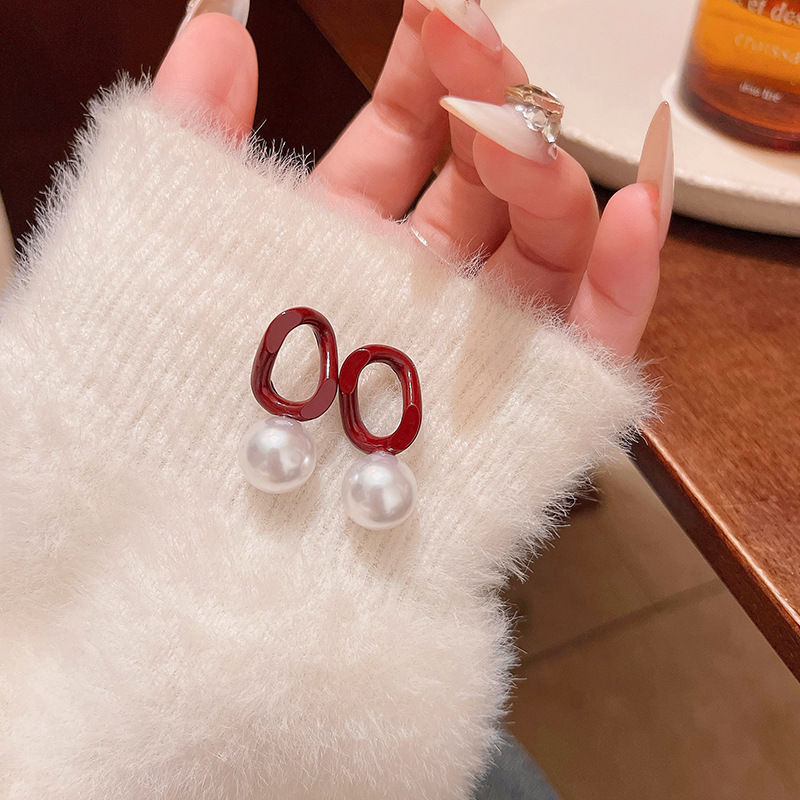 秋冬款安可拉红几何形耳环女甜美气质网红同款珍珠耳钉耳饰品批发