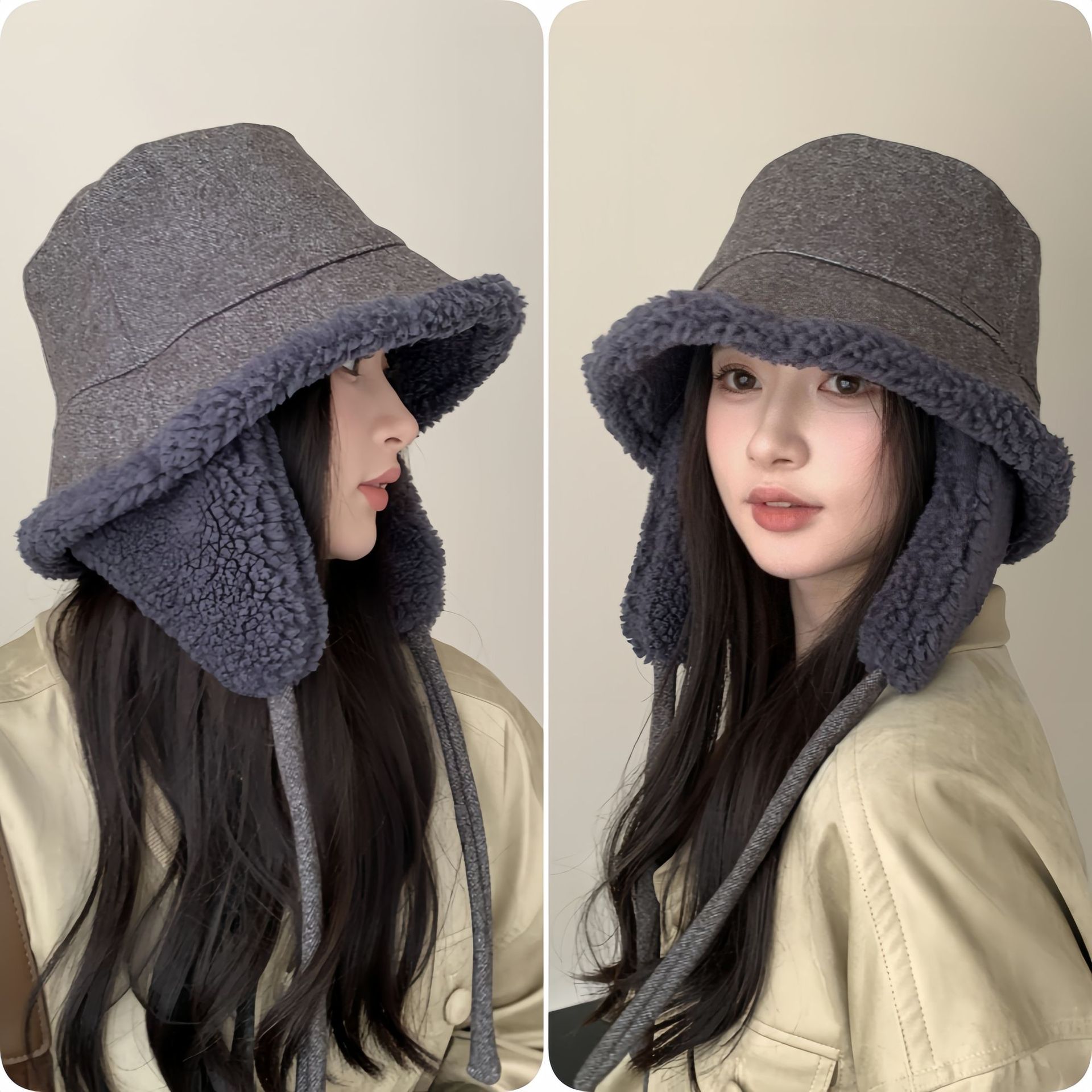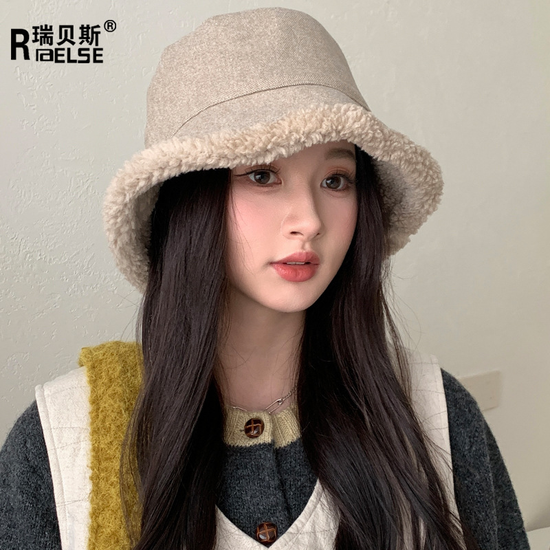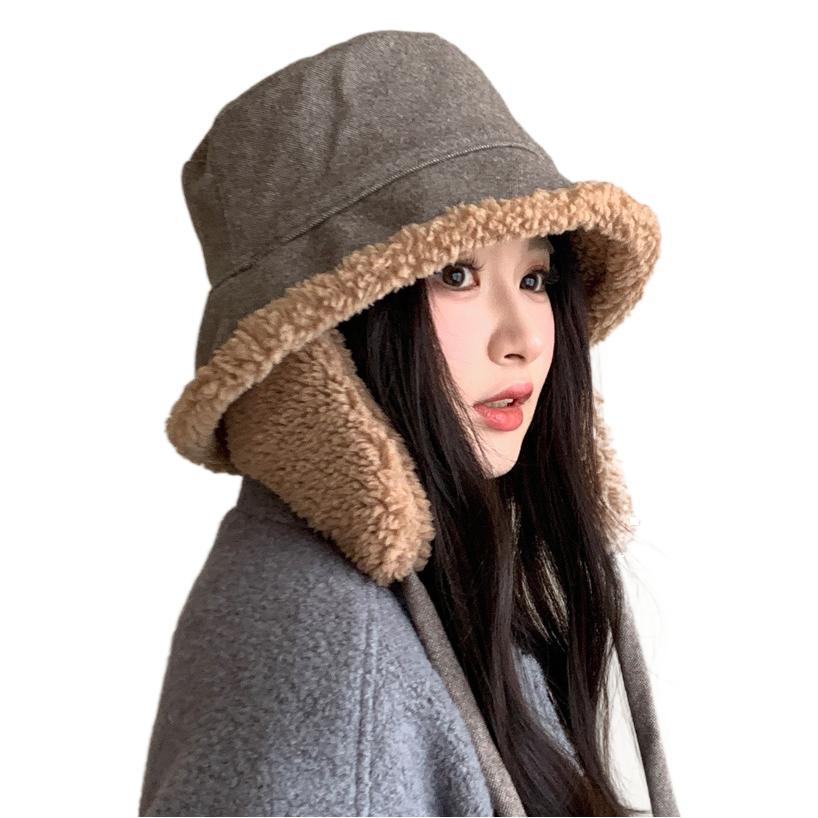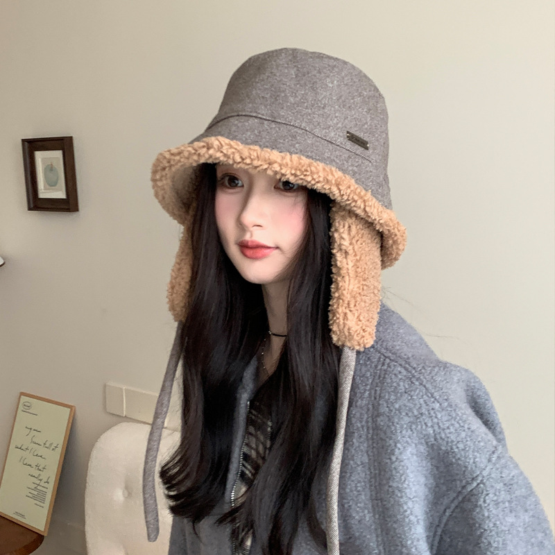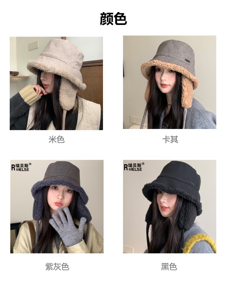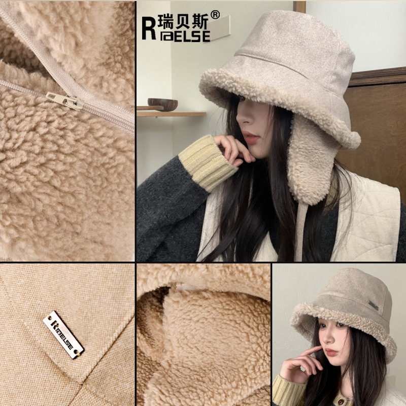 秋冬季新款双面羊羔绒渔夫帽女骑车护耳保暖帽子时尚百搭绑带盆帽