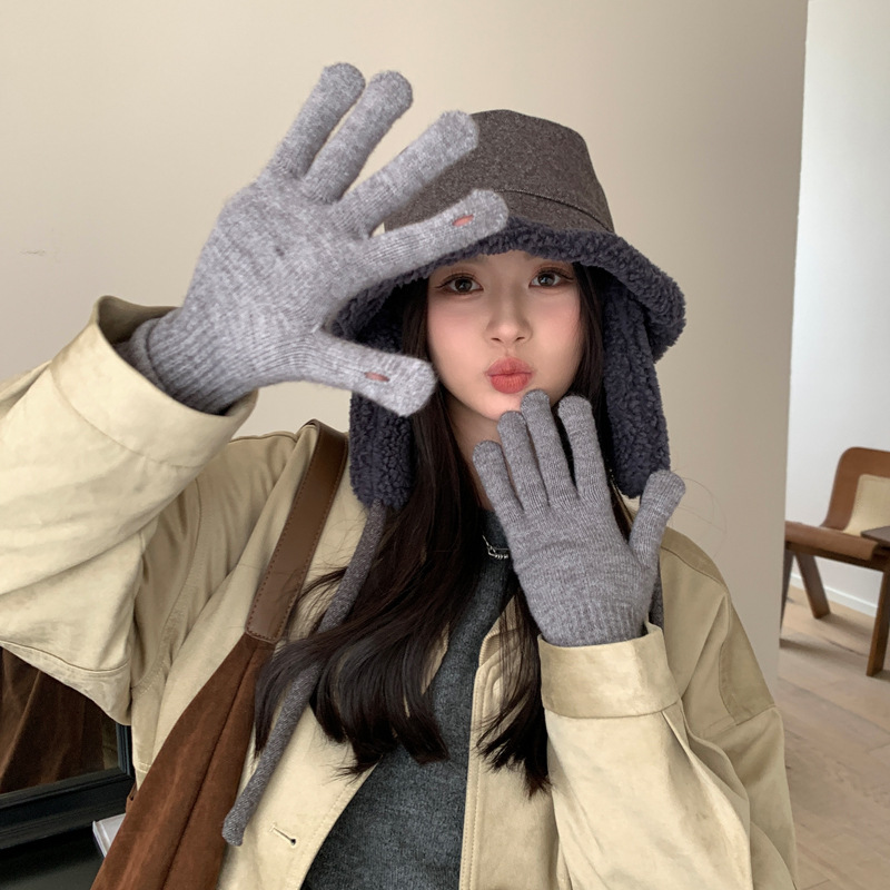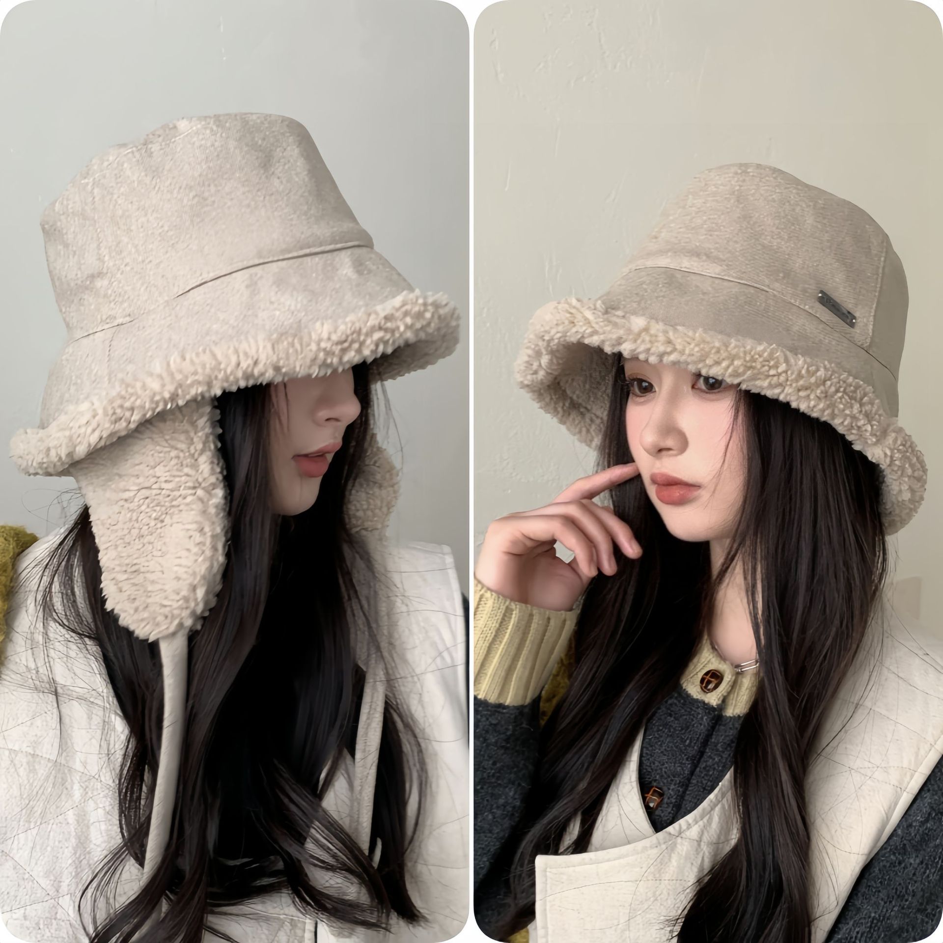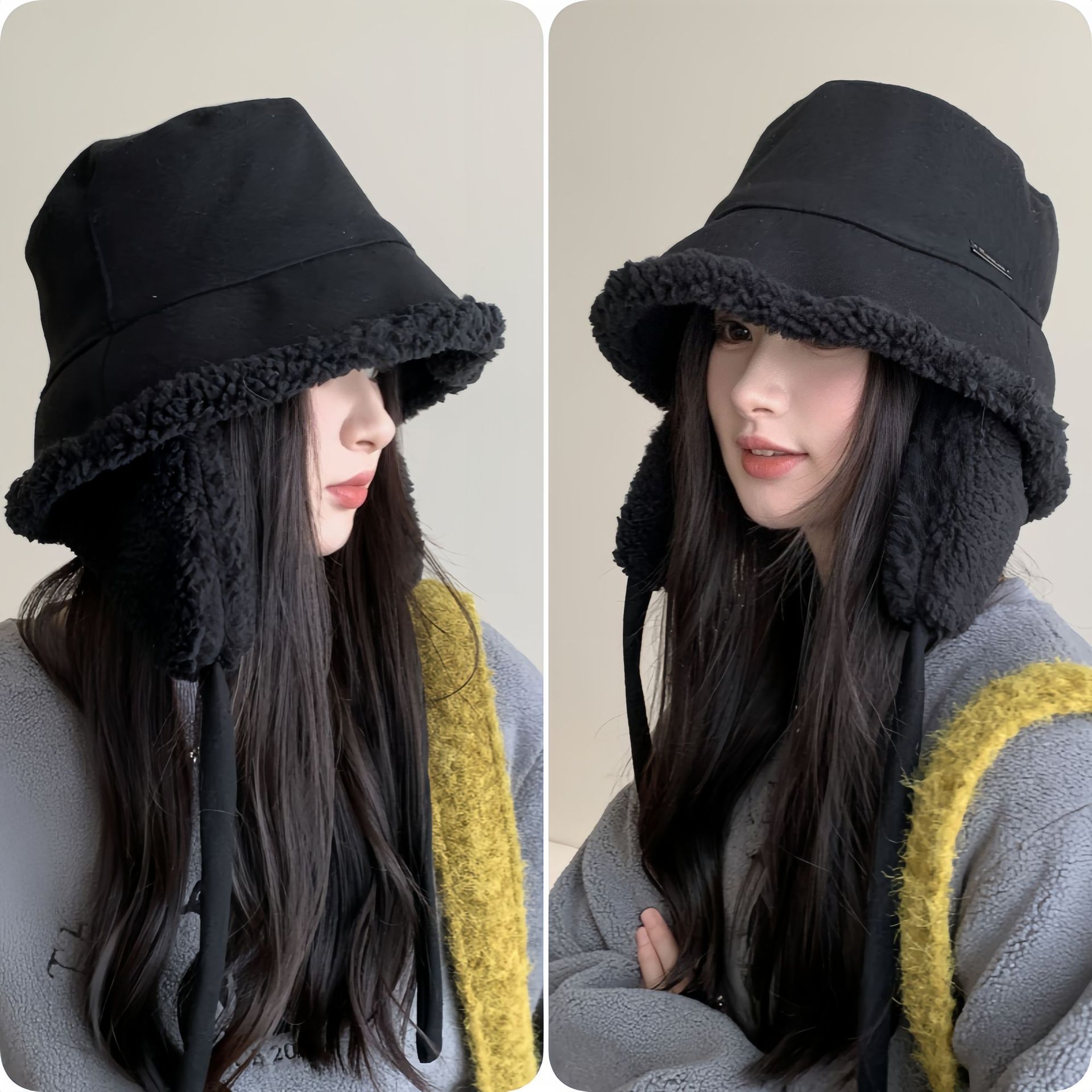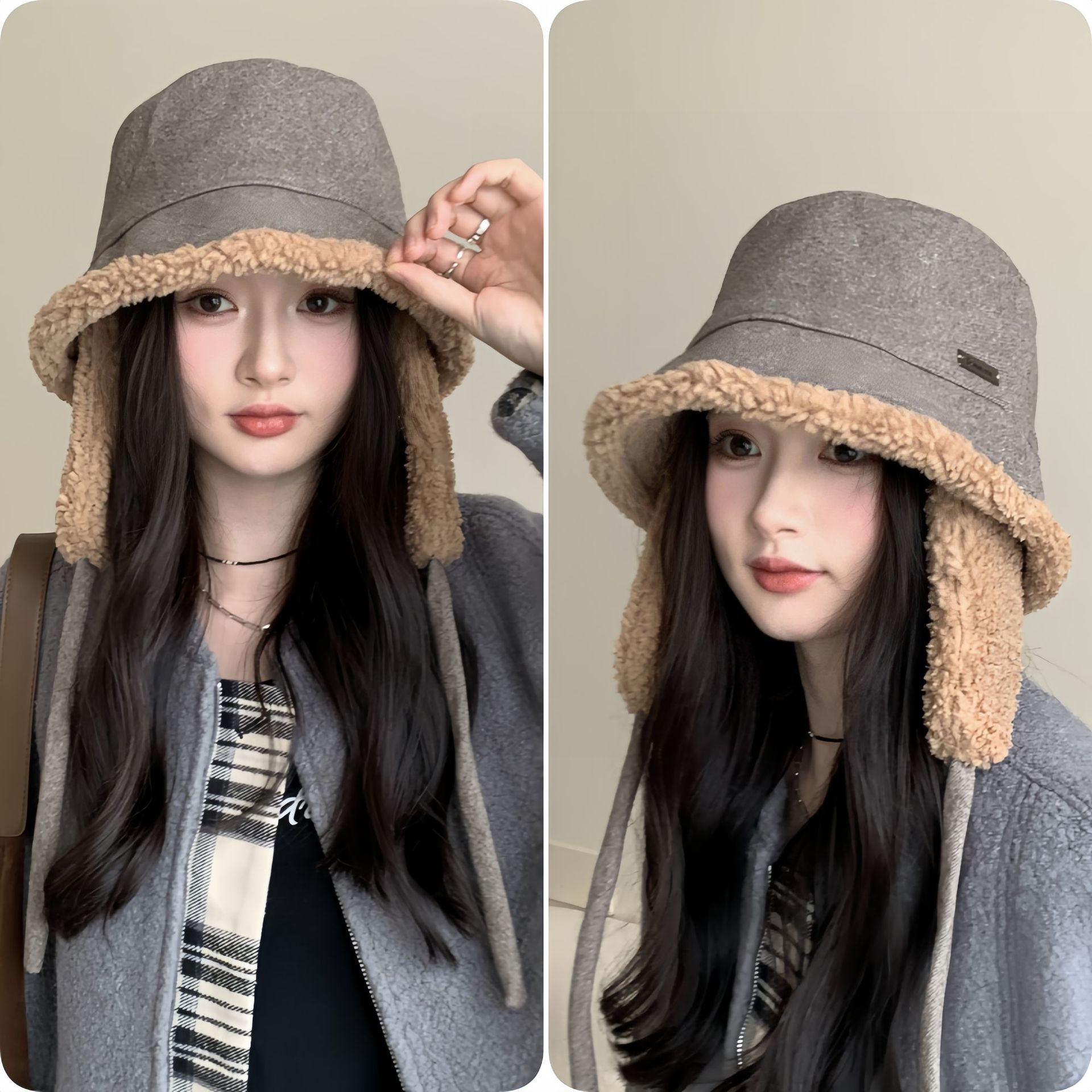 秋冬季新款双面羊羔绒渔夫帽女骑车护耳保暖帽子时尚百搭绑带盆帽