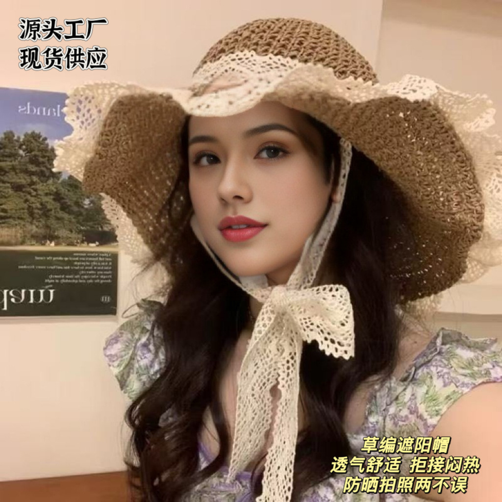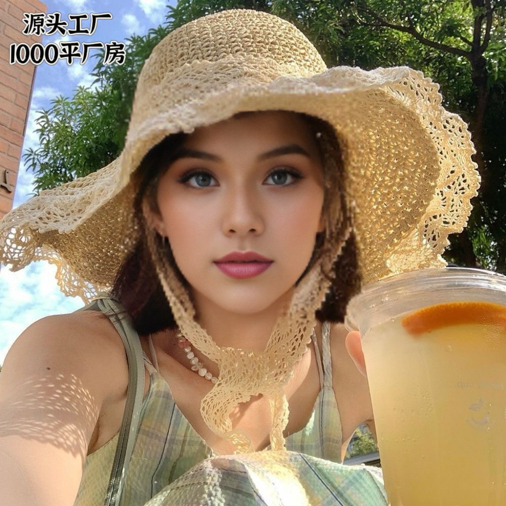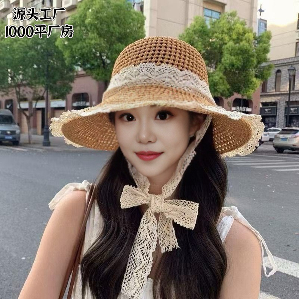 春夏款蕾丝花边渔夫帽可折叠镂空遮阳帽户外便携防晒帽韩版太阳帽